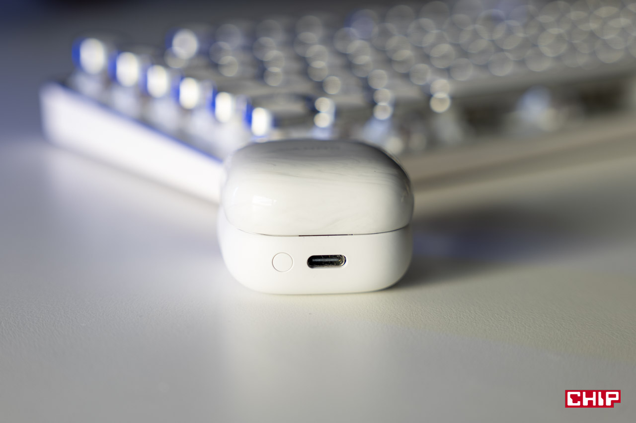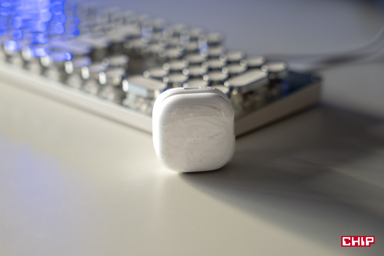 Pod względem funkcjonalności obudowa prezentuje się dość zwyczajnie. Na tylnej ściance znajdziemy port USB-C oraz przycisk do sterowania (cieszy mnie, że Sony porzuciło system parowania polegający na naciskaniu słuchawek jednocześnie). Na etui składają się dwie części – górną wykonano z błyszczącego, a dolną z matowego tworzywa sztucznego. Na górnej nie zauważyłem na razie żadnych rys, choć te są pewnie kwestią czasu. Na dolnej potrafią się znaleźć za to odbarwienia – jeśli macie spodnie puszczające farbę, lepiej nie chować w nich słuchawek, bo całość zostaje dość widoczna i może zaschnąć w nieprzyjemny dla oka sposób.