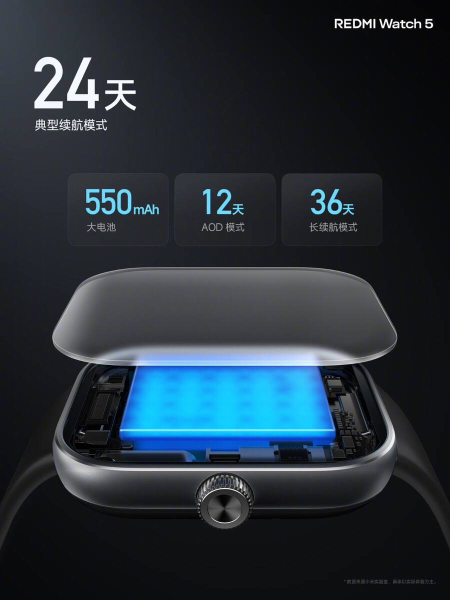 Redmi Watch 5 dostał też znacznie pojemniejszą baterię 550 mAh, która zapewnia do 24 dni pracy przy typowym użytkowaniu w wersji Bluetooth. Wariant eSIM jest mniej żywotny, bo przy typowym korzystaniu z zegarka, bateria wystarcza na jakieś 12 dni. Tutaj warto też wspomnieć, że wariant eSIM obsługuje również samodzielne połączenia, wiadomości i 25 godzin ciągłej funkcjonalności krótkofalówki.
