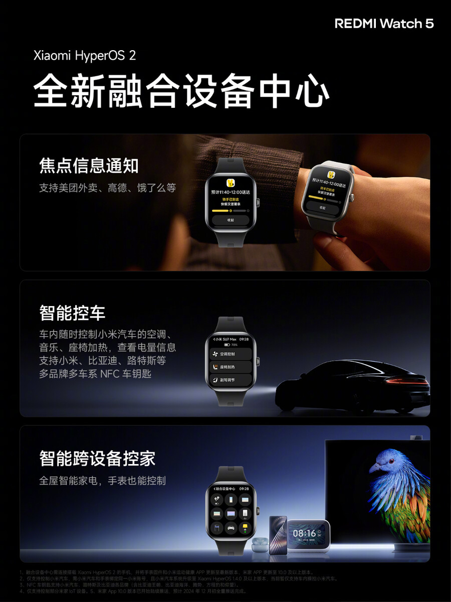 Smartwatch obsługuje ponad 150 trybów sportowych, w tym aktywności na świeżym powietrzu, a w precyzyjnym śledzeniu pomaga niezależne pozycjonowanie GNSS. Nie brakuje również funkcji skupionych na monitorowaniu zdrowia. Redmi Watch 5 oferuje 24-godzinny pomiar tętna, śledzenie SpO2, zarządzanie stresem i analizę snu, zasilane przez samodzielnie opracowane algorytmy. Ponadto nowy chip AFE zapewnia lepszą dokładność pomiaru tętna. Sporo nowości wprowadza HyperOS 2, który zapewnia bezproblemowe działanie zegarka, obsługując aplikacje innych firm, a także dając dostęp do takich funkcji, jak inteligentne sterowanie domem, powiadomienia o skupieniu i inteligentne zarządzanie pojazdami. Nie zabrakło NFC do płatności czy usprawnionej łączności z wieloma urządzeniami.