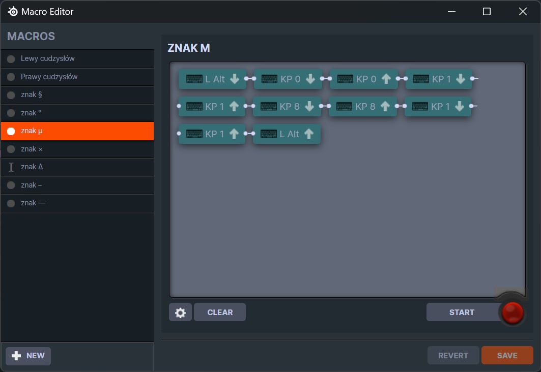Poradziłem sobie, podpinając na chwilę pełnowymiarową klawiaturę – wystukałem, co trzeba, wyłączyłem opóźnienia, opisałem i wszystko działa. Znak Unicode Δ, którego się nie da wystukać jako Alt+kod w polskiej stronie kodowej, zdefiniowałem jako makro tekstowe i przypisałem do nieużywanego klawisza RWin, a raczej do przedefiniowanego SteelSeries. Czy przeciętny użytkownik spotka się z takim problemem? Niekoniecznie.
