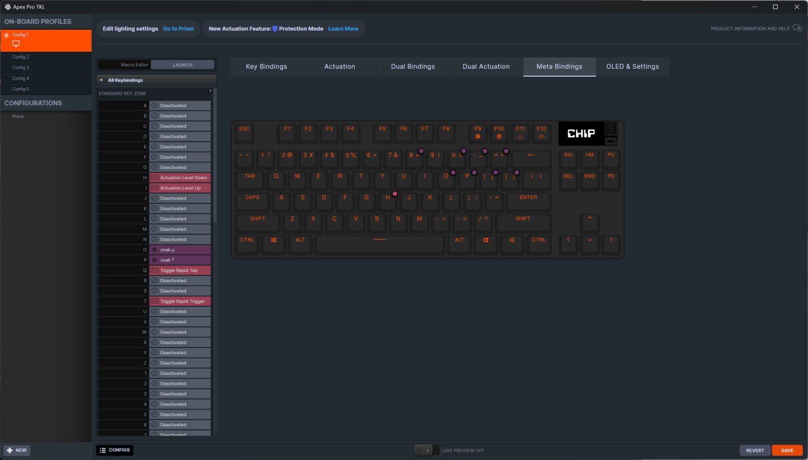 Klawiatury Razera pozwalają przypisać do dodatkowej warstwy (zwanej tam Hypershift) dowolny znak lub sekwencję i takie rozwiązanie jest oczywiście najwygodniejsze, choć wymaga stale uruchomionego w systemie oprogramowania Synapse. SteelSeries niestety na to nie pozwala – do warstwy Meta Bindings można przypisać wyłącznie sekwencje klawiszowe, musiałem zatem sięgnąć po takie samo rozwiązanie, jak w pracującej w systemie QMK klawiatury Keychron V1, czyli programowanie sekwencji Alt+kod.
