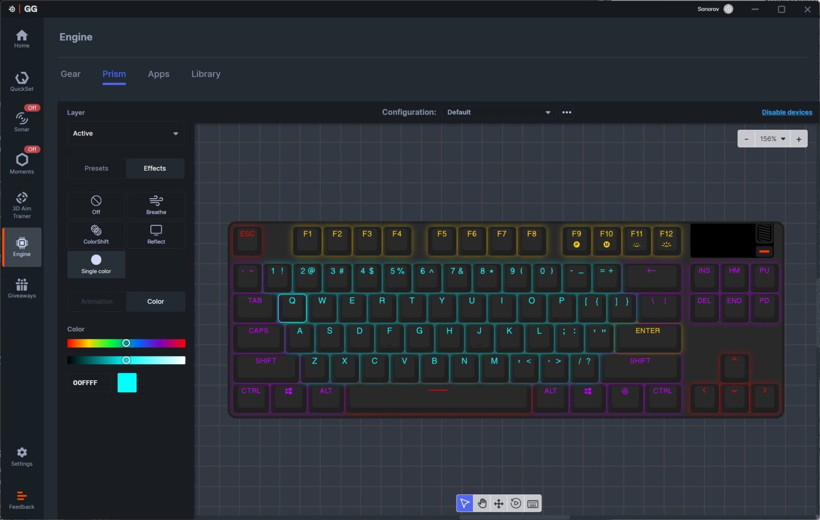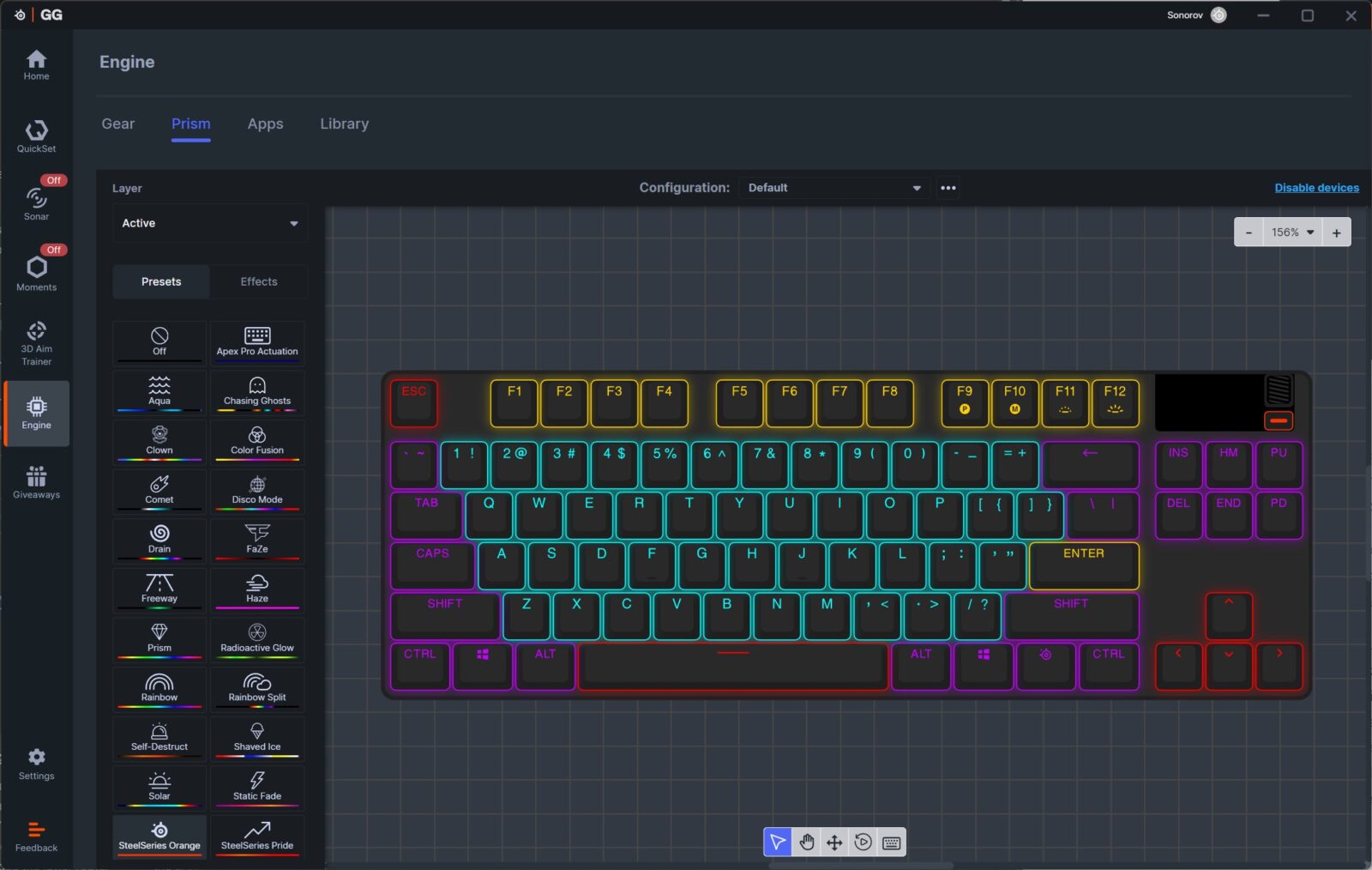 Oprogramowanie wymagane jest także do ustawienia i działania niestandardowego podświetlenia. Służy do tego moduł Prism, wyglądający jak większość edytorów do programowania kombinacji RGB. Dostępna jest lista presetów i efektów, można je łączyć i mieszać ze sobą. Całość działa od strony programowej zadowalająco.