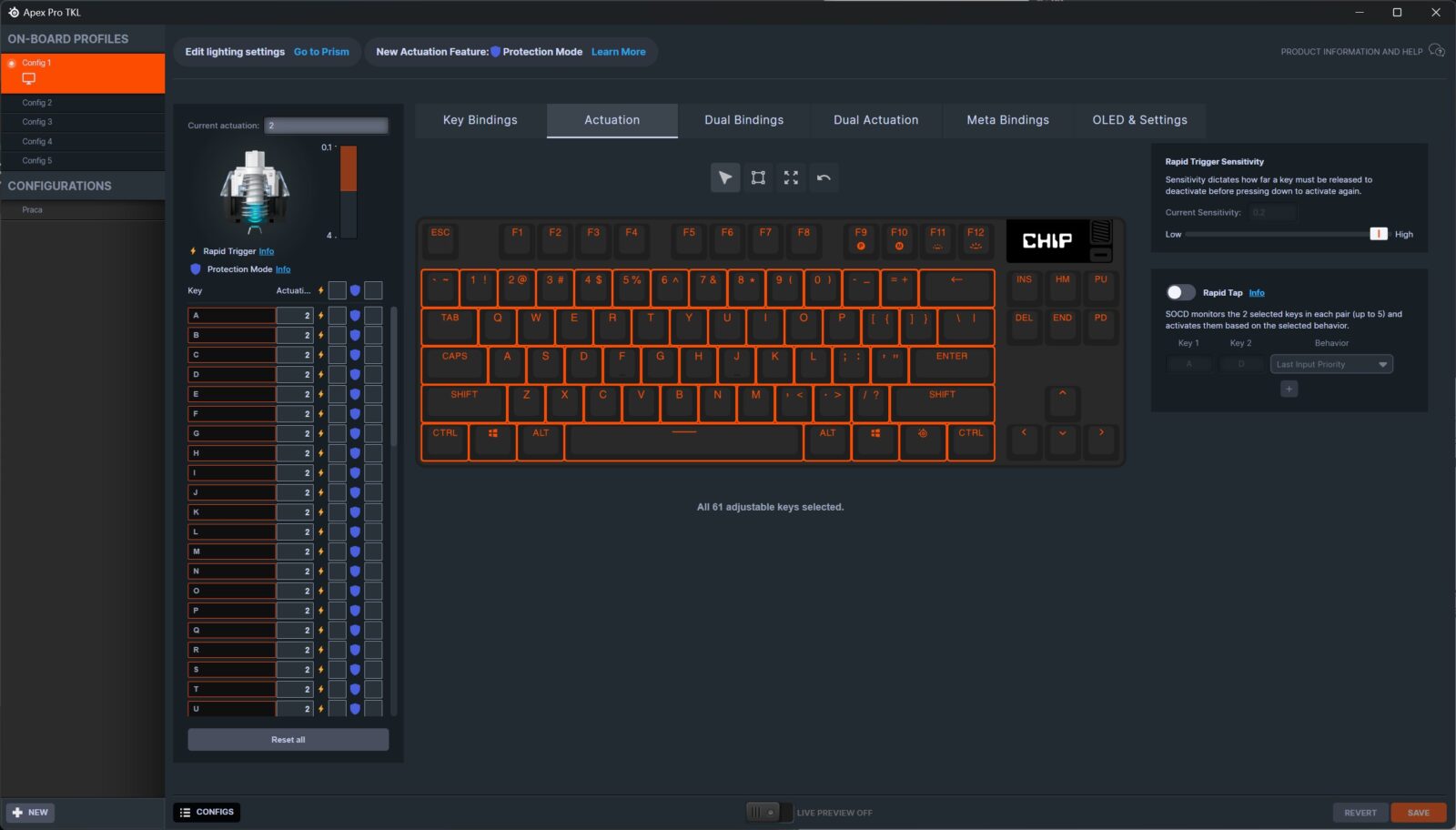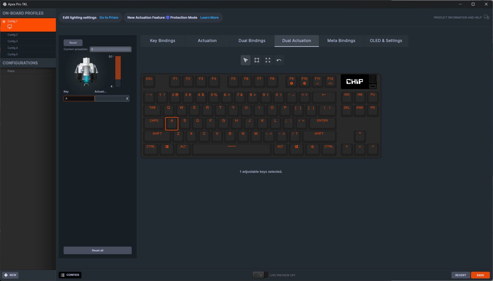 Z mojego punktu widzenia najważniejsze jest jednak to, co odnosi się bezpośrednio do klawiatury. Manualne ustawienie punktu aktywacji przełącznika, włączenie automatycznego dostrajania tego parametru (Rapid Trigger) i włączenie trybu ochrony przed przypadkowym naciśnięciem (Protection Mode) – to wszystko zrobimy także wprost z klawiatury, posiłkując się wskazaniami na klawiszach i wskazówkami wyświetlanymi na ekranie OLED. Znacznie wygodniej jednak można to ustawić z pomocą SteelSeries Engine.