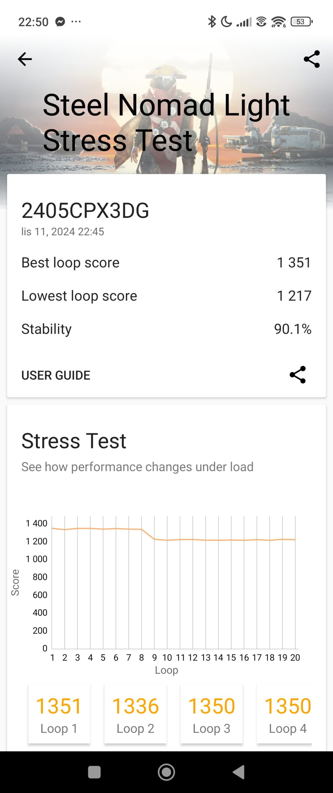 - Steel Nomad Light Stress Test: 1351 / 1217 pkt, stabilność 90,1%