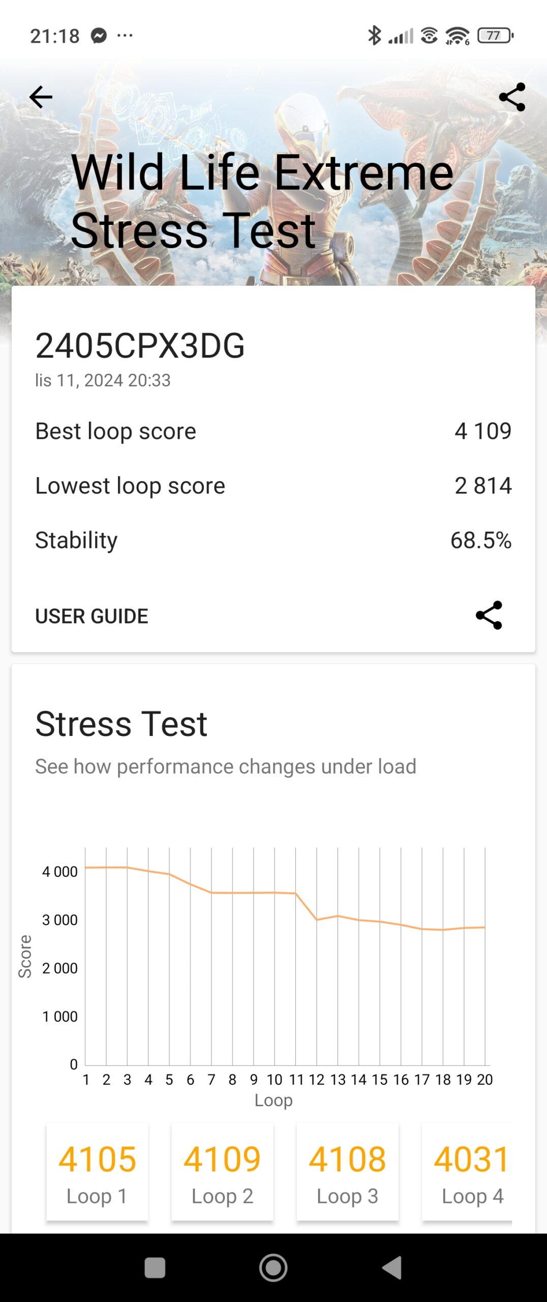- Wild Life Extreme Stress Test: 4109 / 2814 pkt, stabilność 68,5%
