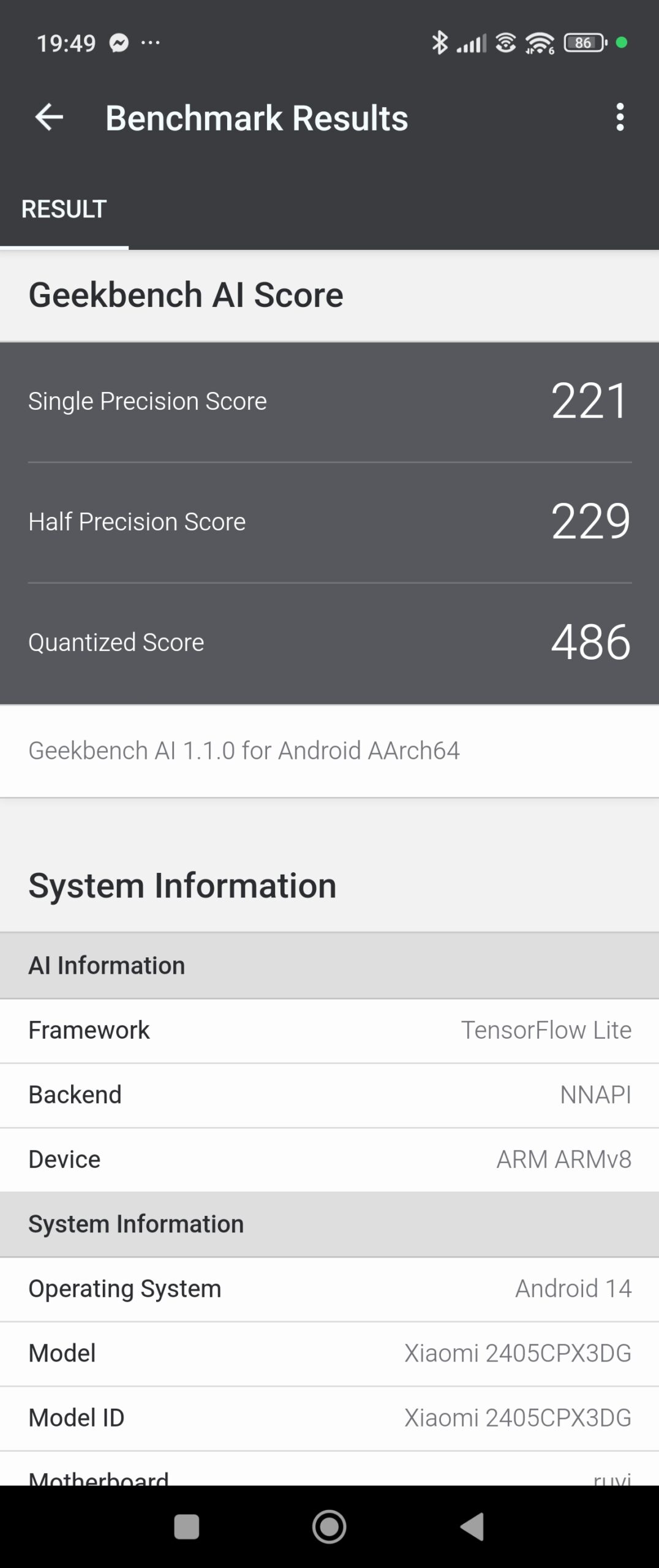 - Geekbench AI NNAPI: 221 / 229 / 486 pkt