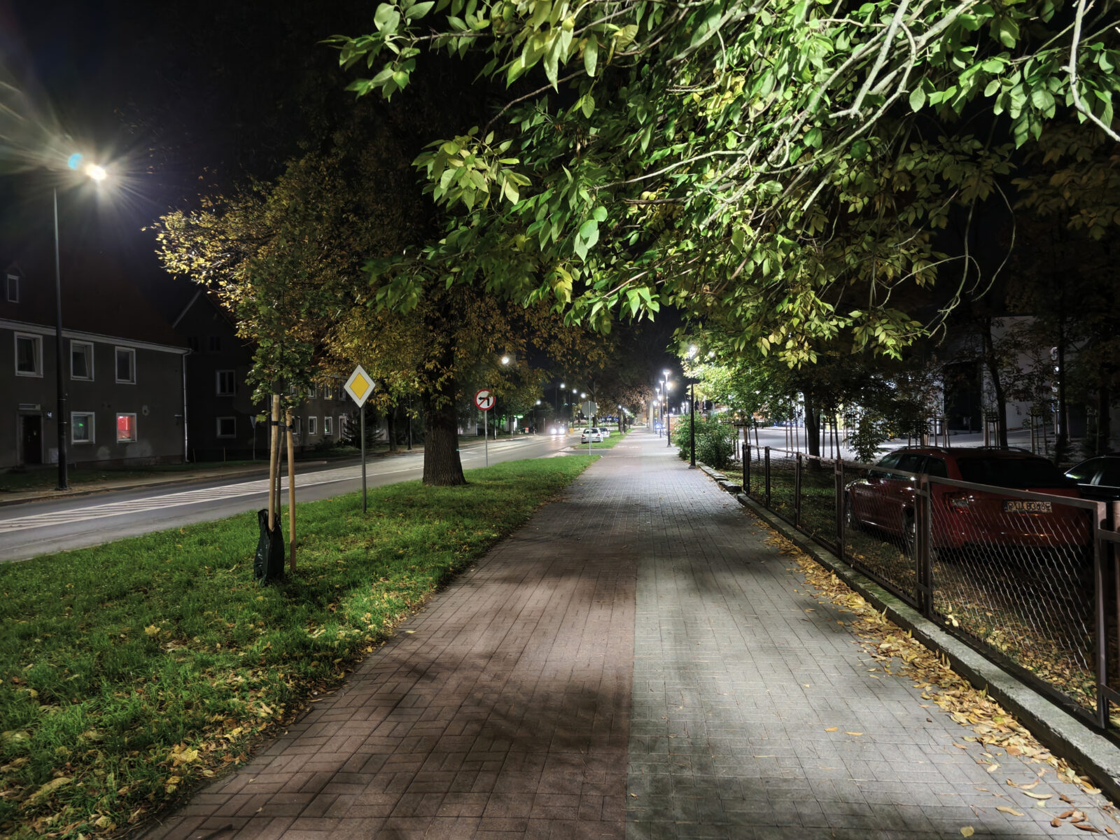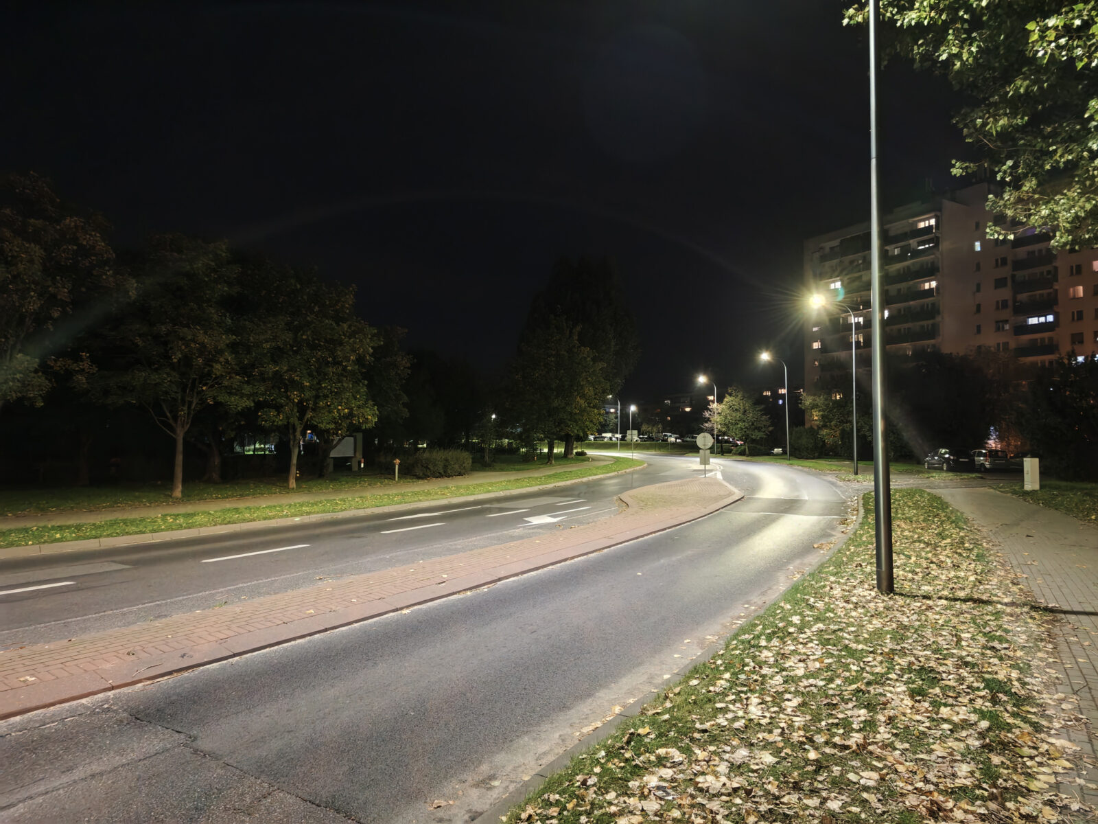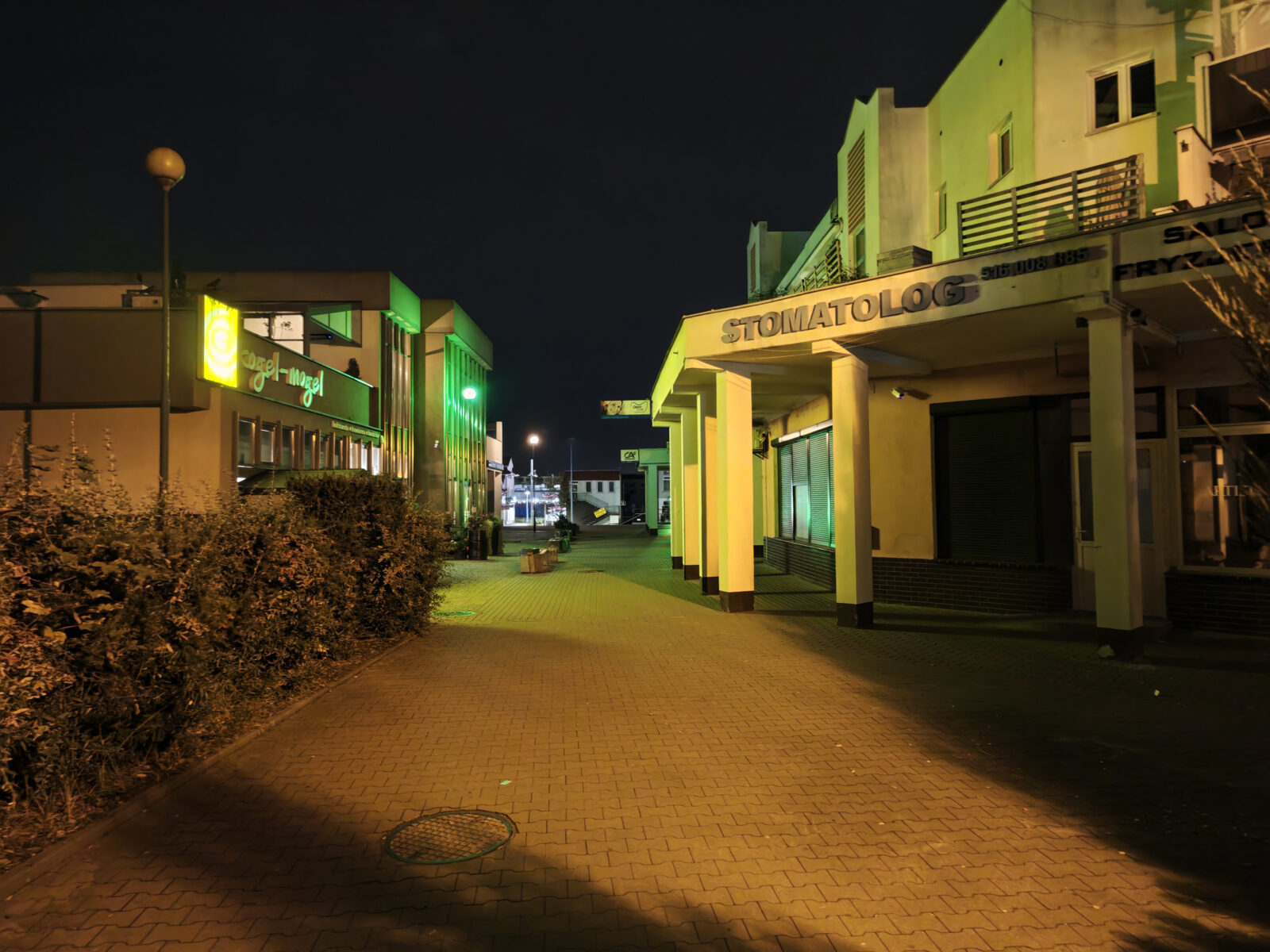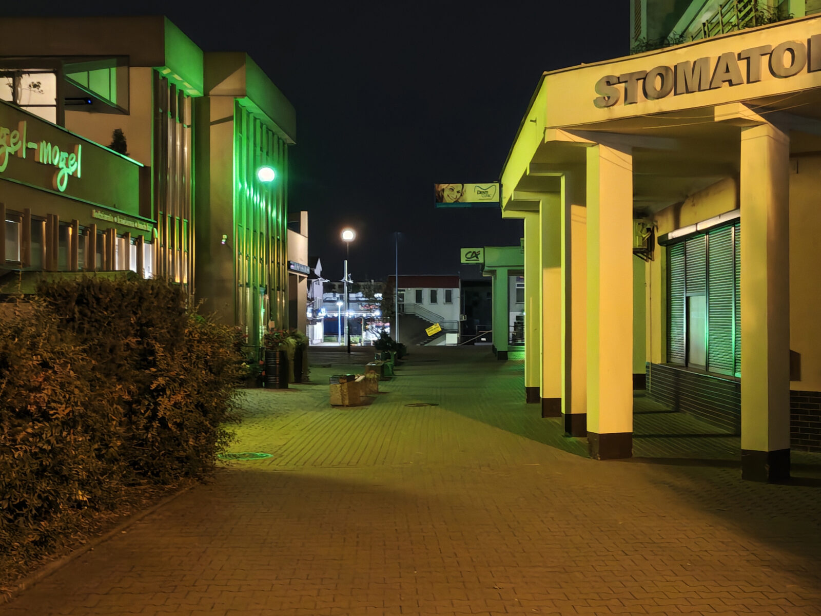 Zdjęcia nocne także są dobrej jakości. W trybie nocnym nie jest dostępne zbliżenie ×4 i ma to swoje uzasadnienie – najwyższą jakość mają zdjęcia z głównego aparatu szerokokątnego, te z aparatu standardowego wyglądają gorzej – o ile kolory i poziom artefaktów stoją na dobrym poziomie, to zdjęcia są mniej szczegółowe i widać na nich mocniejsze przetwarzanie. W tych warunkach forsowanie zoomu ×4 nie miałoby uzasadnienia. Ponownie też widać niezbyt dobrą pracę pod światło optyki MIX Flipa.