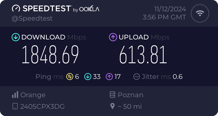 Routera zgodnego z Wi-Fi 7 w tej chwili niestety nie mam, co nie pozwala przetestować ani maksymalnej wydajności takiego tandemu, ani stabilności połączenia na wielu pasmach naraz. W połączeniu z routerem Wi-Fi 6E w paśmie 6 GHz Xiaomi MIX Flip rozkręcił się jednak do ~1850 Mbps i 600 Mbps podczas wysyłania, czyli blisko maksimum osiągalnego dla mojego łącza.