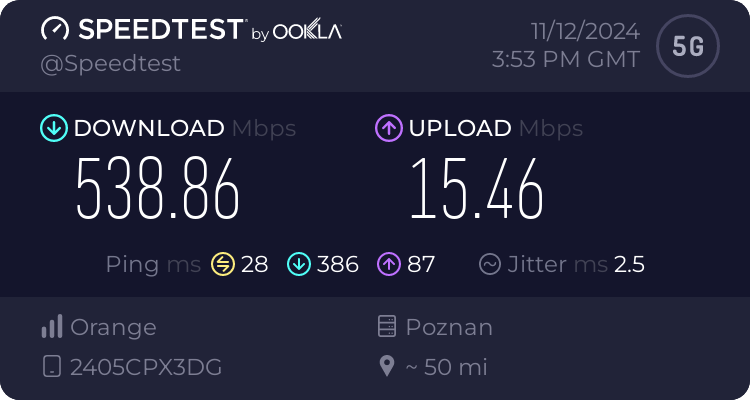 Do testów użyłem karty nanoSIM Orange Flex, na której smartfon automatycznie uruchomił sieć 5G, połączenia VoLTE i VoWiFi. W zasięgu pasma C (3,6 GHz) transfery w godzinach popołudniowych zwykle nieznacznie przekraczały 500 Mbps, niestety przy dość niskim uploadzie.