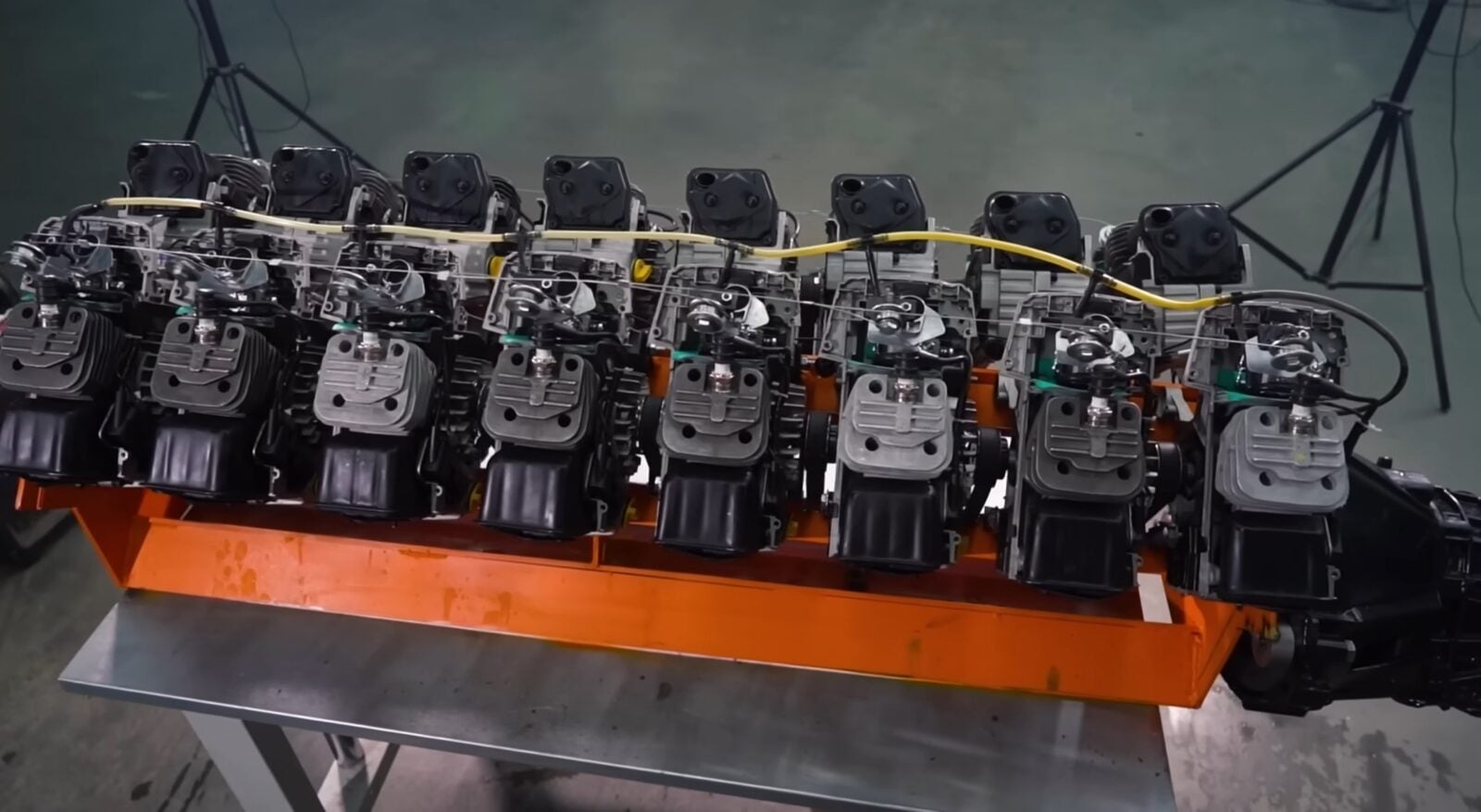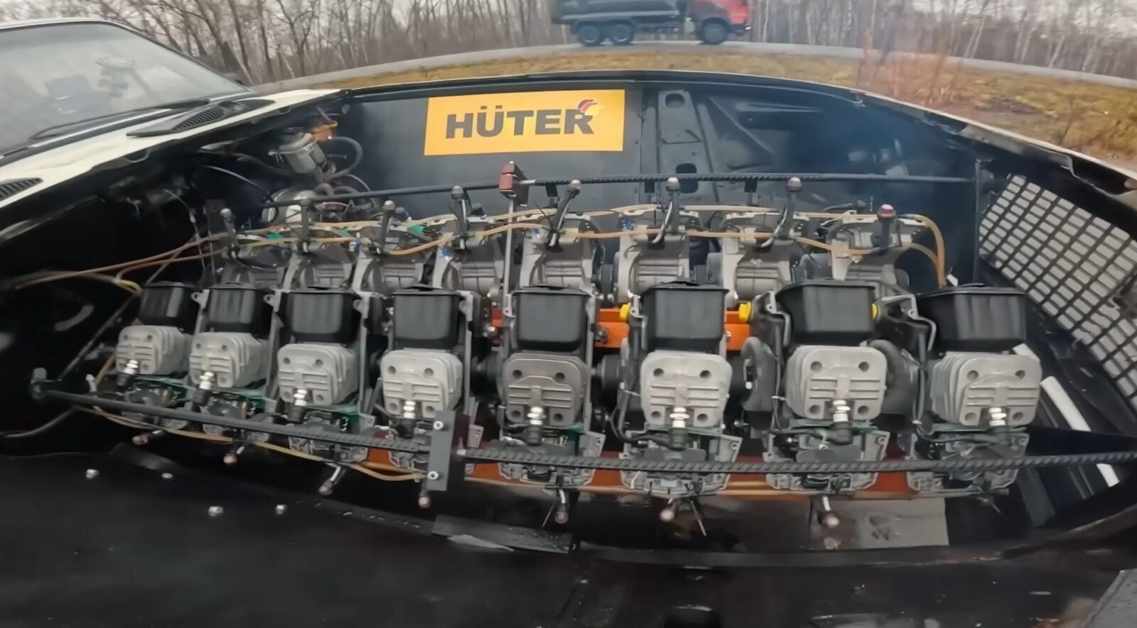 Mechanicy z Garage 54 nie wyciągnęli V16 np. z Bugatti, bo zamiast tego sami stworzyli sobie 16-cylindrowy silnik w układzie V, korzystając z szesnastu dwusuwowych silników wyrwanych z pił łańcuchowych Hüter BS62. Jako że każdy silnik piły łańcuchowej ma pojemność 58 cm³, cała jednostka napędowa może pochwalić się poziomem ledwie 930 centymetrów sześciennych pojemności. Dorzucając do tego fakt, że jej moc wynosi ledwie 74 koni mechanicznych, tego typu zmodernizowana Łada chowa się nawet przed dzisiejszymi samochodami miejskimi z 1.0-litrowymi EcoBoostami. Wszystko to przy długości około 130 centymetrów, a więc prawie 3-razy okazalszej względem 1,6-litrowego silnika o długości 47 cm, którego rosyjskie fabryki montują w Ładach 2106.