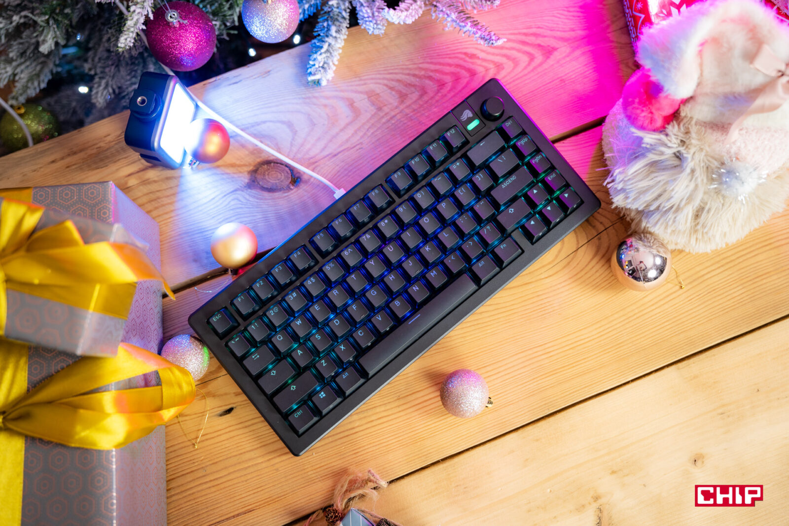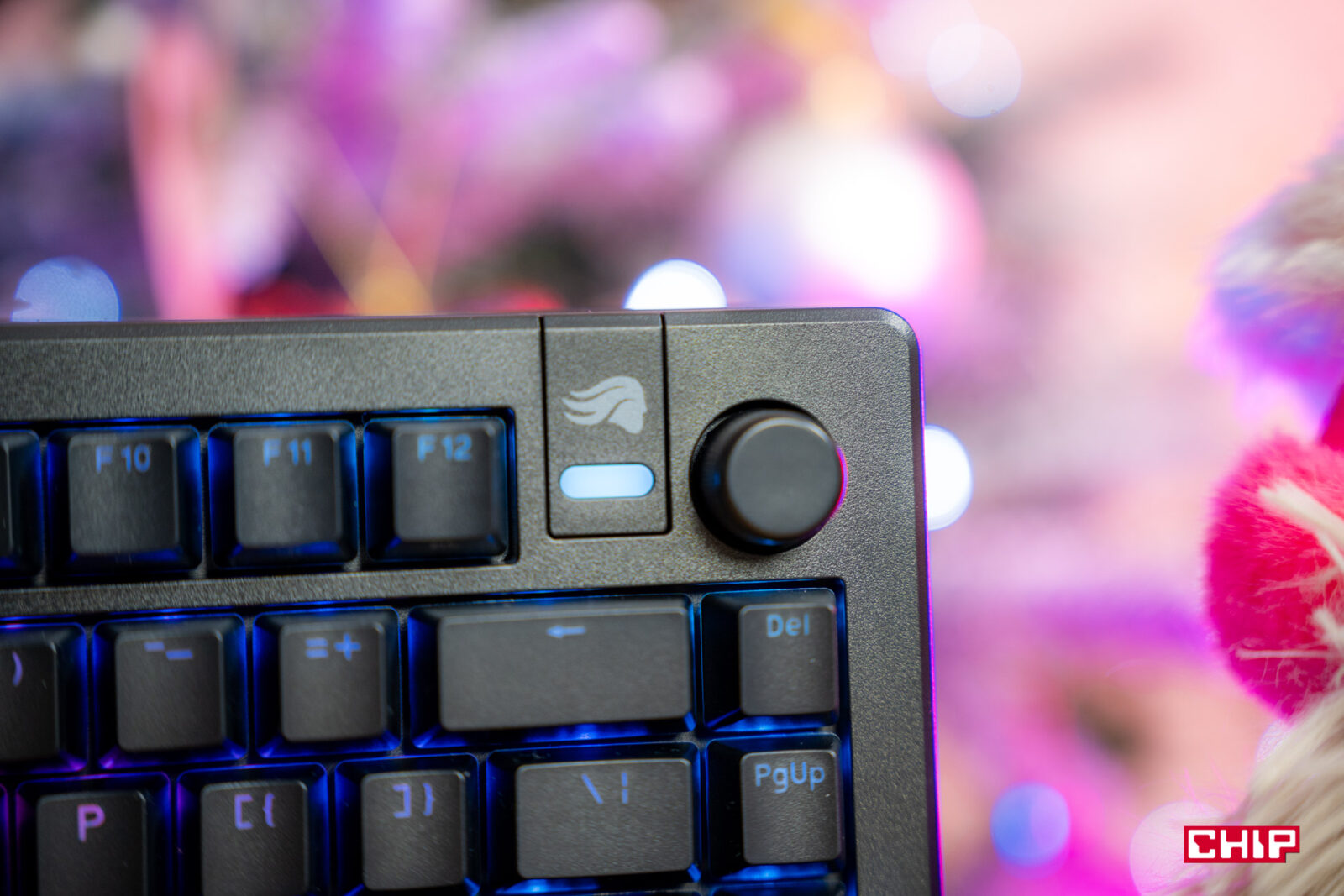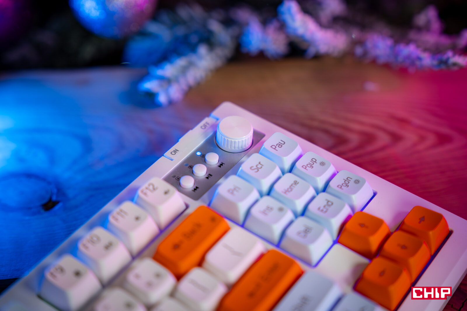 Klawiatura może działać przewodowo lub bezprzewodowo z wykorzystaniem odbiornika USB lub Bluetooth. Możemy ją sparować z trzema urządzeniami jednocześnie i wygodnie się między nimi przełączać (jak w Logitechu). Do dyspozycji mamy też pokrętło do sterowania głośnością komputera oraz oczywiście podświetlenie klawiszy. Swoją drogą całkiem estetyczne. Czas pracy? Przy codziennym użytkowaniu 5-7 dni i ładowanie odbywa się przez port USB-C.