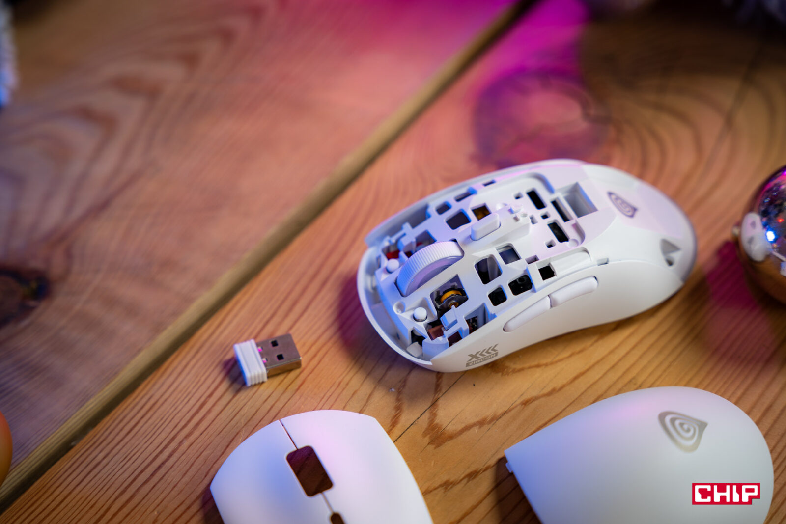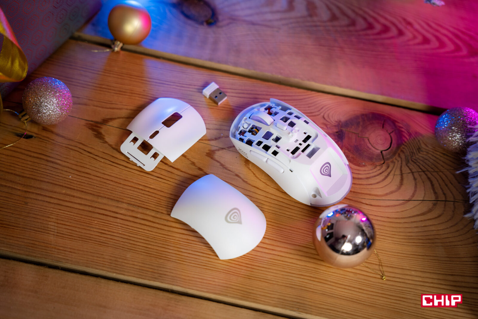 Pomimo tego, że myszkę możemy łatwo rozłożyć i złożyć, ma bardzo solidną konstrukcję. To wytrzymały sprzęt, który powinien posłużyć przez długi czas. A to nie zawsze się zdarza, bo zazwyczaj modułowe konstrukcje są na bakier z solidnością. Ale konstrukcja to jedno, ważne są też możliwości. Tu też jest dobrze, bo do dyspozycji mamy jeden z najlepszych sensorów Pixart PAW3395 oraz technologię Motion-Sync poprawiającą synchronizację z komputerem, przełączniki Kailh, enkoder TTC Gold oraz akumulator, który na pojedynczym ładowaniu wytrzymuje do 100 godzin pracy. W tej cenie (nieco ponad 200 zł) to prawdziwy mocarz!