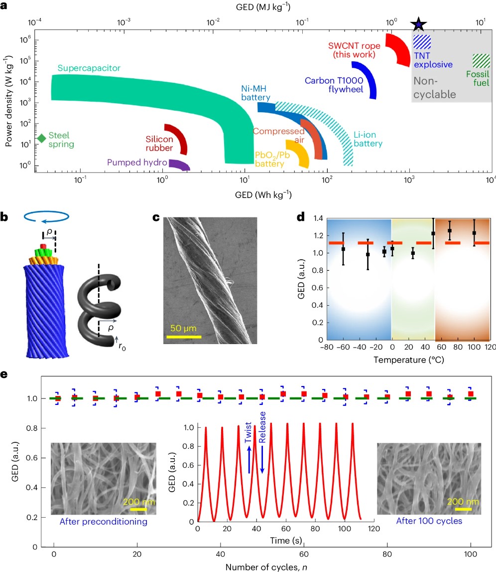 To właśnie tak wyjątkowy materiał wykorzystali naukowcy w swoich badaniach, tworząc tak zwane „nano-liny” poprzez wiązanie komercyjnie dostępnych nanorurek jednościennych w nici. Następnie nici te skręcono i pokryto specjalistycznymi materiałami, aby zwiększyć ich wytrzymałość i elastyczność. Taki innowacyjny projekt pozwolił naukowcom wykorzystać niezwykłe możliwości magazynowania energii mechanicznej. Przeprowadzone na nich eksperymenty wykazały, że skręcone liny z nanorurek mogą magazynować 15000 razy więcej energii na jednostkę masy niż stalowe sprężyny i trzykrotnie więcej energii niż zaawansowane akumulatory litowo-jonowe. Co ważne, energia ta pozostaje stabilna nawet w ekstremalnych temperaturach, bo w temperaturze od -60°C do +100°C.