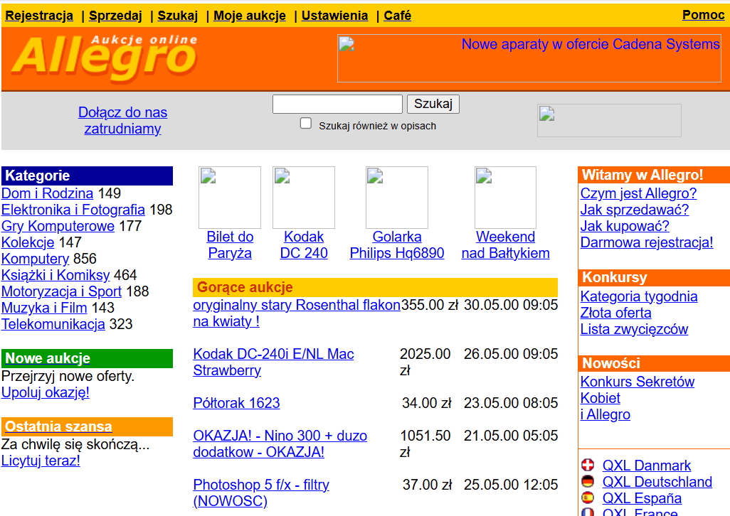 Nie pamiętam pierwszego przedmiotu jaki kupiłem/sprzedałem za pośrednictwem serwisu, ale wiadomo, że pierwszym w historii całego Allegro okazała się kamera internetowa na USB. Bardzo szybko, bo już po kilku miesiącach od startu, nowym graczem na polskim rynku zainteresowała się brytyjska grupa QXL Ricardo, specjalizująca się w budowie serwisów aukcyjnych. Założyciele platformy zdecydowali się ją sprzedać, zachowując jednocześnie swoje stanowiska w zarządzie. O dynamicznym tempie rozwoju Allegro może świadczyć fakt, że już w 2001 roku udało się przebić w serwisie poziom miliona aukcji, a dwa lata później zanotować milion aktywnych kupujących użytkowników. Po wejściu platformy eBay do Polski w 2005 roku stało się jednak jasne, że Allegro musi znaleźć na siebie nowy lepszy pomysł. Jednym z kluczowych kroków okazało się przejęcie porównywarki Ceneo w 2006 roku.