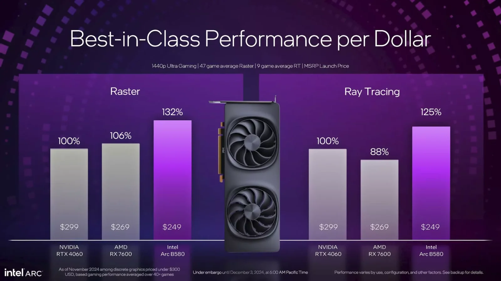 Intel twierdzi również, że odnotował znaczące zyski w porównaniu ze starszymi produktami, w szczególności z pięcioletnią kartą GeForce GTX 1660 Super , która w październiku 2019 r. zadebiutowała w cenie 230 dolarów. W cenie 250 dolarów firma Intel sugeruje, że procesor B580 jest o 96% szybszy, a ponadto obsługuje przyspieszane sprzętowo śledzenie promieni i nowsze technologie skalowania, takie jak XeSS, wykorzystujące zaawansowaną ścieżkę XMX firmy Intel.