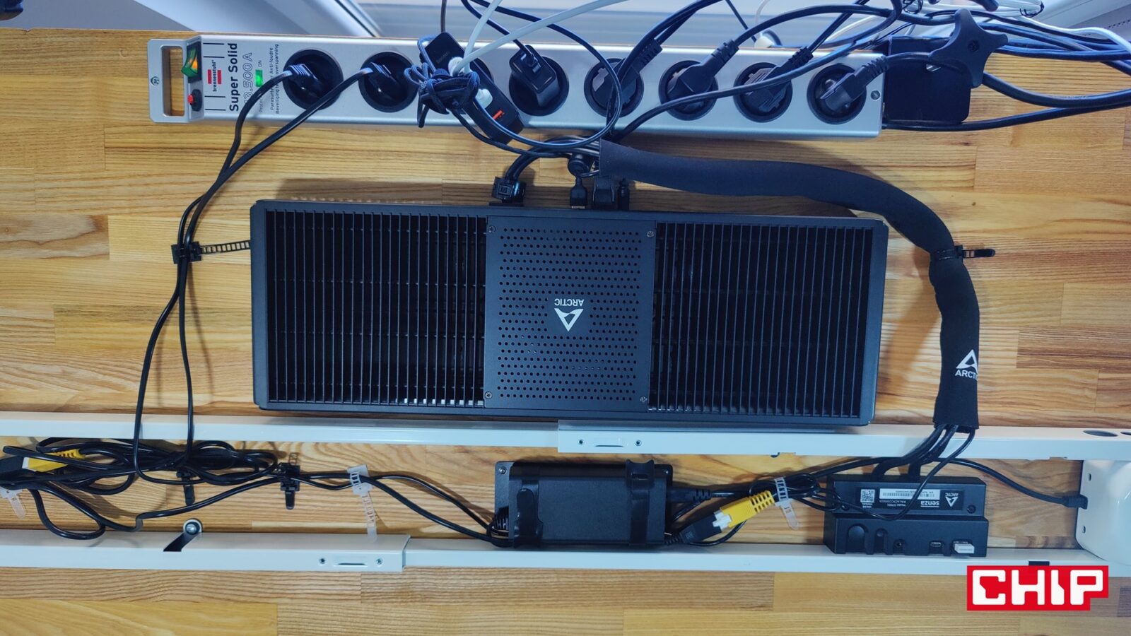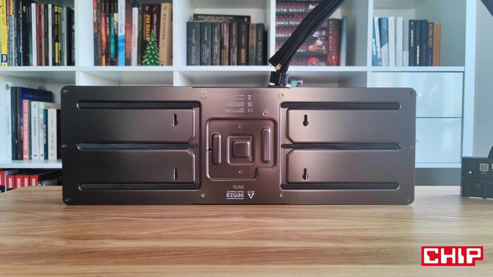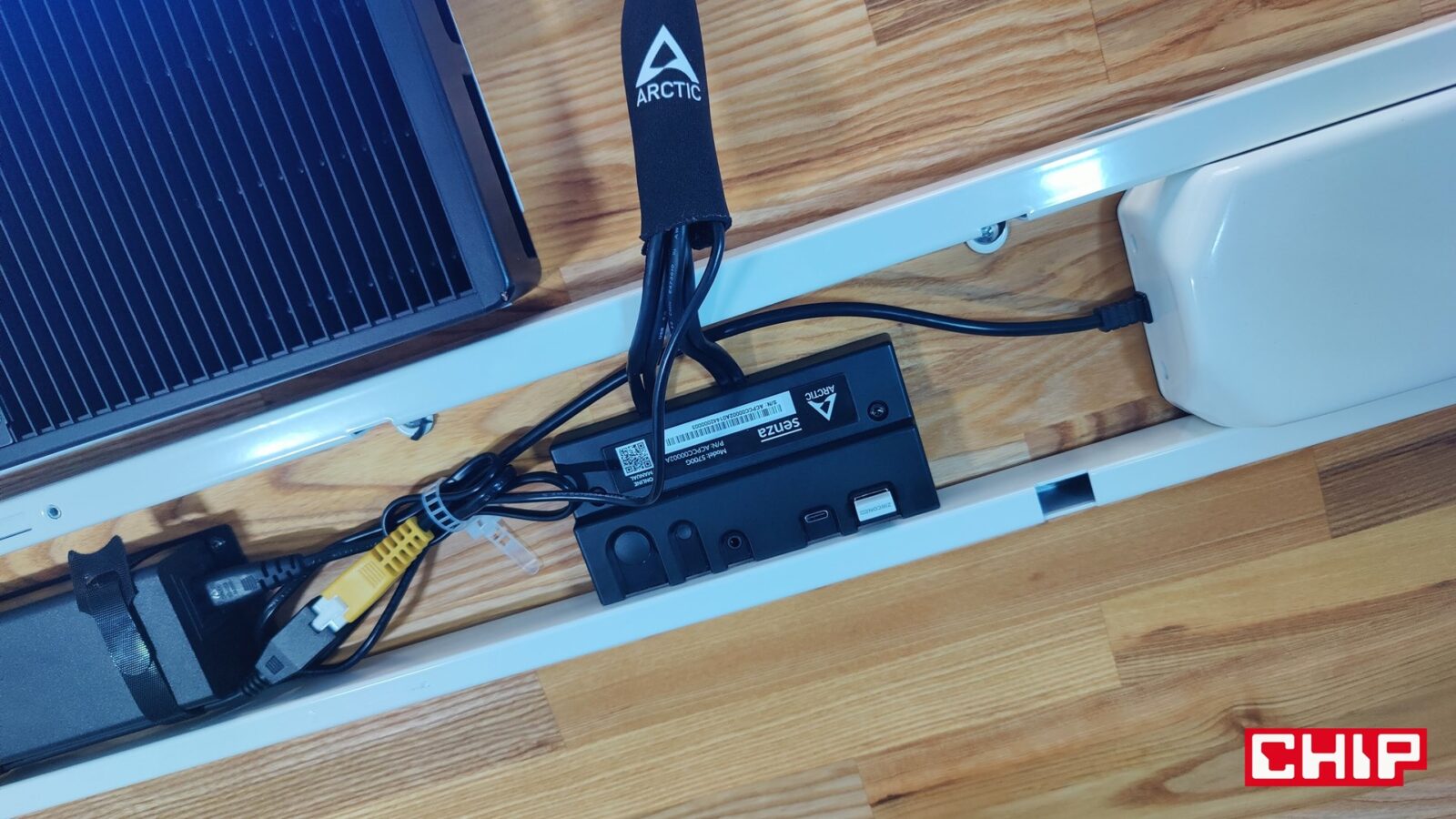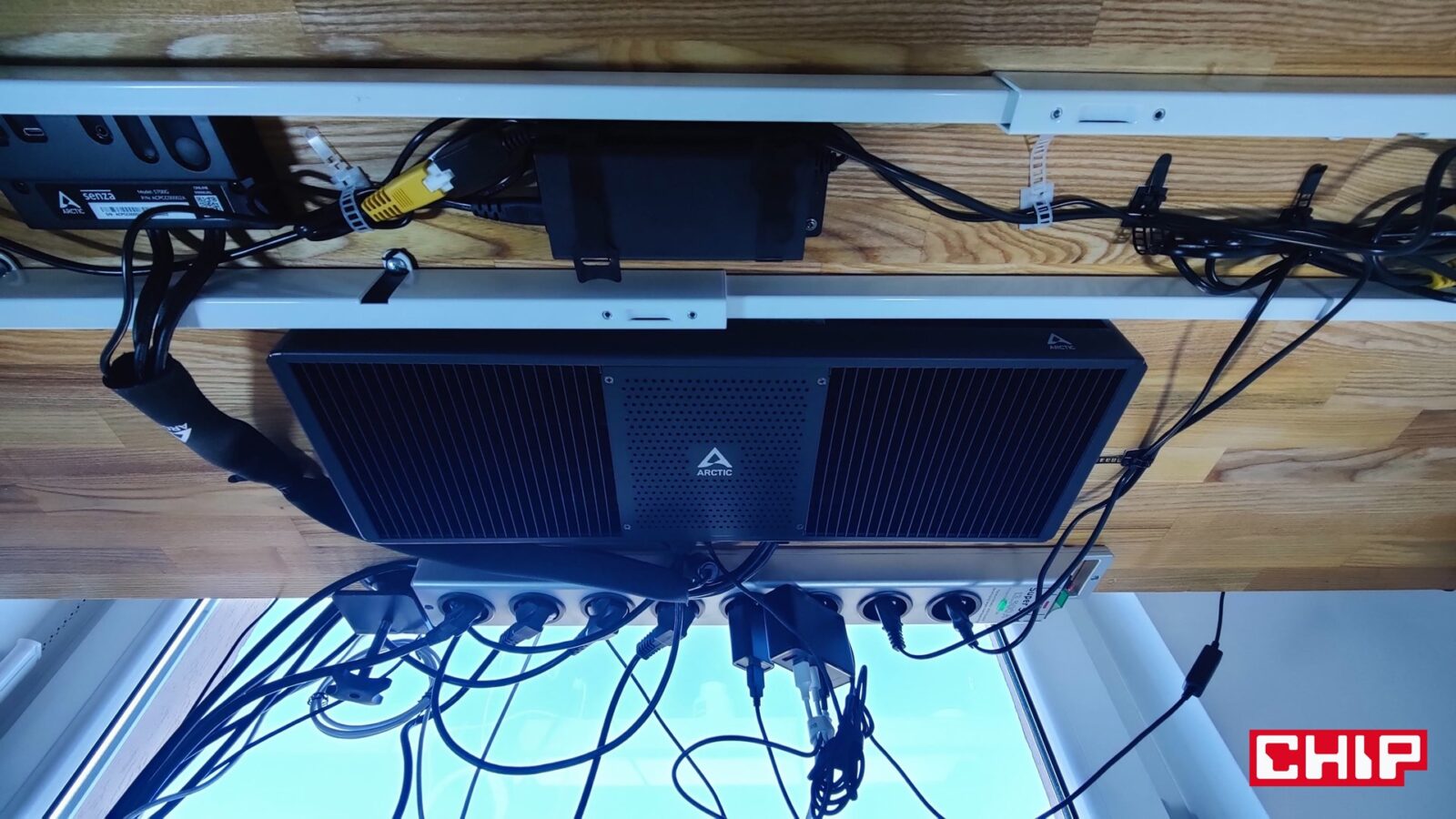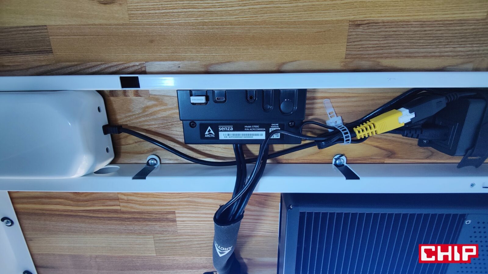 Chociaż pierwotnie miałem zamiar wkręcić komputer w przedniej części blatu tak, aby poprowadzić panel I/O w okolice kontrolera podnoszonego stelaży, tak finalnie zmieniłem zdanie i przeprowadziłem jeszcze bardziej skryty montaż. Efekt? Ciepło z komputera przestało ogrzewać moje uda, a cały sprzęt udało mi się ukryć “za stelażem” z perspektywy użytkownika. Straciłem przez to wprawdzie łatwy dostęp do portów, ale w dobie bezprzewodowych peryferiów nie jest to specjalnie problematyczne. Innymi słowy, montując ARCTIC Senza możecie poeksperymentować z waszym stanowiskiem i zdecydować się np. na montaż tego podblatowego komputera na ścianie lub szafce obok, jeśli akurat wyda się to wam lepszym pomysłem. Ogranicza was tylko wyobraźnia… i narzędzia oraz śruby. Temu komputerowi nie robi bowiem różnicy to, w jakiej orientacji będzie. Najważniejsze jest to, aby nie zasłaniać go z każdej strony, bo inaczej jego radiator przestanie oddawać skutecznie ciepło pobrane z procesora.