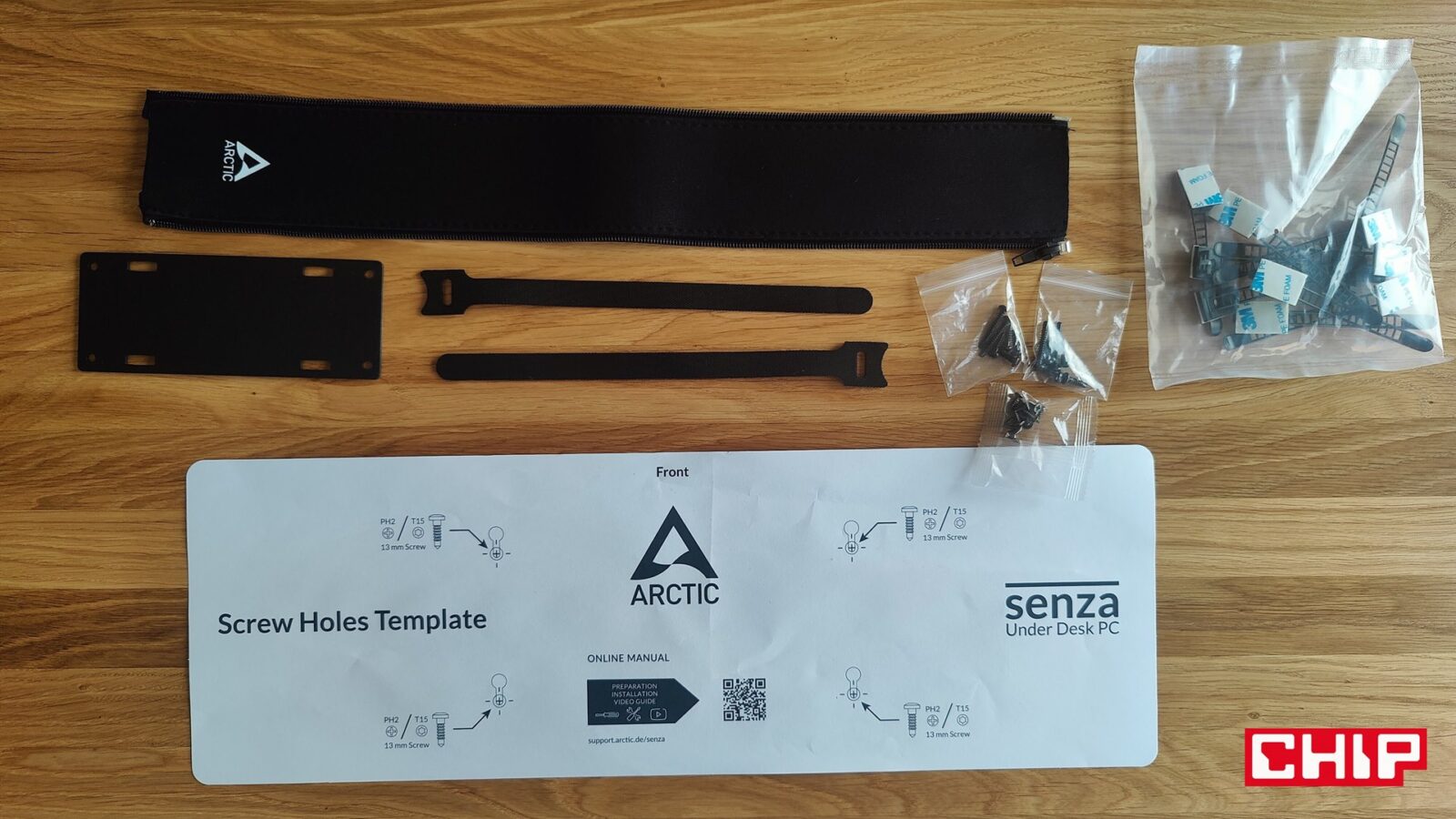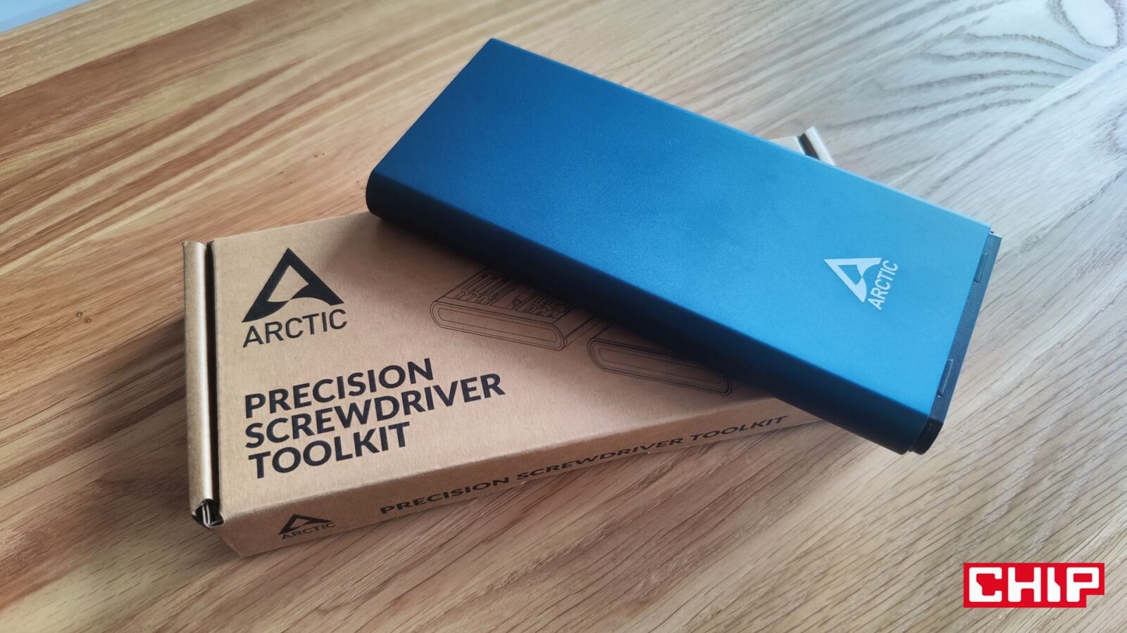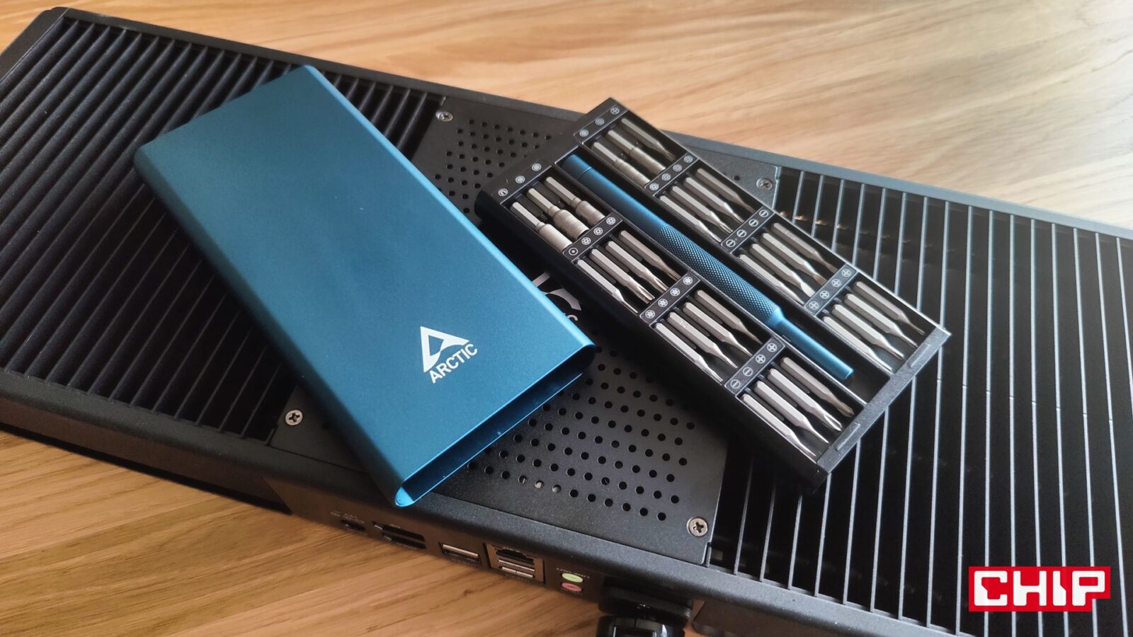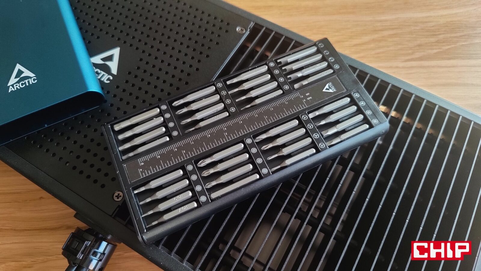 Firma ARCTIC wprowadziła też przy okazji na rynek dostępny do kupienia osobno, specjalny zestaw precyzyjnych śrubokrętów w formie przyjemnej, cienkiej kasety, w której umieściła bogaty zestaw namagnesowanych bitów oraz uchwyt na bity z obracaną koronką. Tylko bity w zestawie przydadzą się wam podczas montażu, bo ten wymaga wkrętarki. Albo to, albo będziecie się męczyć z kilkunastoma śrubkami, co w przypadku twardego blatu (np. z naturalnego drewna), do przyjemnych nie należy.