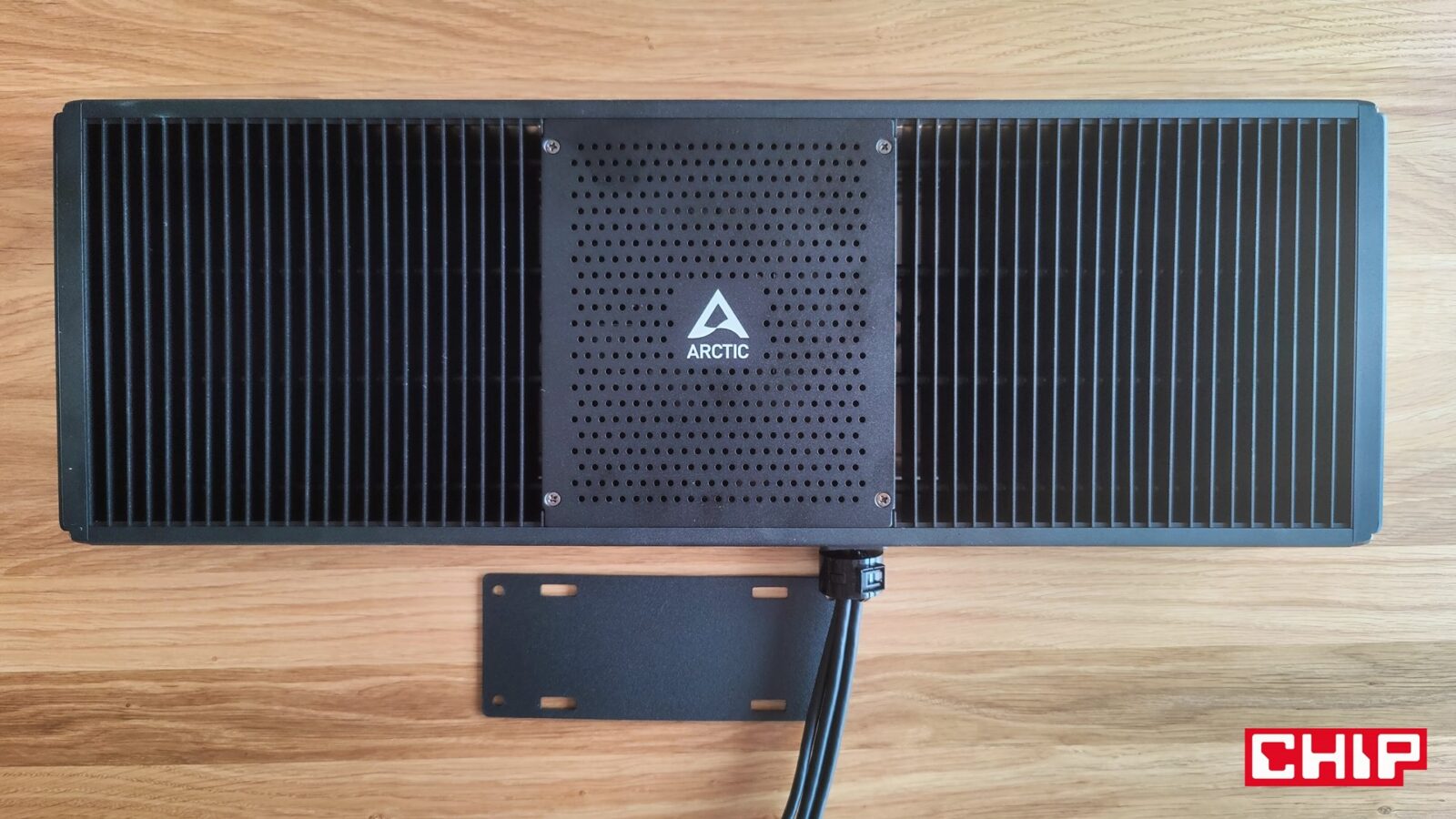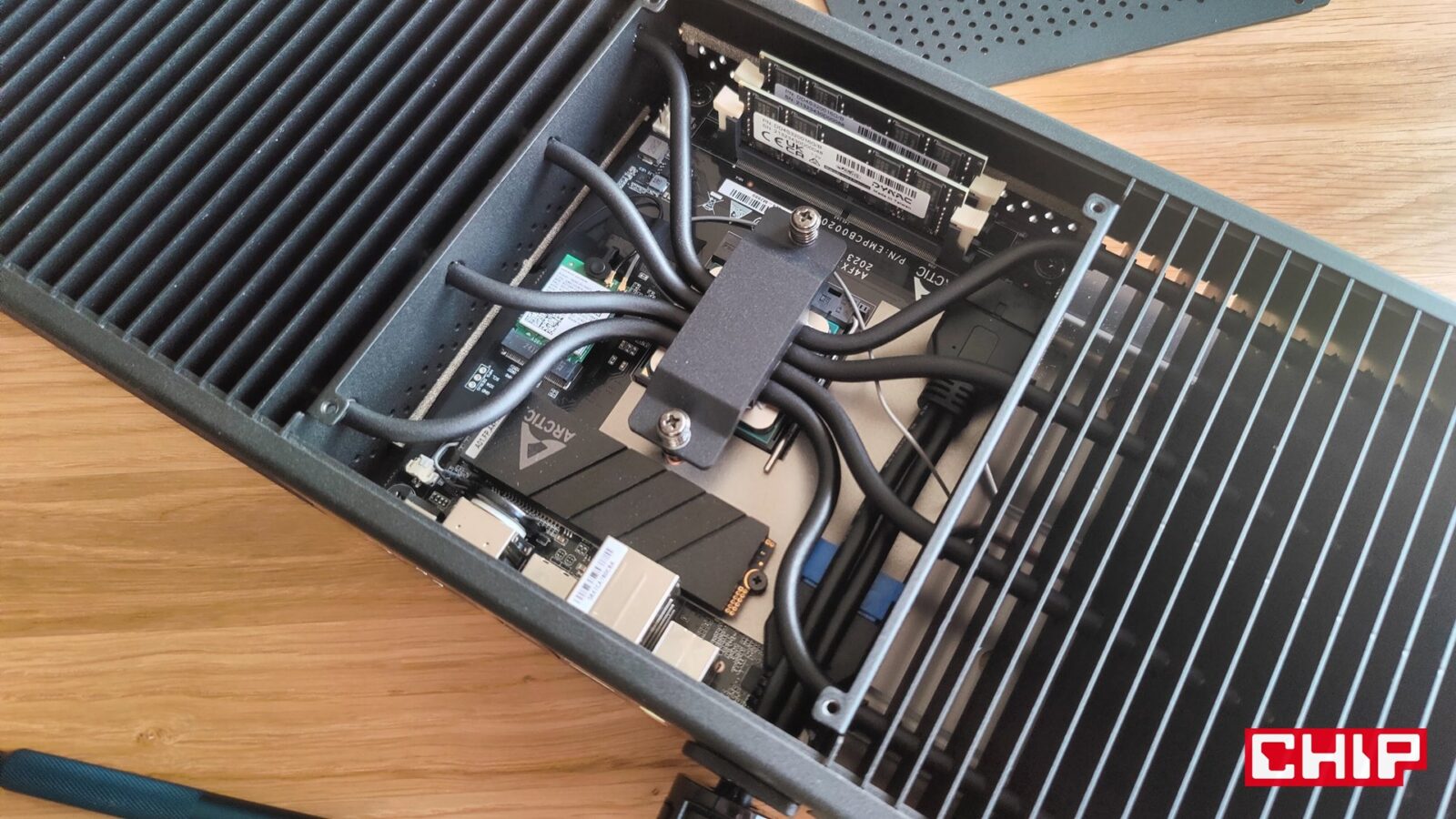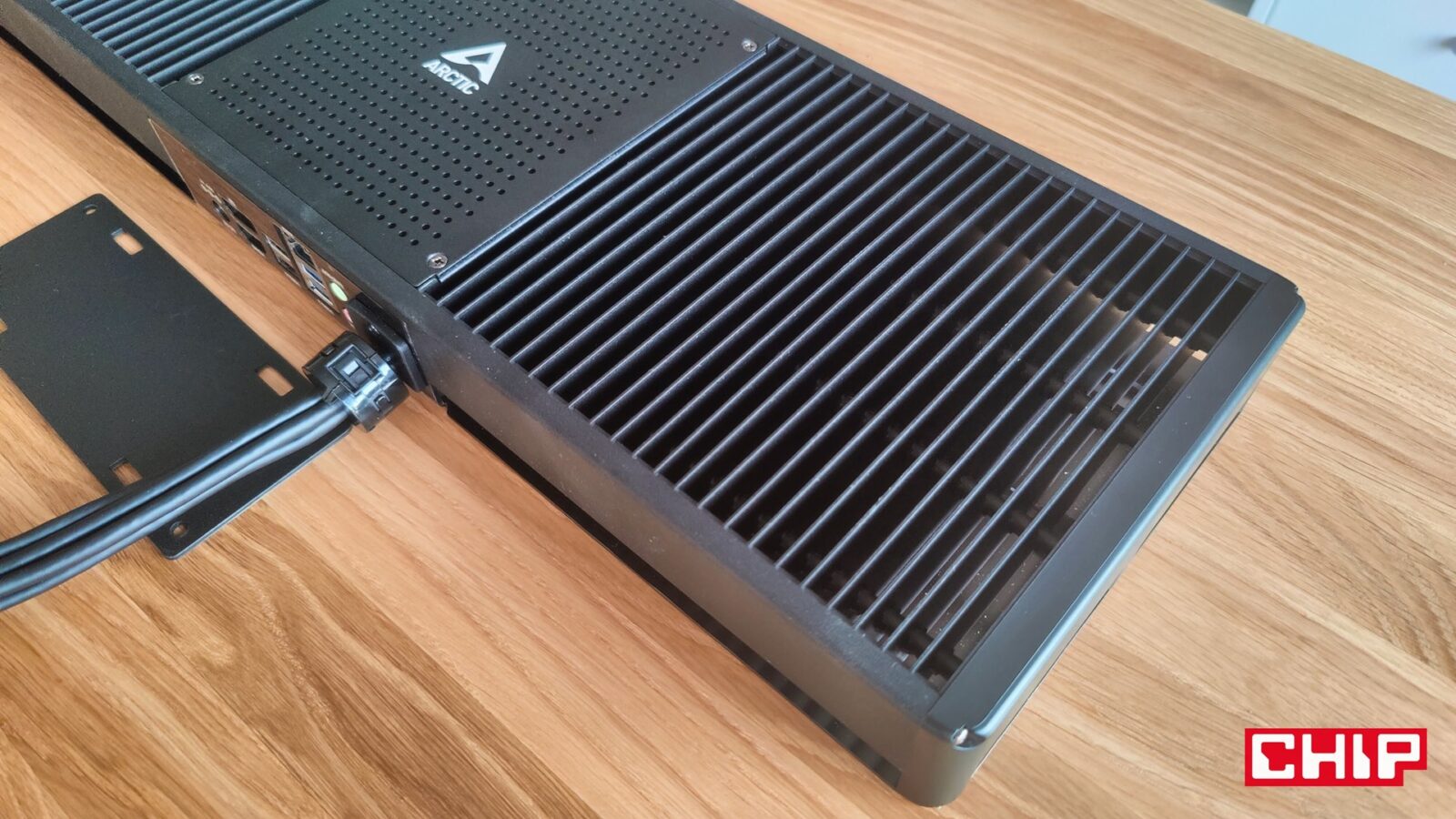 ARCTIC Senza wyróżnia się na rynku komputerów nie tylko pasywnym charakterem chłodzenia, ale przede wszystkim konstrukcją dedykowaną do montażu pod blatem biurka. Nie liczcie jednak na prosty, nieinwazyjny w blat montaż – producent przewiduje wyłącznie wkręcanie śrub w blat, aby utrzymać zarówno komputer (536 x 180 x 50 mm), jak i panel wejść i wyjść (I/O) mierzący 66 x 141 x 25 mm. Gdyby nie pasywny charakter tego komputera, mierzyłby on ledwie 14 x 18 cm, bo to w module na środku znalazła się cała elektronika, a żelastwo rozciągające się 20 cm na lewo i 20 cm na prawo, odpowiada wyłącznie za jej chłodzenie. Jak to działa? Bardzo prosto, bo w praktyce cała obudowa poza modułem odpowiada za rozpraszanie ciepła. Stąd właśnie charakterystyczna konstrukcja łącznie 22 finów o solidnej grubości, które utrzymuje w ryzach metalowa rama i przez które przechodzą cztery długie ciepłowody, mające bezpośredni kontakt z procesorem.