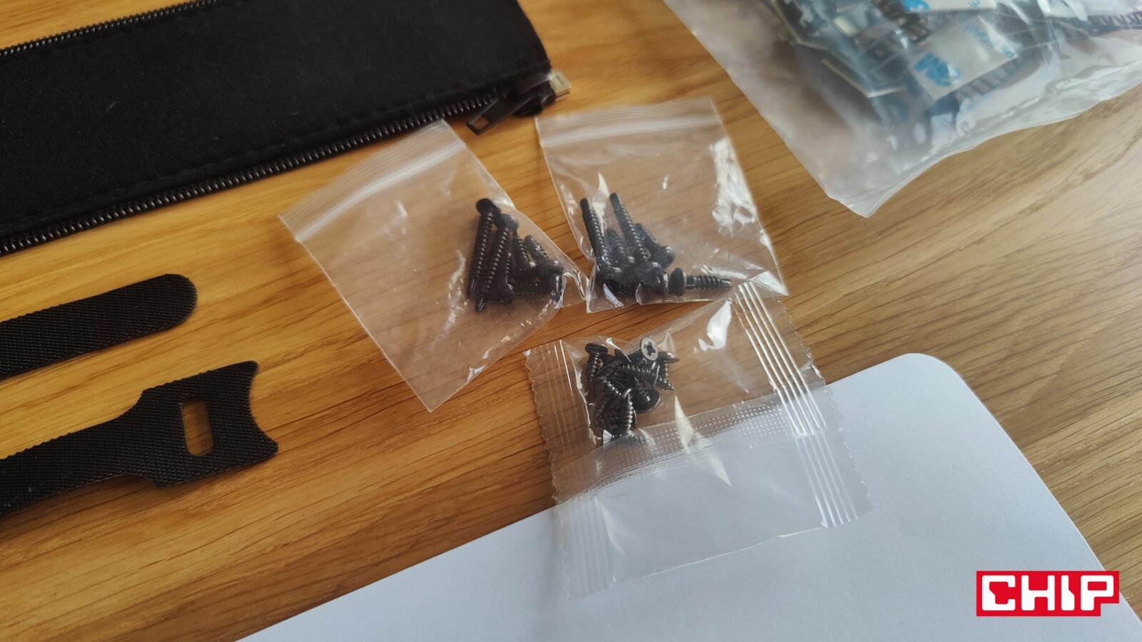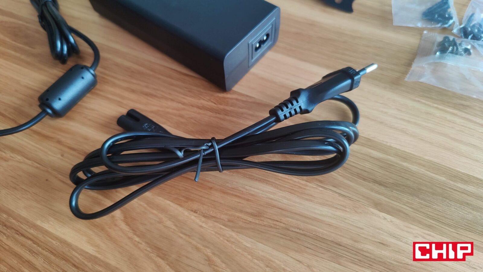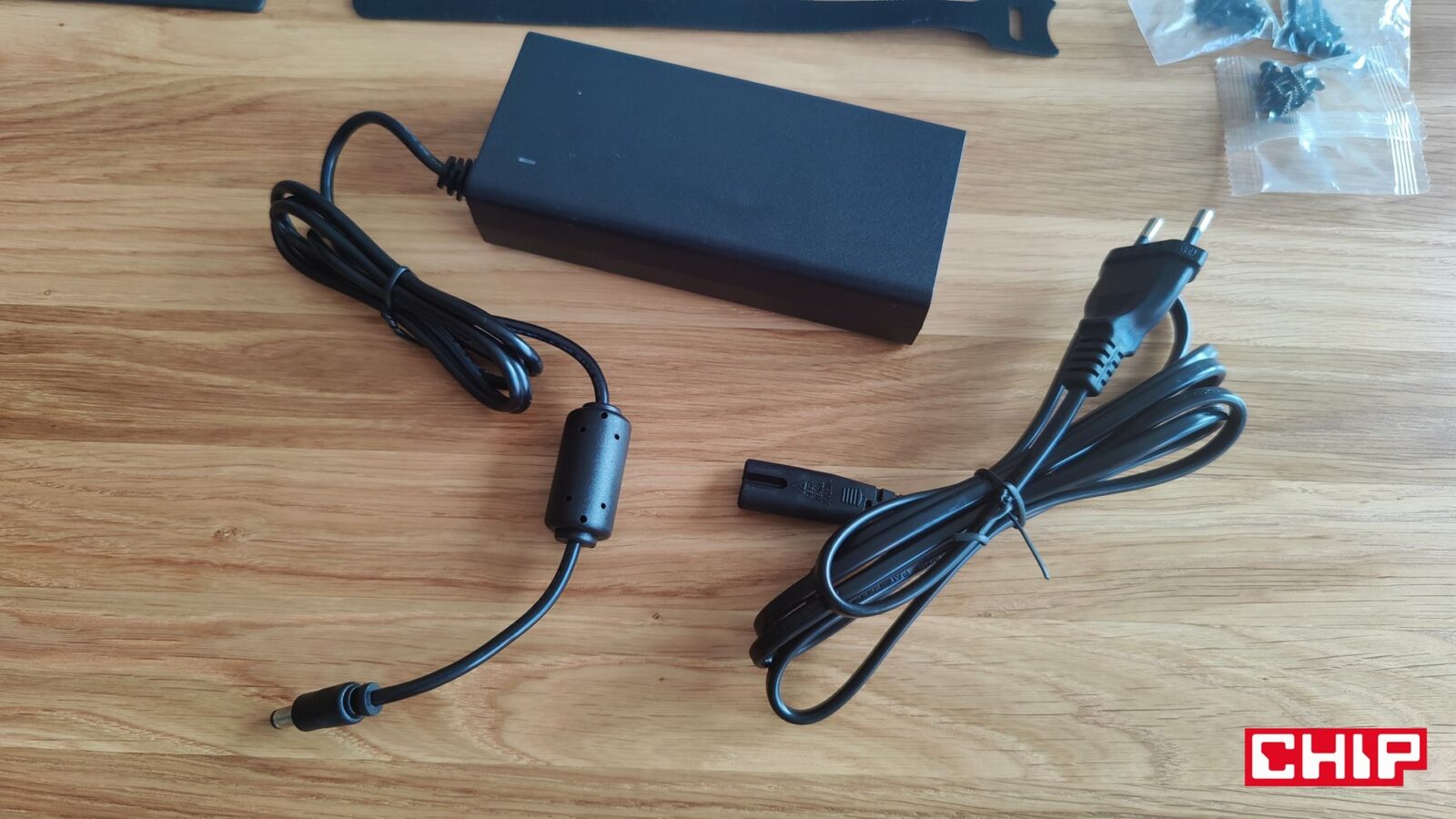 Poza komputerem i przymocowanymi do niego na stałe czterema przewodami w gumowych osłonach, które łączą go z panelem wejść i wyjść (I/O), znajdziemy też w zestawie zasilacz, długi przewód zasilający, dwa zestawy sześciu śrubek z główkami Philips lub Torx (4 krótkie, 2 długie), kilkanaście krótkich śrubek z główkami Philips (4 dla półeczki na zasilacz, pozostałe dla uchwytów kablowych) oraz papierowy wzór na rozstaw śrubek.