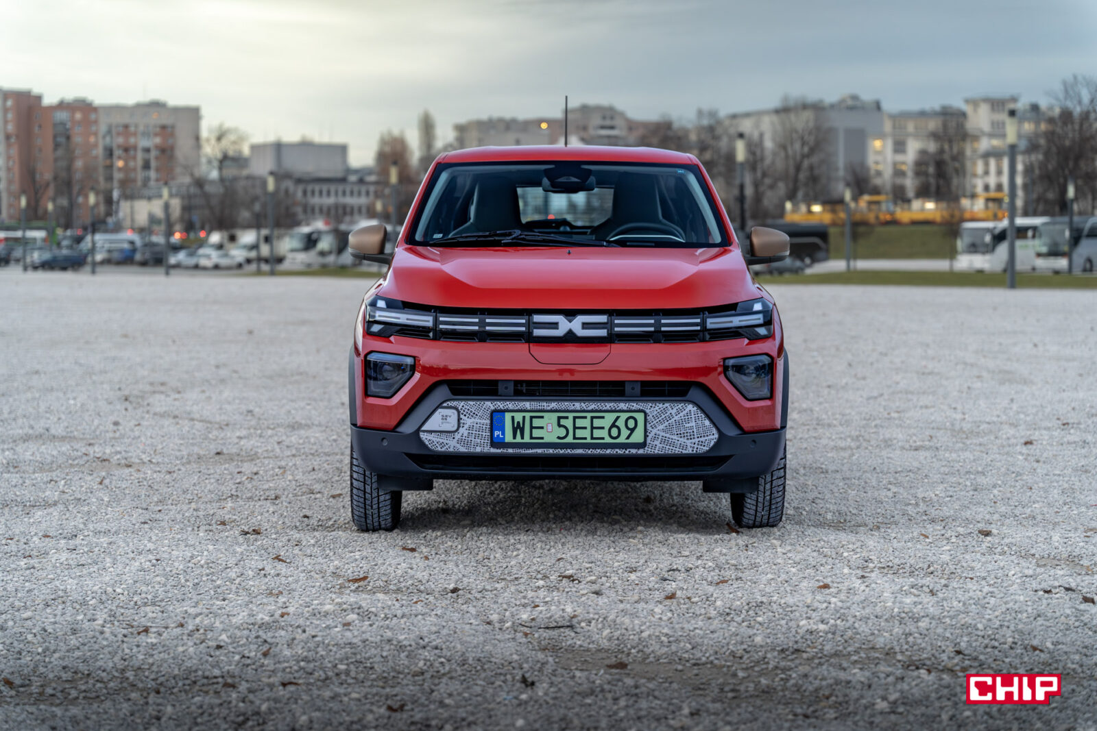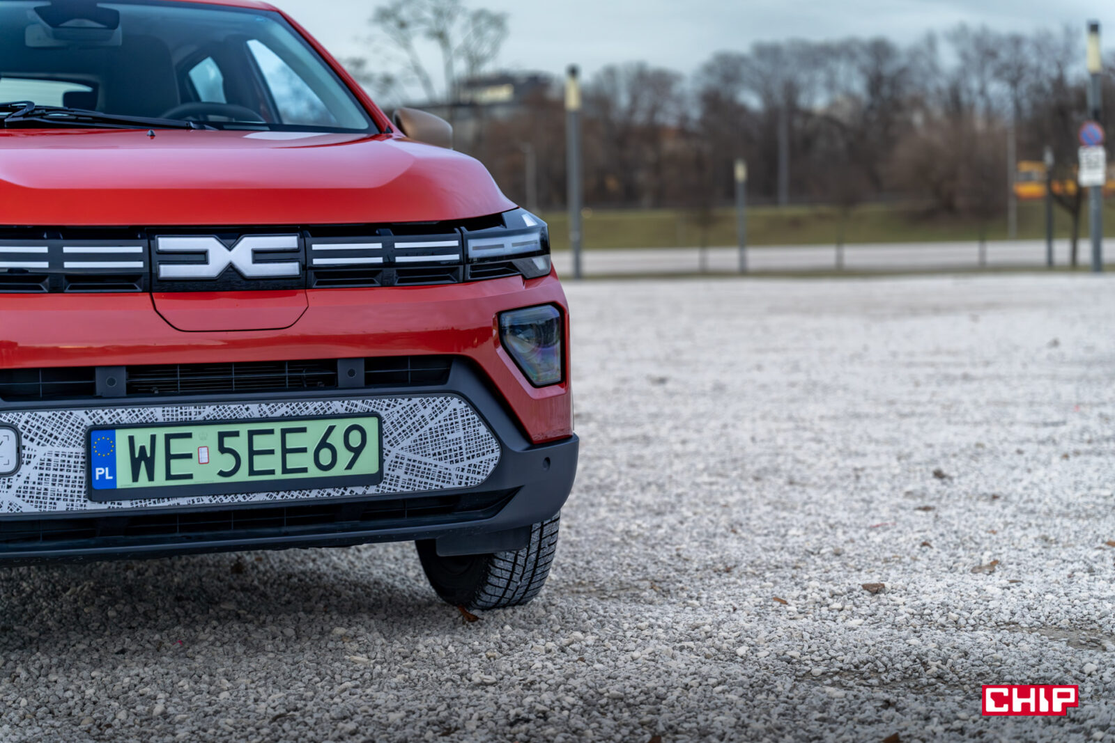 Mimo wszystko, jakby nie patrzeć, Dacia Spring wygląda zwyczajnie jak samochód. Nie jak jego tania namiastka na czterech kołach, jak to bywa w przypadku bardzo tanich elektryków. Testowaliśmy najwyższy wariant wyposażenia Extreme, którego cechą charakterystyczną są czarno-białe grafiki na zderzakach oraz bardzo efektowne, matowe lusterka.