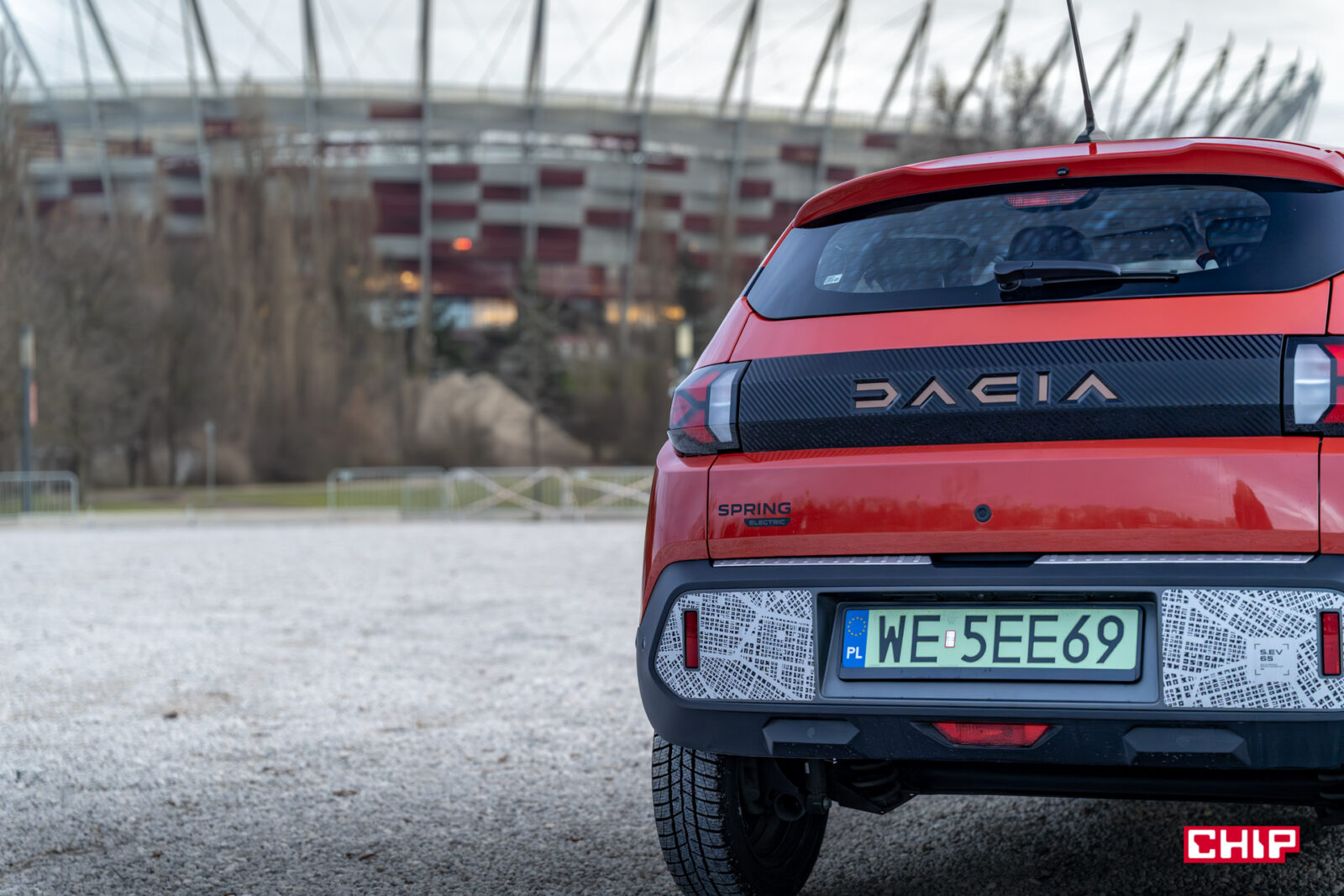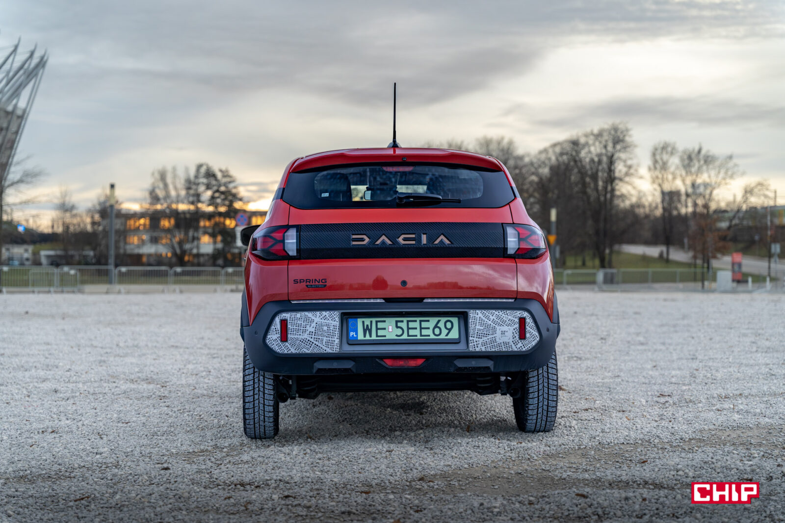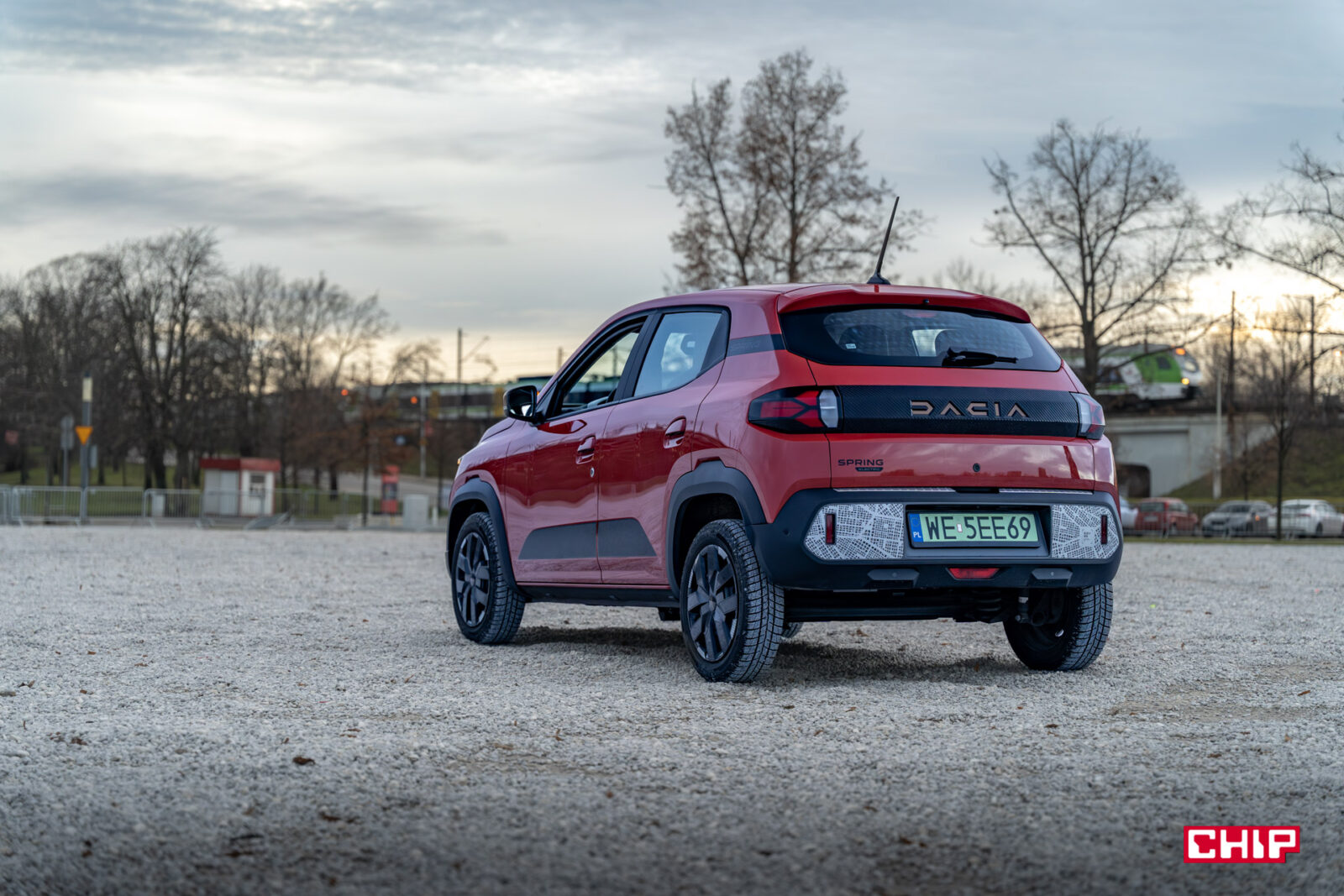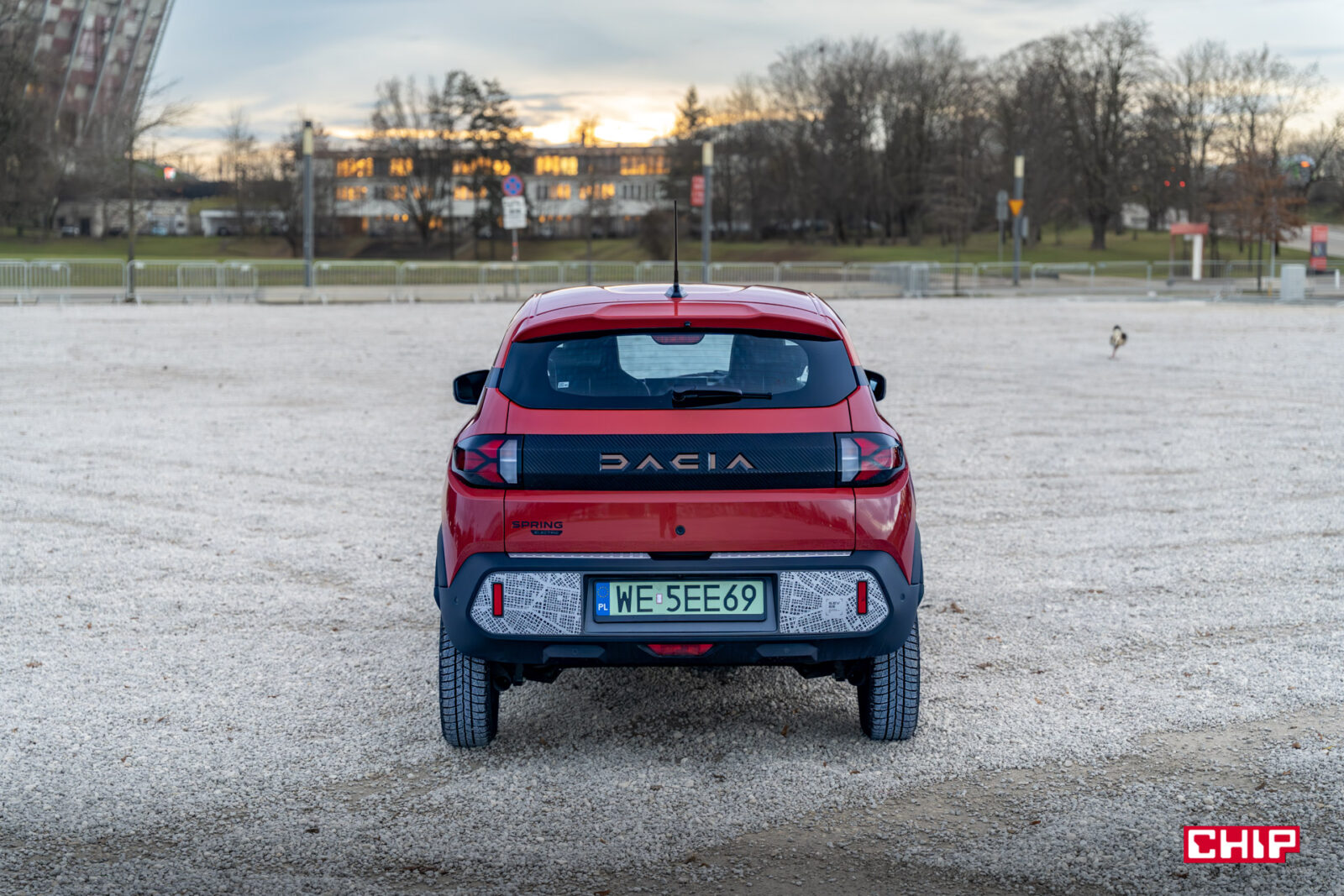 Choć Dacia Spring aż taka malutka nie jest i zdecydowanie daleko jej do choćby Smarta. Ma 3 701 mm długości, 1 767 mm szerokości z lusterkami, 1 519 mm wysokości oraz 2 423 mm rozstawu osi. Nadal jest to jednak auto bardzo kompaktowe, które wszędzie się zmieści, a mycie go przed zdjęciami, szczególnie na tle wszystkich SUV-ów, to była czysta przyjemność.