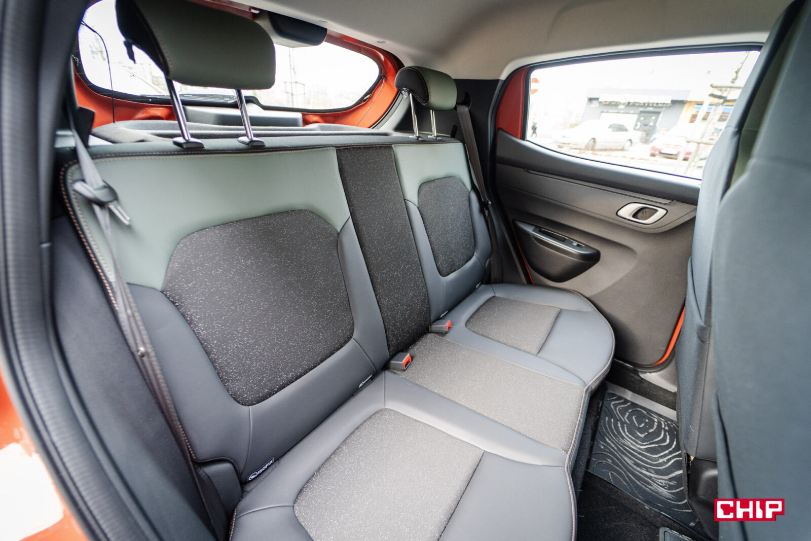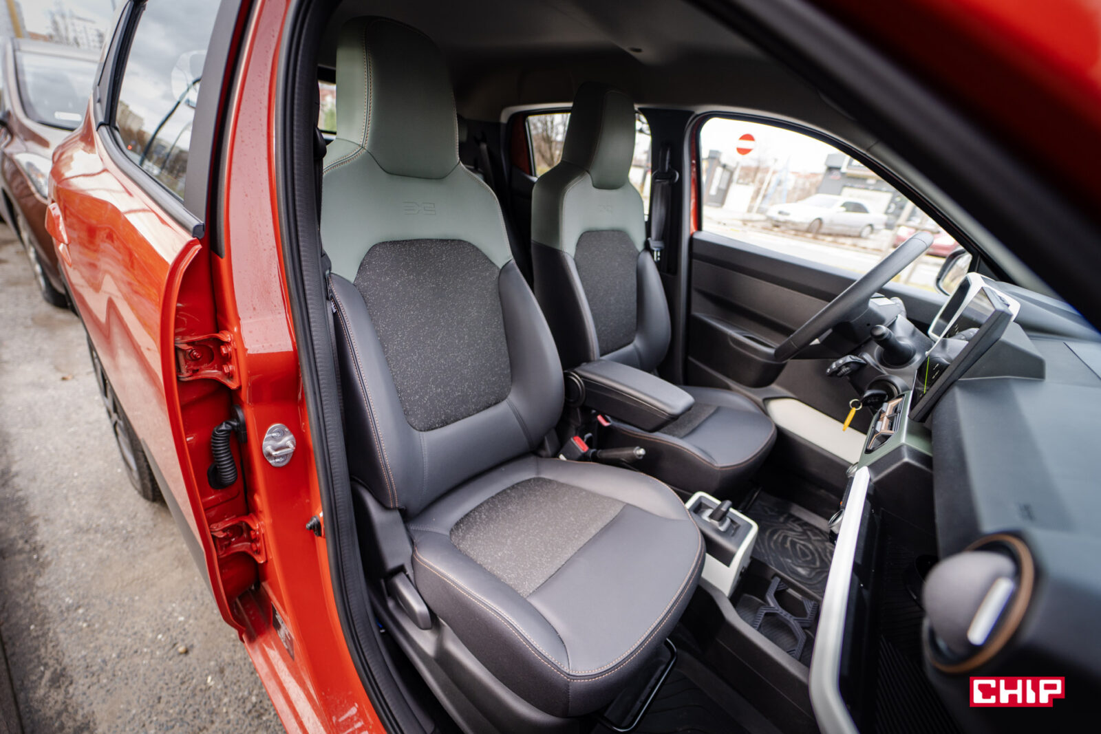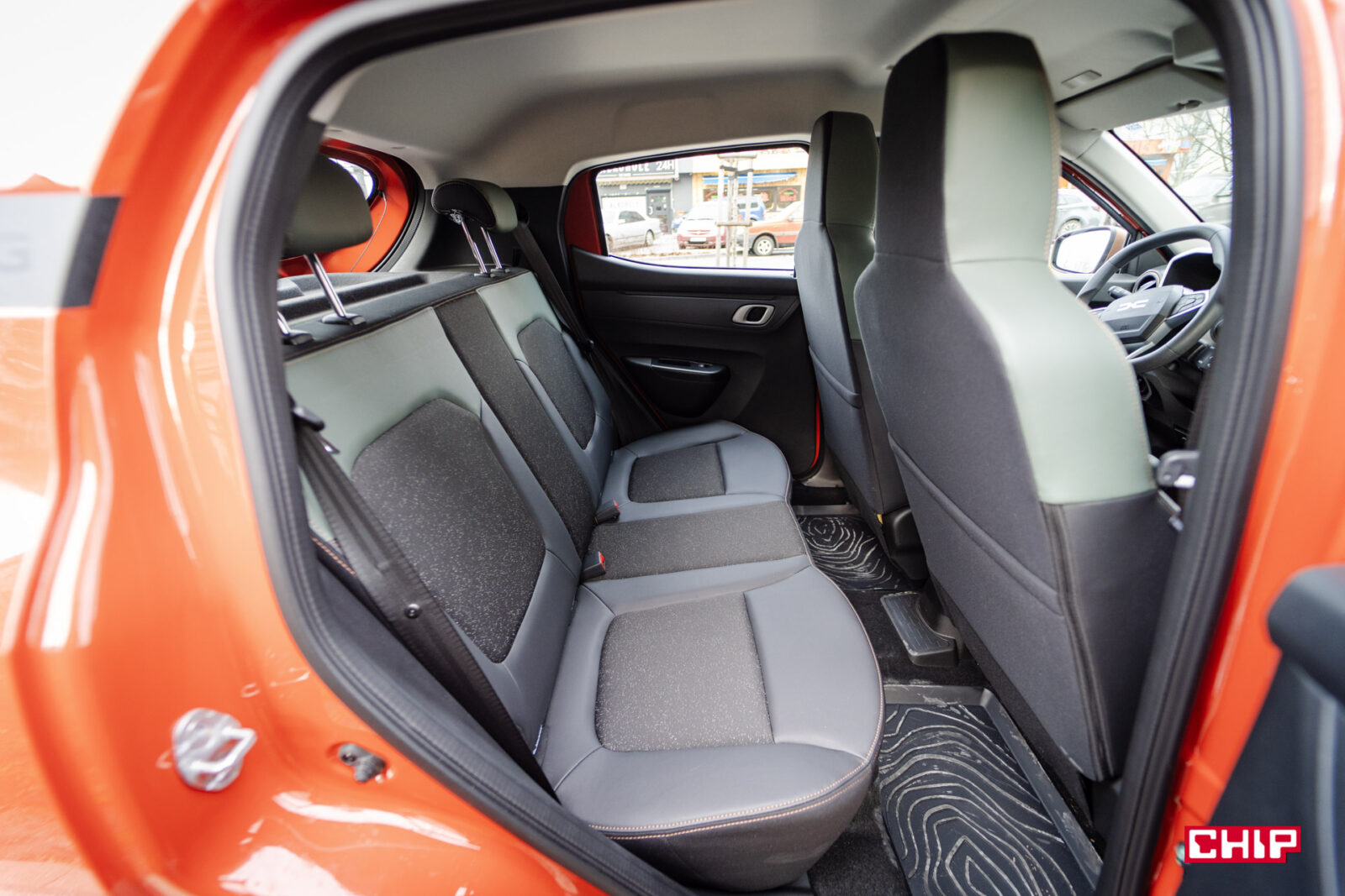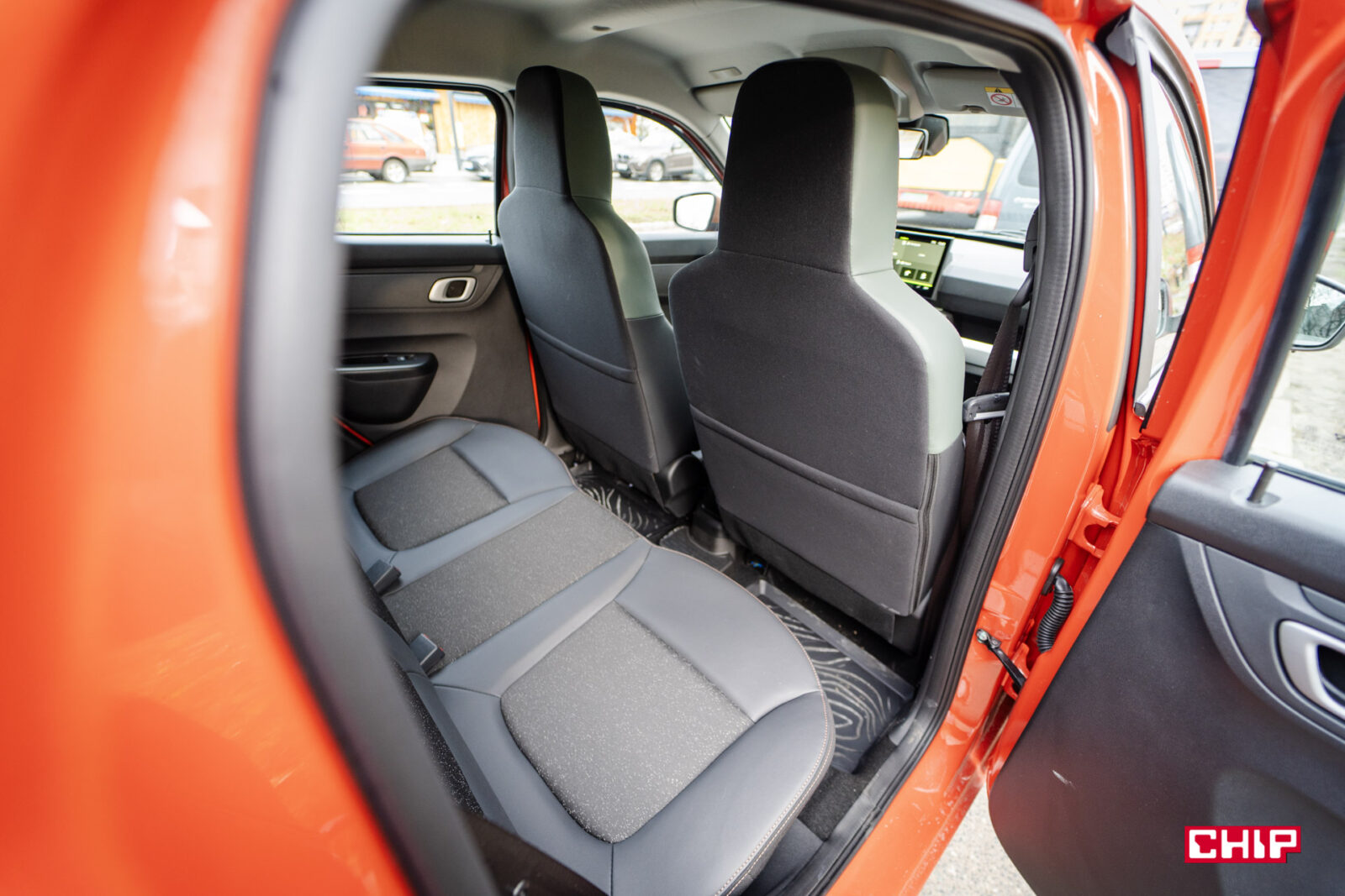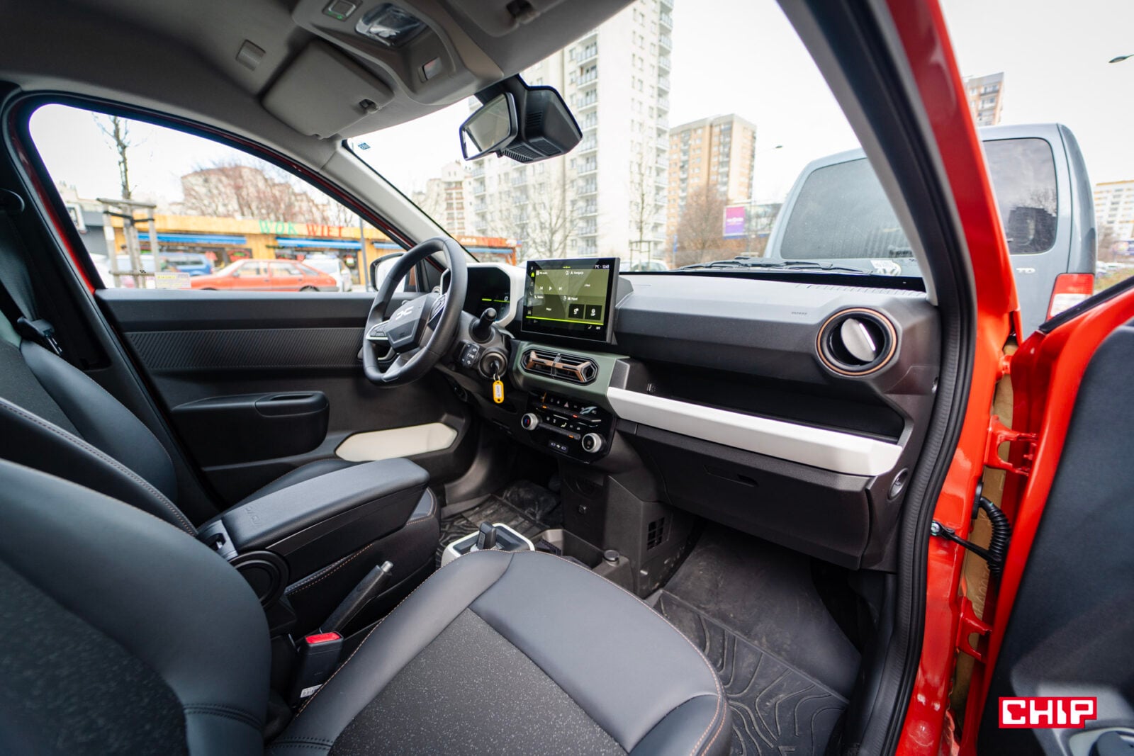 Nie jest to jednak auto dla osób wysokich ze względu na bardzo wysoko osadzone fotele, bez opcji regulacji. Przez co wyższe osoby mają oczy dosłownie prawie na wysokości końca przedniej szyby i to nie tylko wymaga przyzwyczajenia, ale też ogranicza pole widzenia. Z drugiej strony mamy bardzo niskie progi i wysiadanie z Dacii Spring to czysta przyjemność. Zaryzykuje wręcz, że z mało którego auta wysiada się taż tak wygodnie.