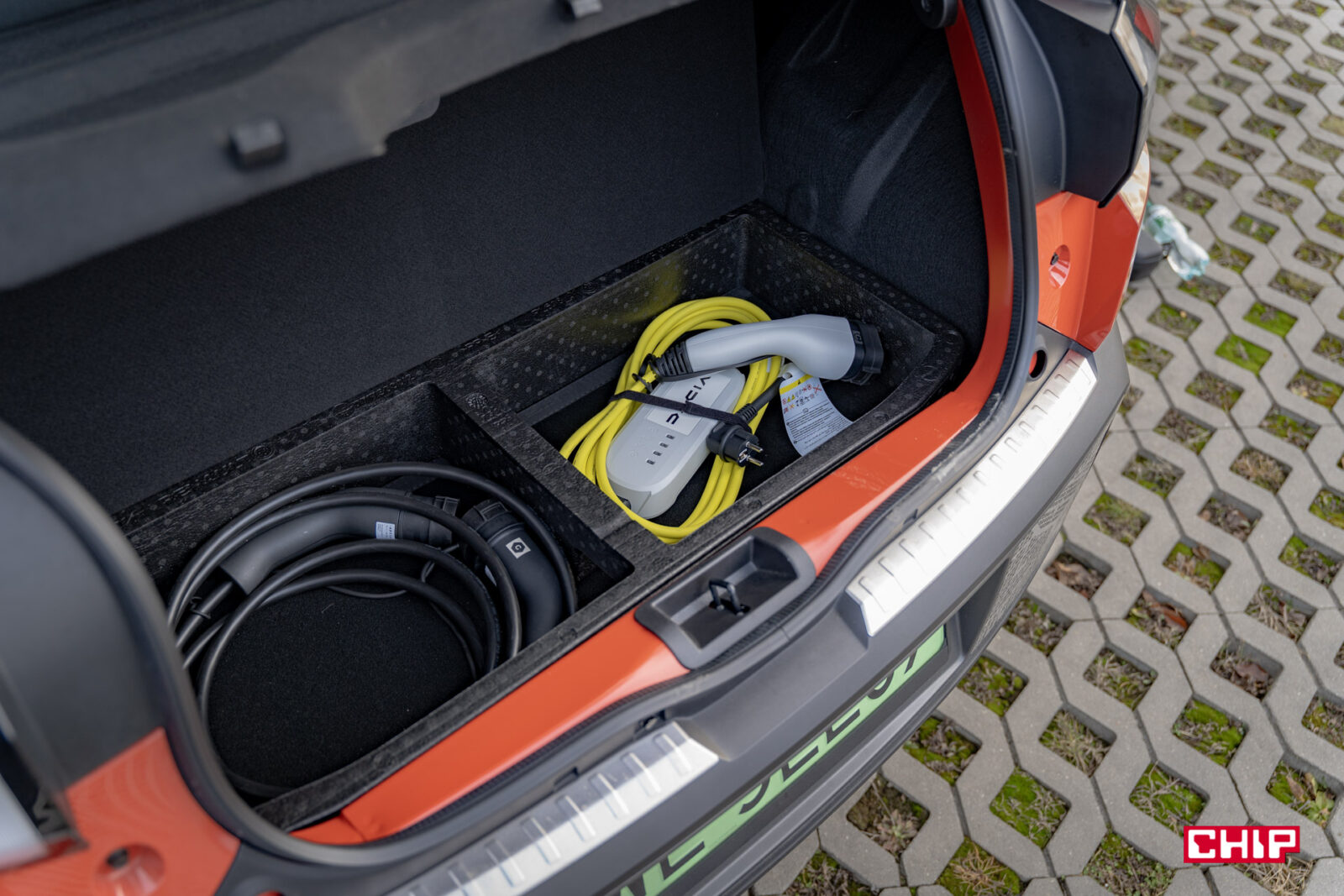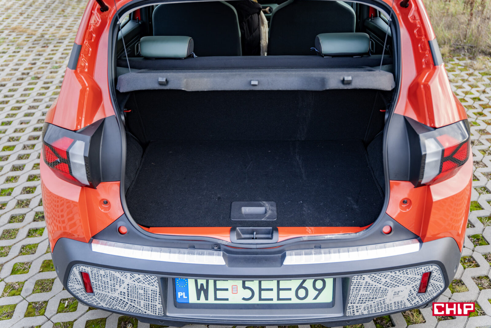 Bagażnik, jak łatwo się domyślić, nie jest duży i ma pojemność 308 litrów. Jest jednak pojemny i byliśmy w stanie zmieścić w nim dużo sprzętu do nagrań, w tym statywy mieszczące się w poprzek, a to już spory wyczyn w tak małym aucie. Duży plus za miejsce na kable do ładowania pod podłogą, więc nie zabierają nam przestrzeni. Dodatkowy schowek znajdziemy z przodu, pod maską. Jest on tak mały, że producent nawet nie uwzględnia go w wymiarach cennikowych. Zmieścimy tam dosłownie większą reklamówkę z zakupami.