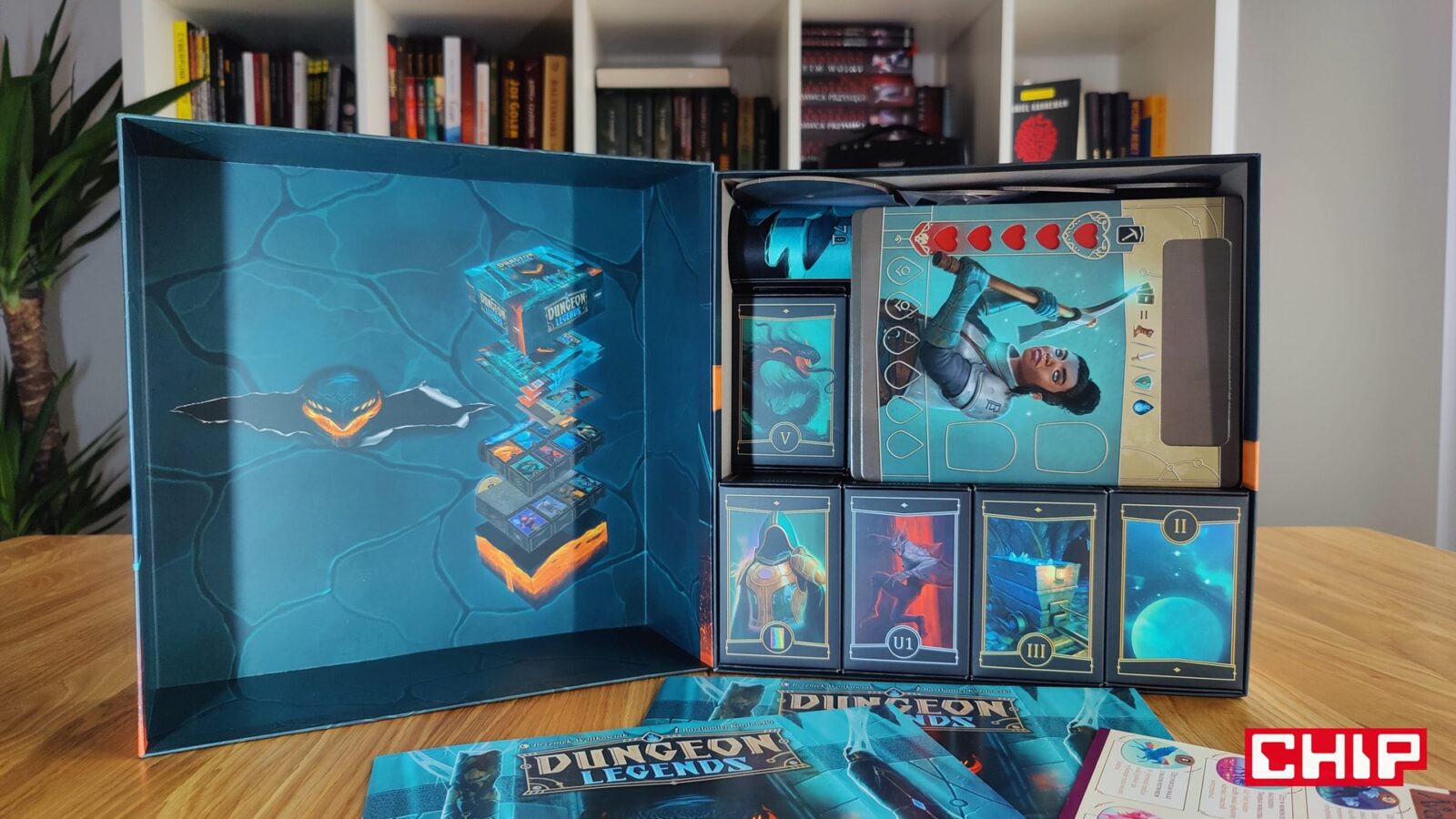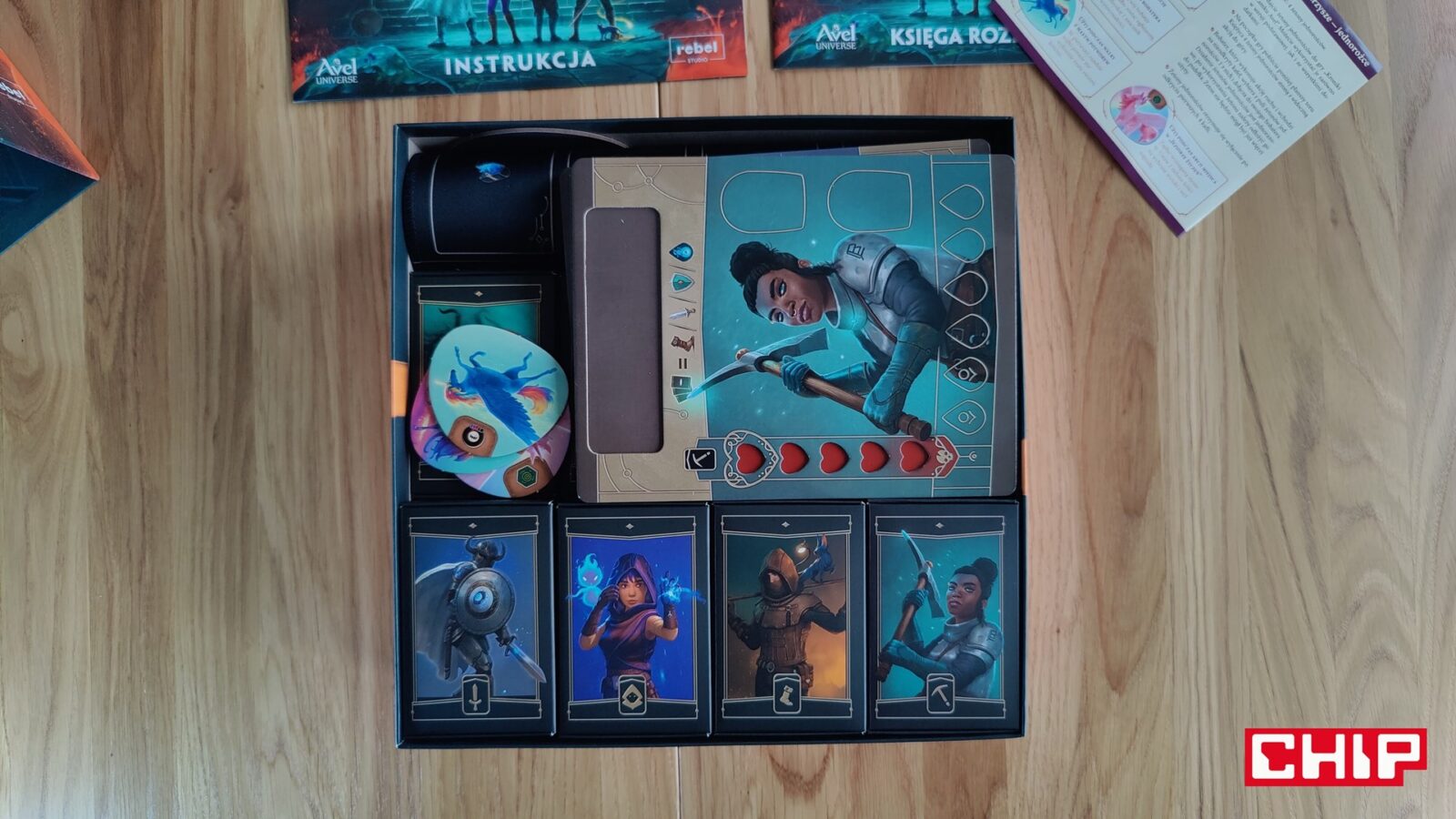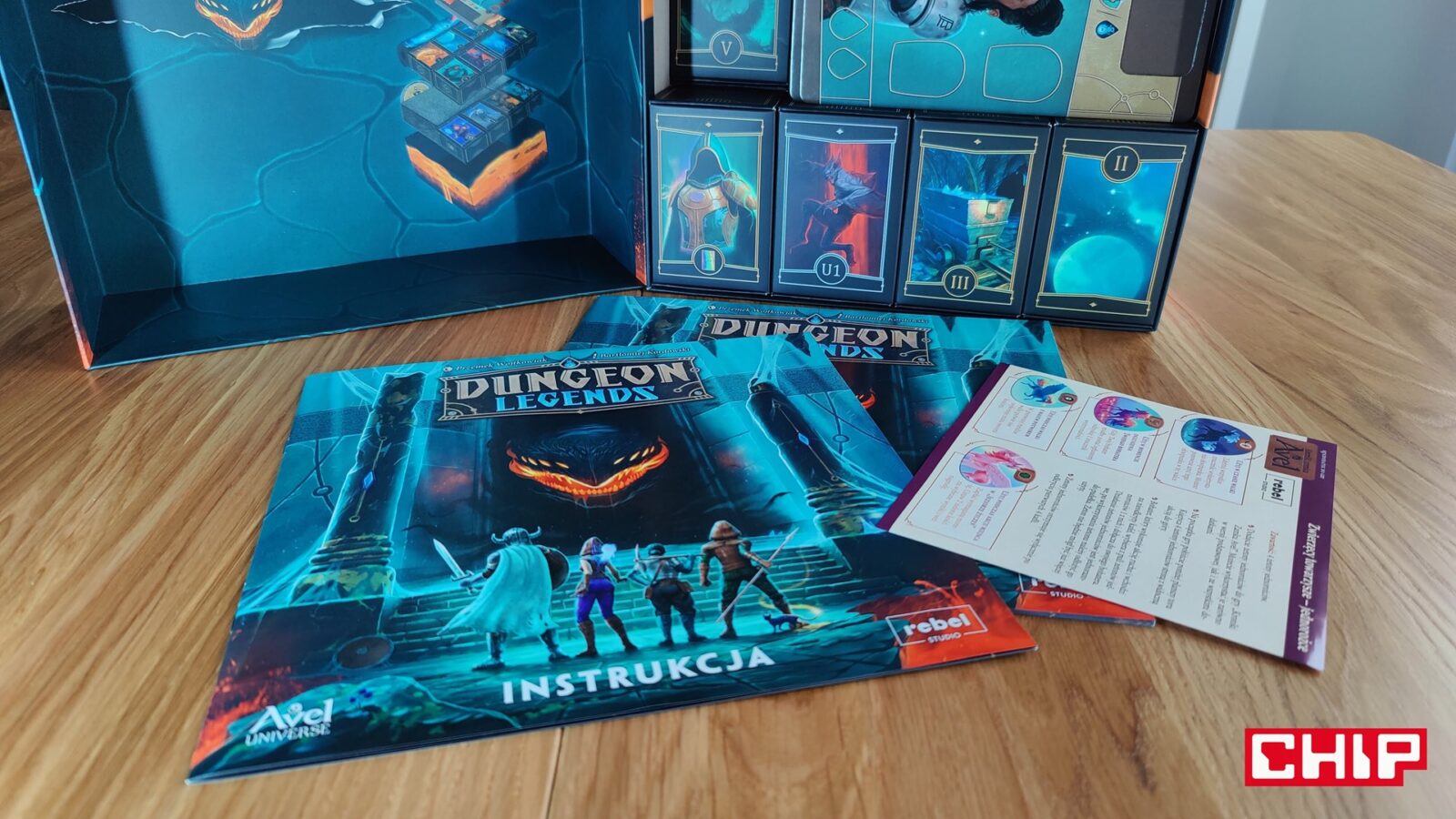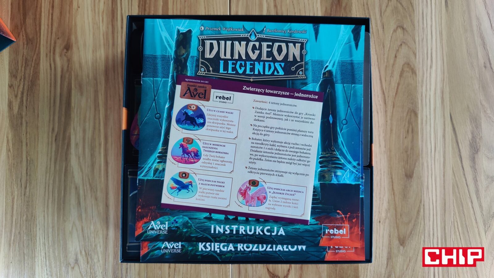Po wyłamaniu wszystkich elementów z tekturowych plansz oraz złożeniu specjalnych pudełek-skrzynek dostajecie bowiem świetnie posegregowane elementy w łącznie 12 pudełkach, dzięki czemu proces rozkładania Dungeon Legends nie jest koszmarem, jak to zwykle ma miejsce przy tego typu większych planszówkach. Wtedy ważną rolę odgrywa nawet wspomniana pianka, o czym dowiadujecie się z widocznej na spodzie wieczka instrukcji składania. Dzięki takiemu podejściu transportowanie tej gry również nie rodzi problemów natury “o nie, jeden wybój i wszystko się pomiesza”, bo finalnie w kartonie poza pudełeczkami zostaną tylko planszetki postaci, zawartość mini-dodatku z jednorożcami do innej gry Kroniki zamku Avel, mata do gry, instrukcja oraz księga rozdziałów.
