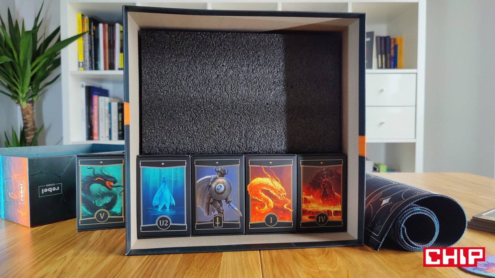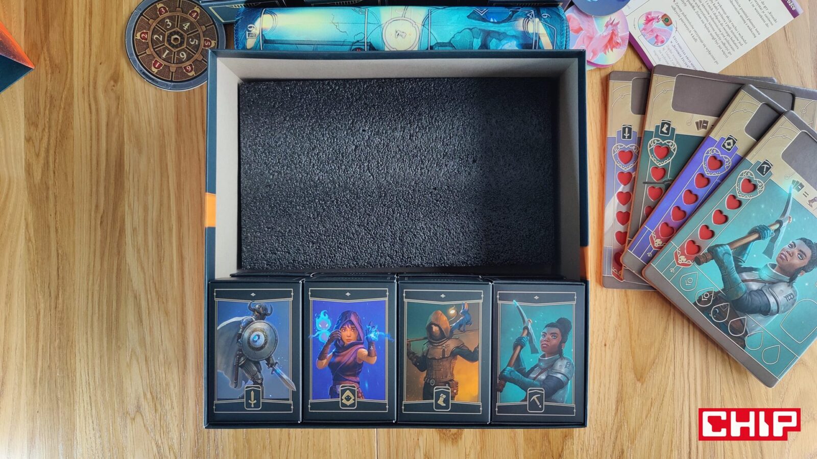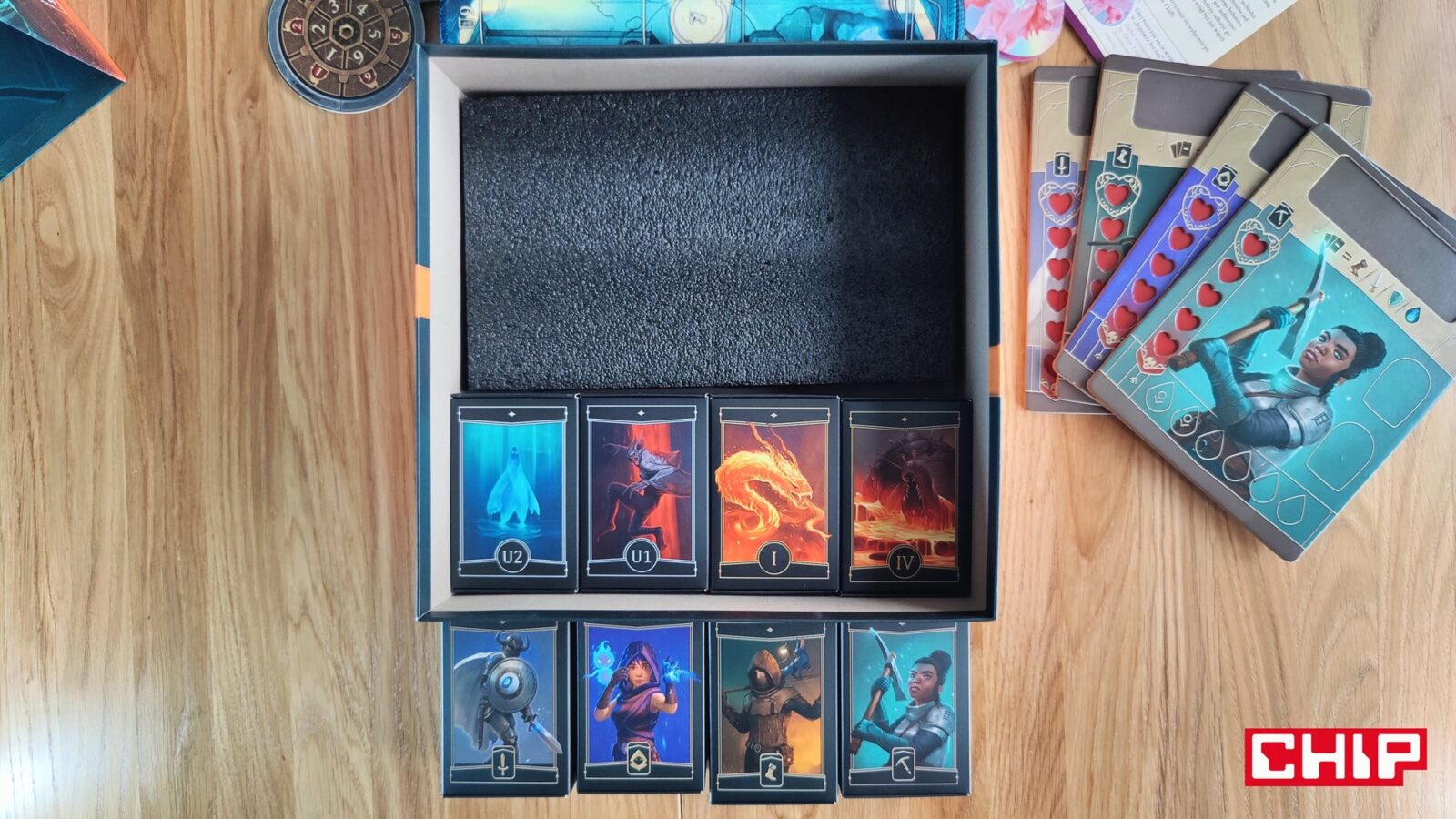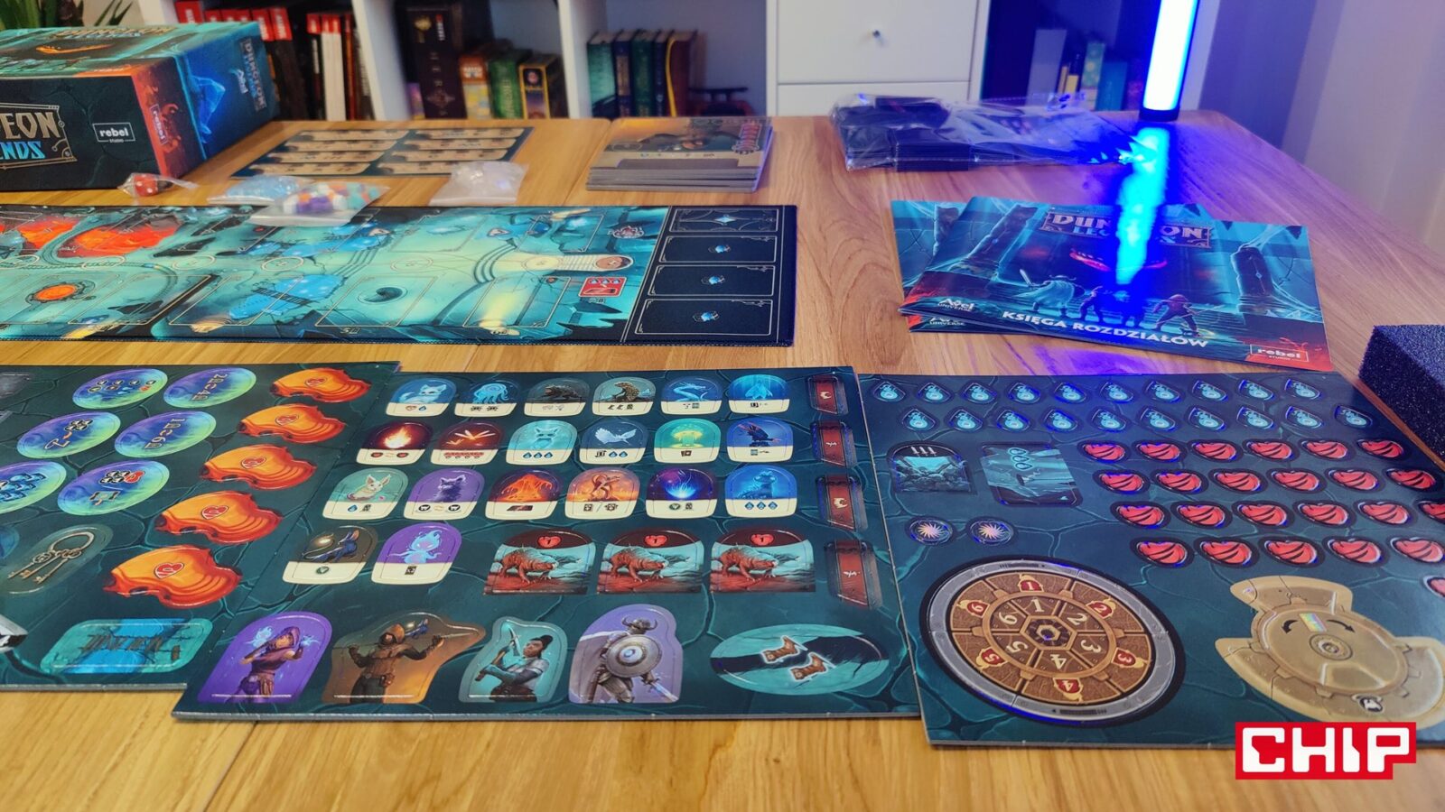Po wyłamaniu wszystkich elementów z tekturowych plansz oraz złożeniu specjalnych pudełek-skrzynek dostajecie bowiem świetnie posegregowane elementy w łącznie 12 pudełkach, dzięki czemu proces rozkładania Dungeon Legends nie jest koszmarem, jak to zwykle ma miejsce przy tego typu większych planszówkach. Wtedy ważną rolę odgrywa nawet wspomniana pianka, o czym dowiadujecie się z widocznej na spodzie wieczka instrukcji składania. Dzięki takiemu podejściu transportowanie tej gry również nie rodzi problemów natury “o nie, jeden wybój i wszystko się pomiesza”, bo finalnie w kartonie poza pudełeczkami zostaną tylko planszetki postaci, zawartość mini-dodatku z jednorożcami do innej gry Kroniki zamku Avel, mata do gry, instrukcja oraz księga rozdziałów.