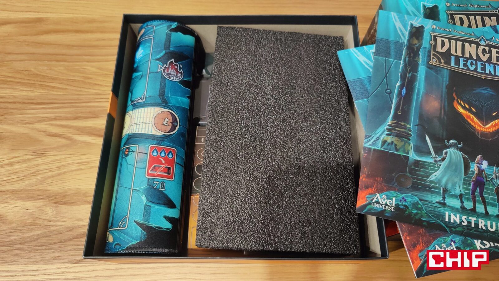 Dungeon Legends to jedna z tych gier planszowych, które wyglądają na znacznie droższe, niż w rzeczywistości są. Początek jednak tego nie sugeruje, bo w przyjemnym dla oka pudełku o rozmiarach 28x28x10 cm, znajdziemy kawałek piankowego wypełnienia rodem z paczki transportowej. Z początku pomyślałem, że to przejaw oszczędności na wyprasce i rzeczywiście tak właśnie jest, ale jeśli zagłębicie się w instrukcję oraz komponenty tej gry planszowej, to odkryjecie, że twórcy zastosowali w swoim dziele bardzo ciekawy sposób przechowywania całej zawartości. Niestety jego częścią jest korzystanie właśnie z piankowego wypełnienia, które dla lepszego efektu mogłoby być przyklejone fabrycznie do pudełka, aby nie wprowadzać początkowo użytkownika w błąd.