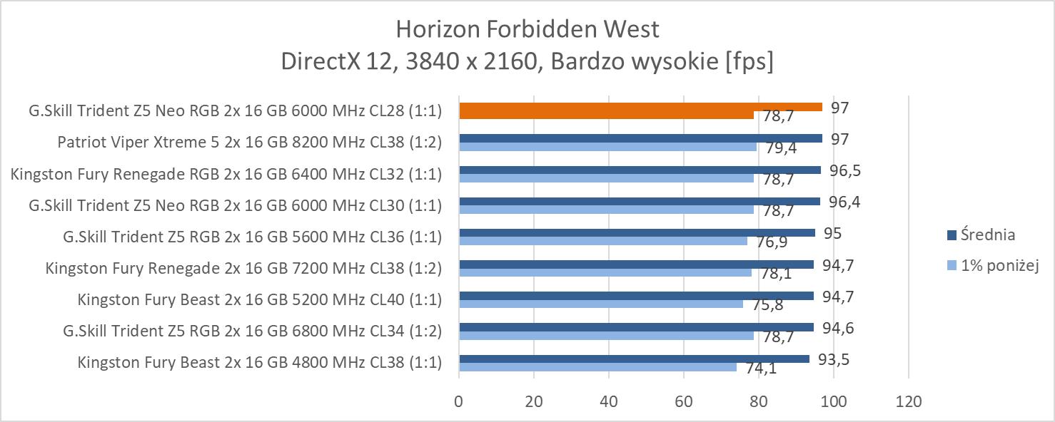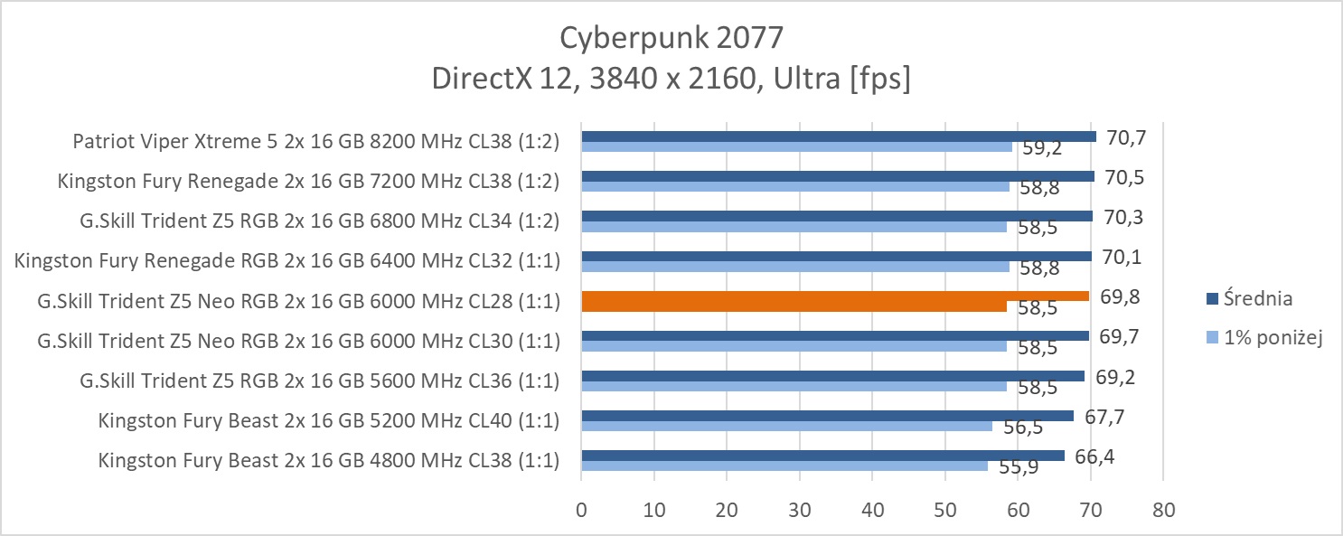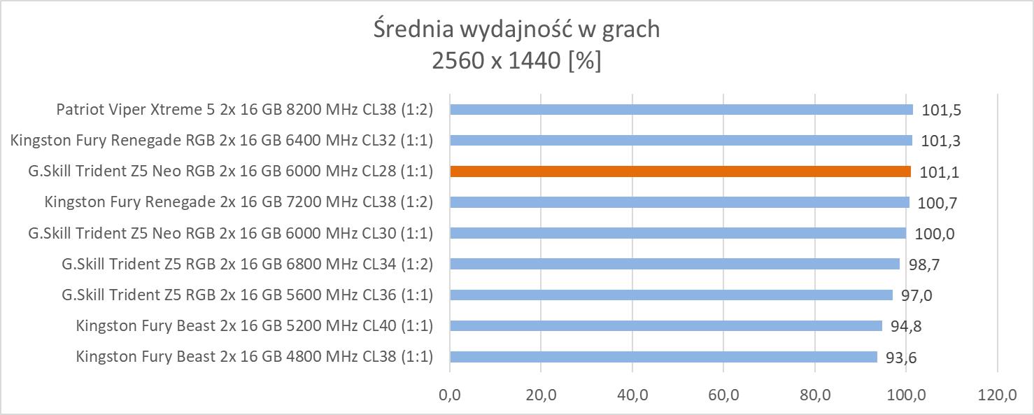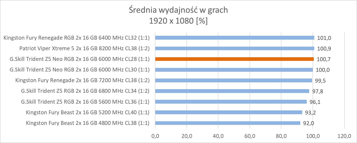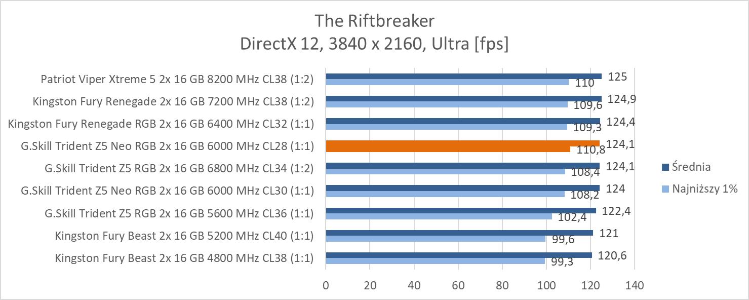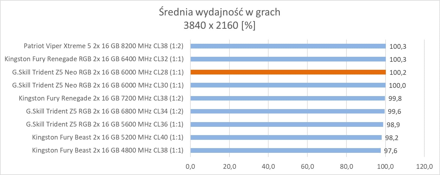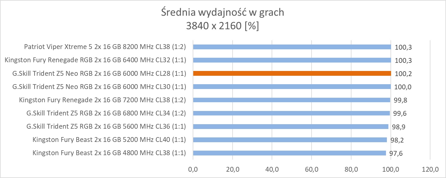 W grach kości wypadają lepiej niż wersja CL30. W Full HD różnica wynosi 0,7%, w 2560 x 1440 1,1%, ale w 3840 x 2160 tylko 0,2%. Widać więc, że różnice ponownie nie są bardzo duże, ale z pewnością występują. Z pewnością są one lepszym wyborem niż 7200 CL38, wyniki stawiają też pod wątpliwość sens zakupu 8000 CL38 – różnice naprawdę są bardzo niskie.