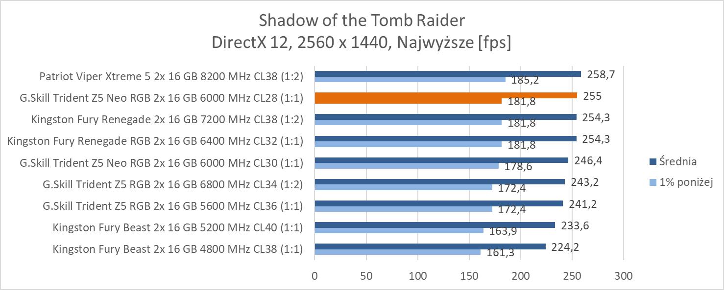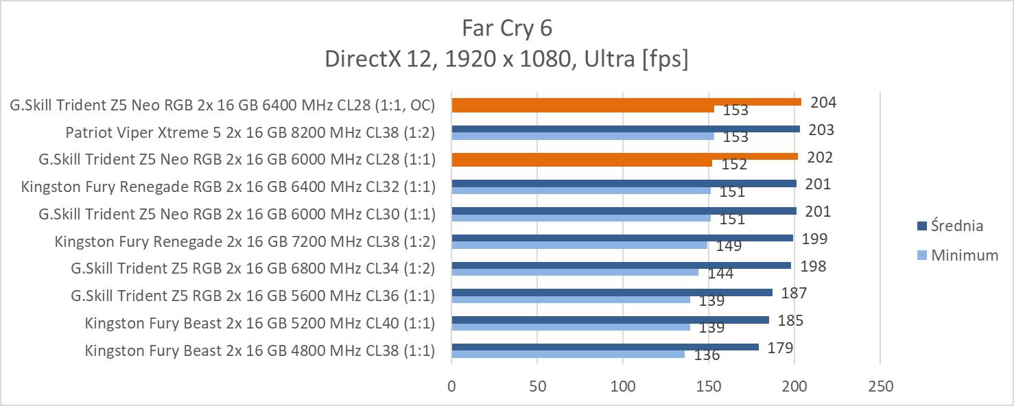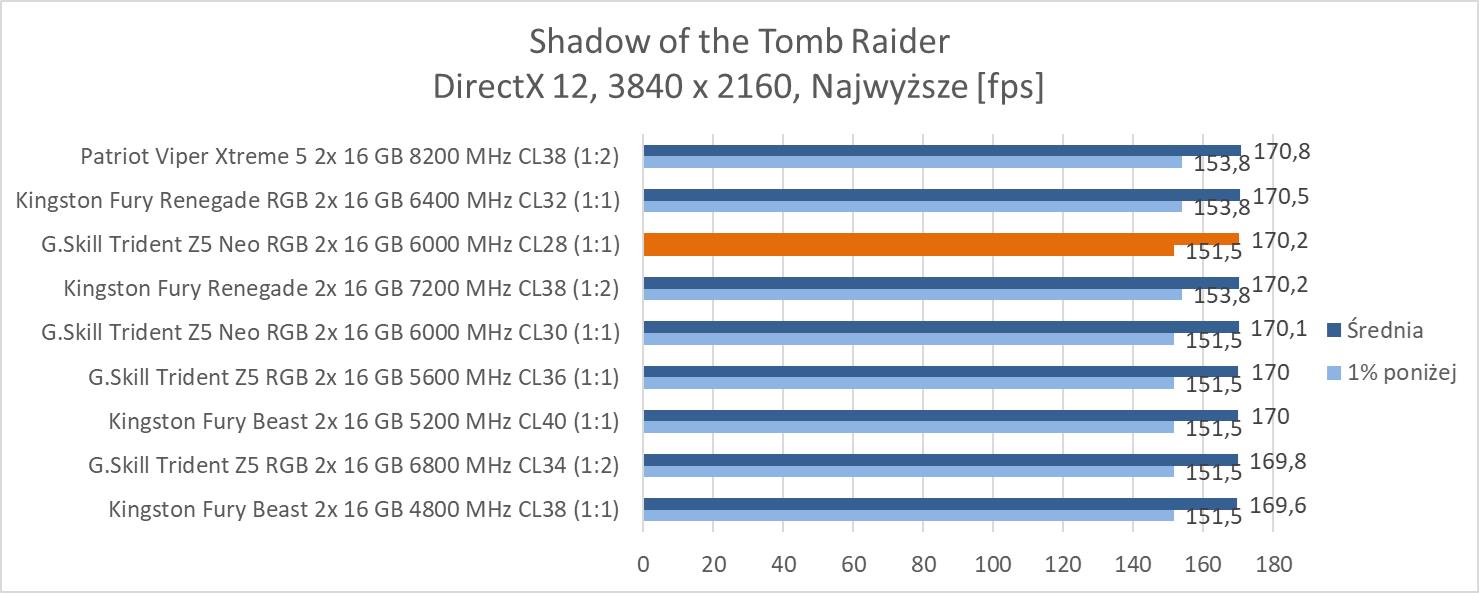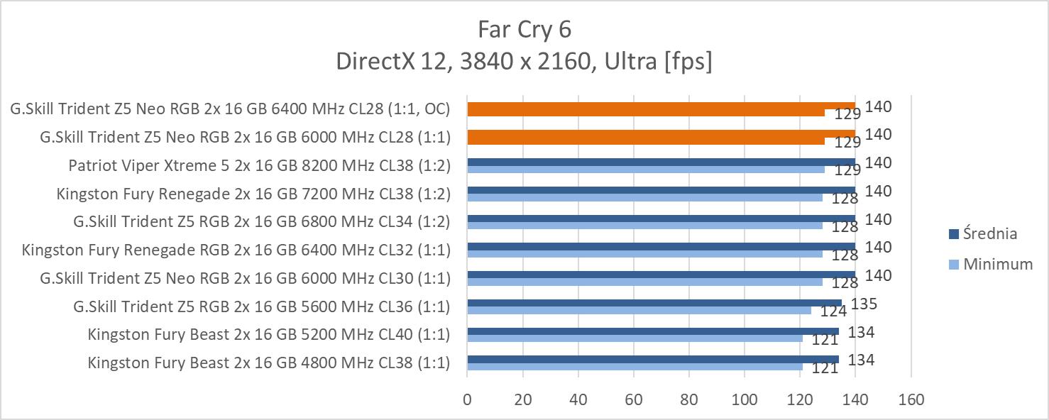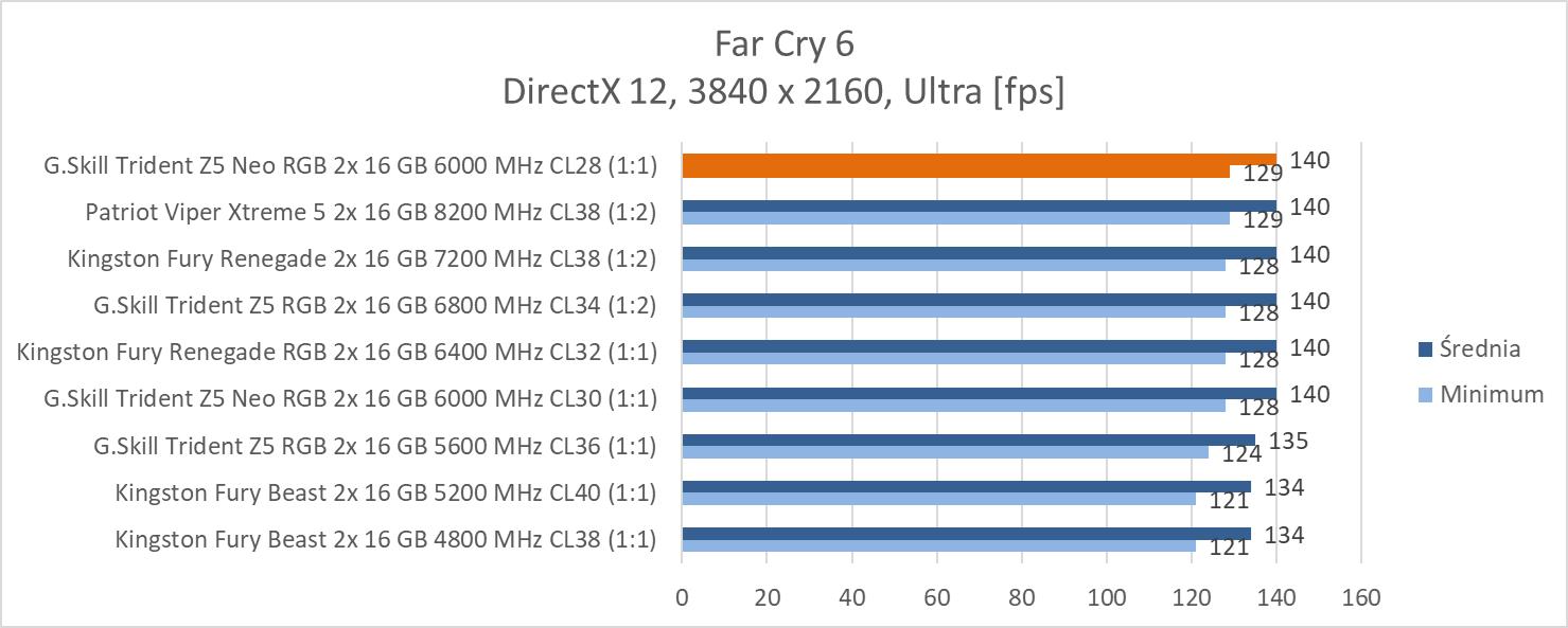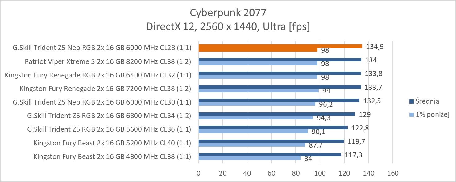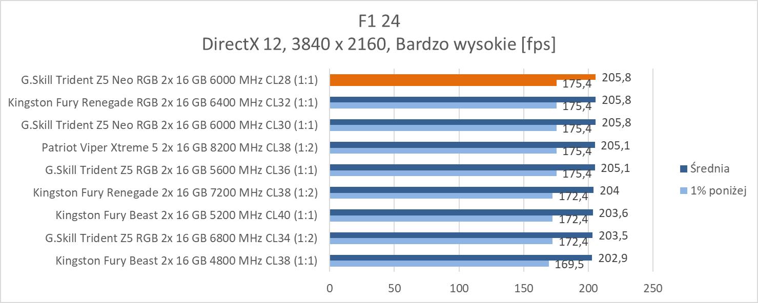 W grach kości wypadają lepiej niż wersja CL30. W Full HD różnica wynosi 0,7%, w 2560 x 1440 1,1%, ale w 3840 x 2160 tylko 0,2%. Widać więc, że różnice ponownie nie są bardzo duże, ale z pewnością występują. Z pewnością są one lepszym wyborem niż 7200 CL38, wyniki stawiają też pod wątpliwość sens zakupu 8000 CL38 – różnice naprawdę są bardzo niskie.