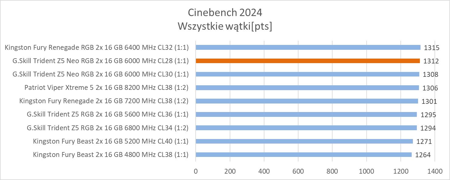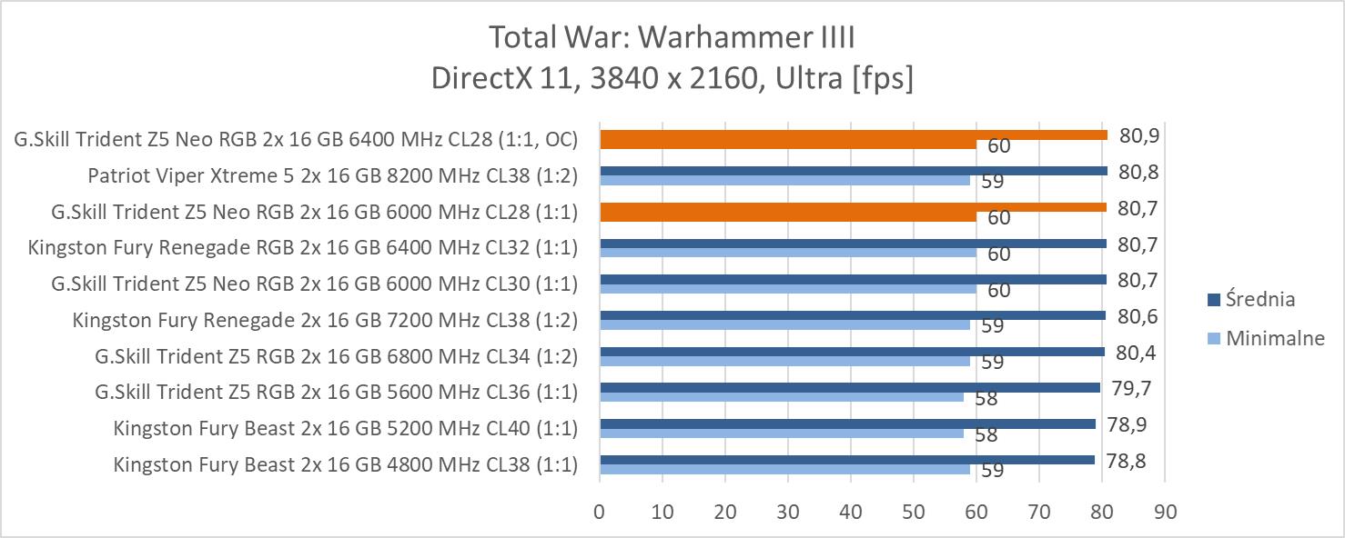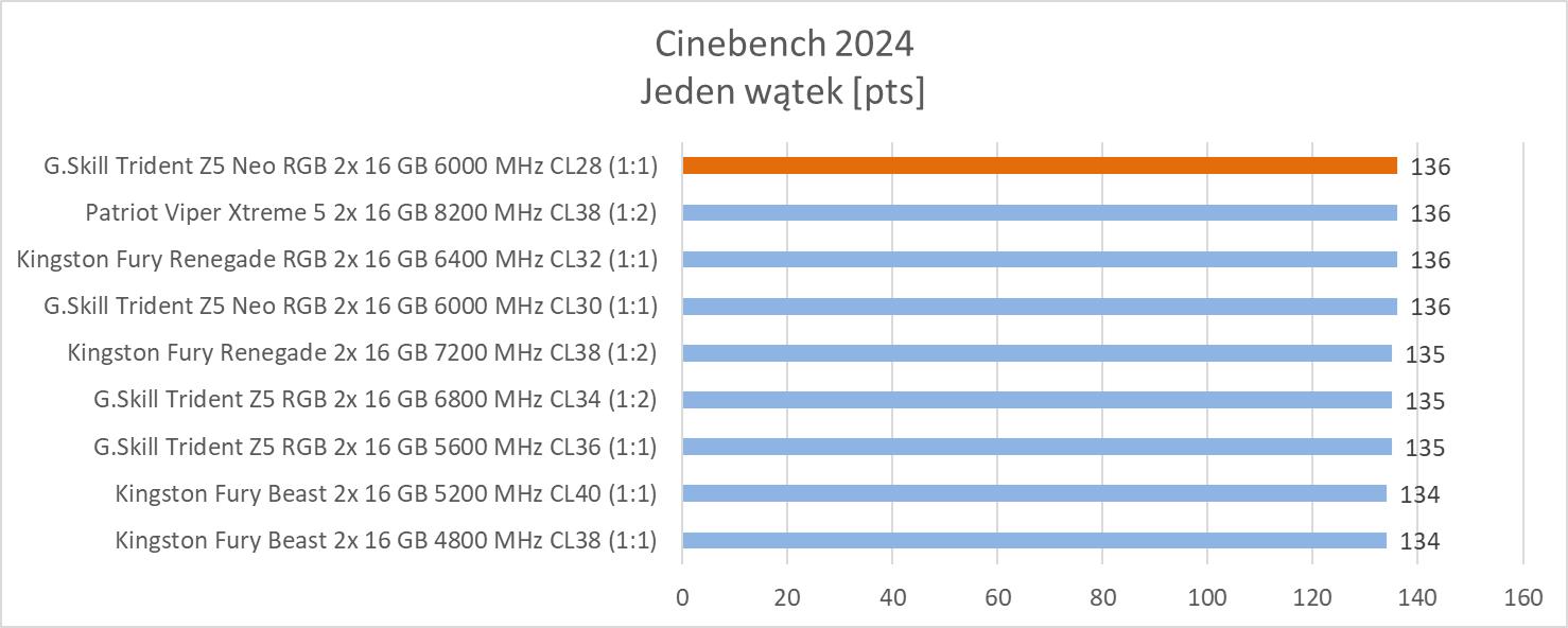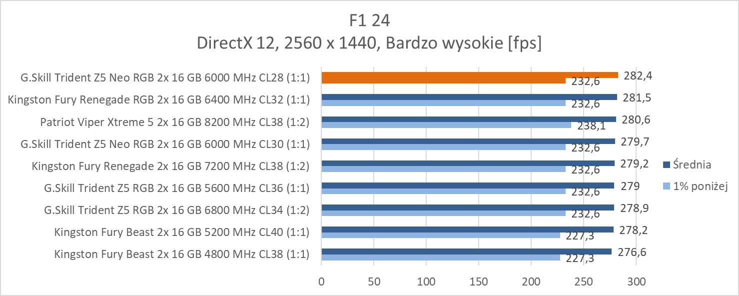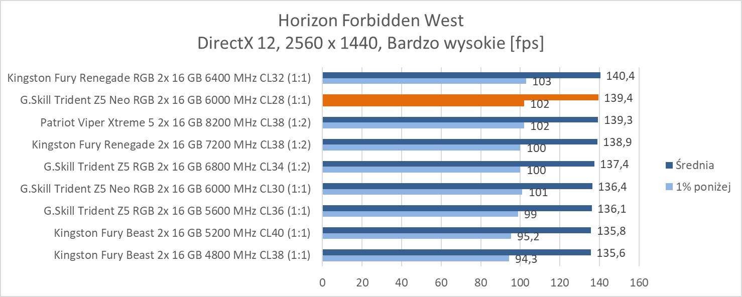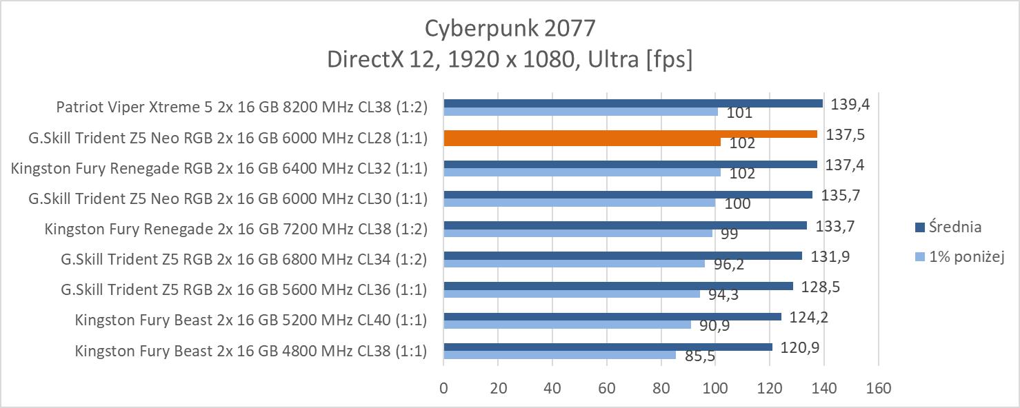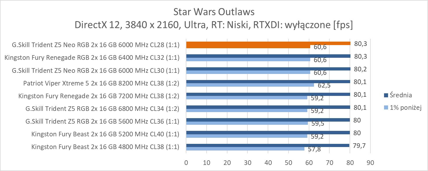 W grach kości wypadają lepiej niż wersja CL30. W Full HD różnica wynosi 0,7%, w 2560 x 1440 1,1%, ale w 3840 x 2160 tylko 0,2%. Widać więc, że różnice ponownie nie są bardzo duże, ale z pewnością występują. Z pewnością są one lepszym wyborem niż 7200 CL38, wyniki stawiają też pod wątpliwość sens zakupu 8000 CL38 – różnice naprawdę są bardzo niskie.