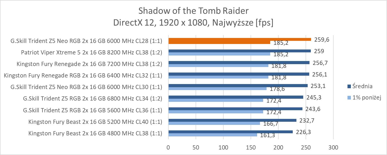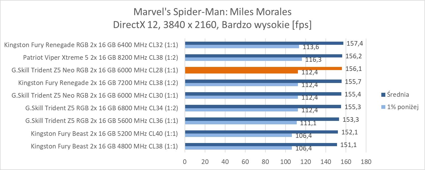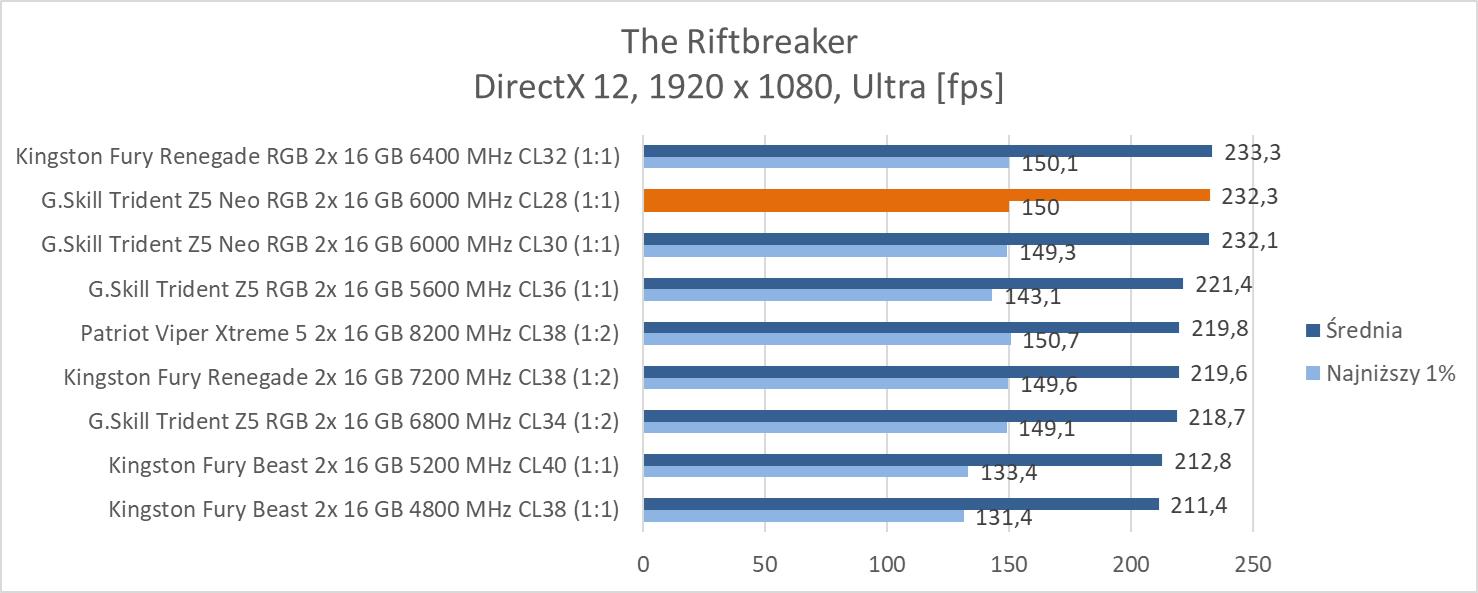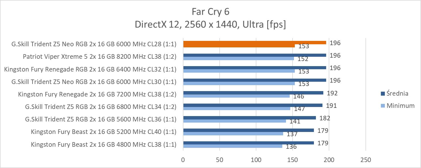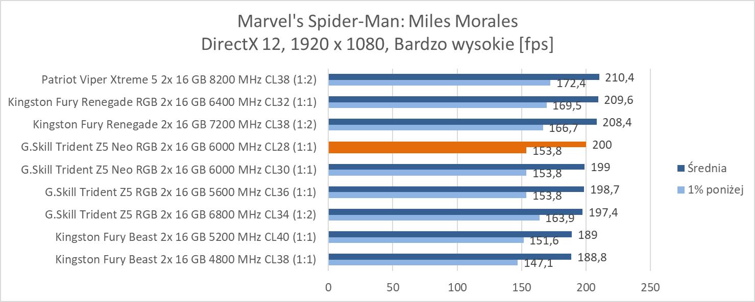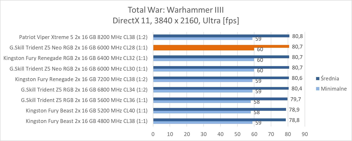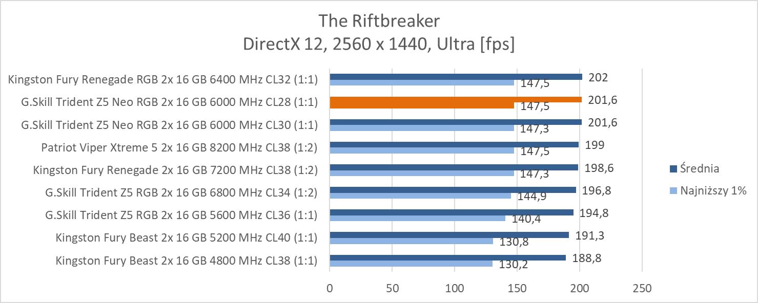 W grach kości wypadają lepiej niż wersja CL30. W Full HD różnica wynosi 0,7%, w 2560 x 1440 1,1%, ale w 3840 x 2160 tylko 0,2%. Widać więc, że różnice ponownie nie są bardzo duże, ale z pewnością występują. Z pewnością są one lepszym wyborem niż 7200 CL38, wyniki stawiają też pod wątpliwość sens zakupu 8000 CL38 – różnice naprawdę są bardzo niskie.