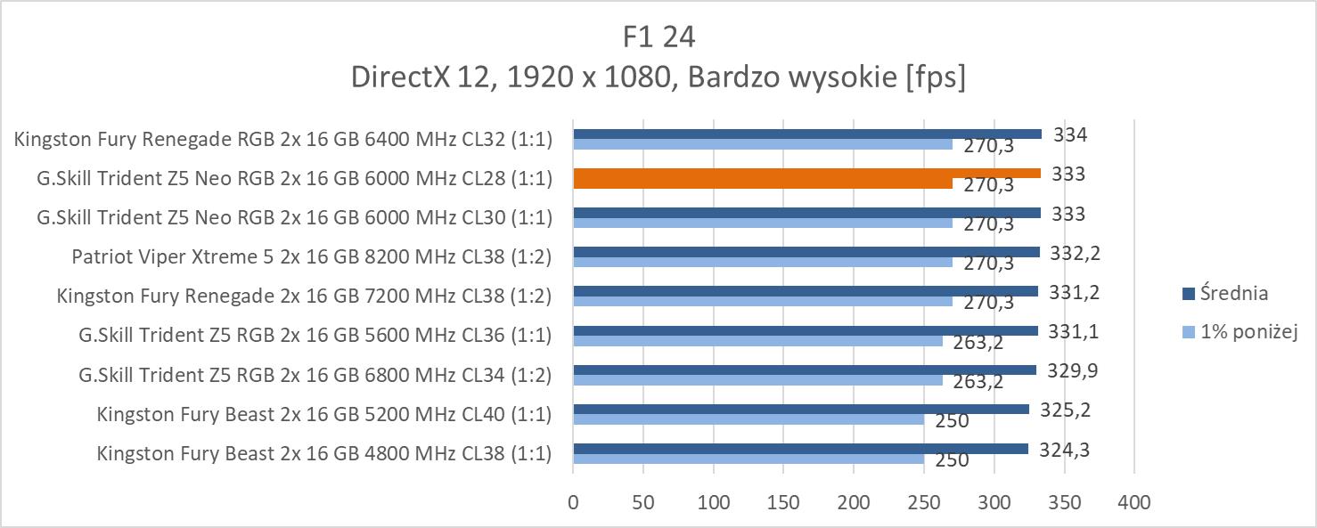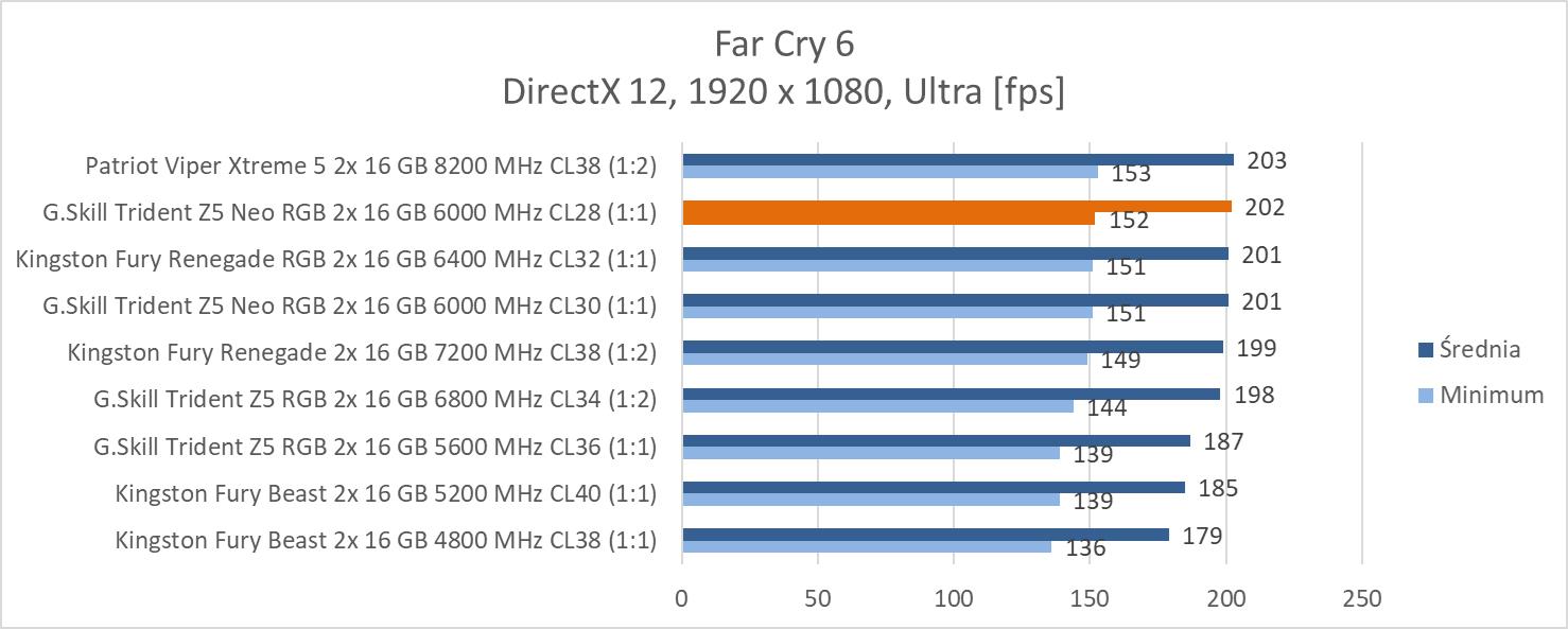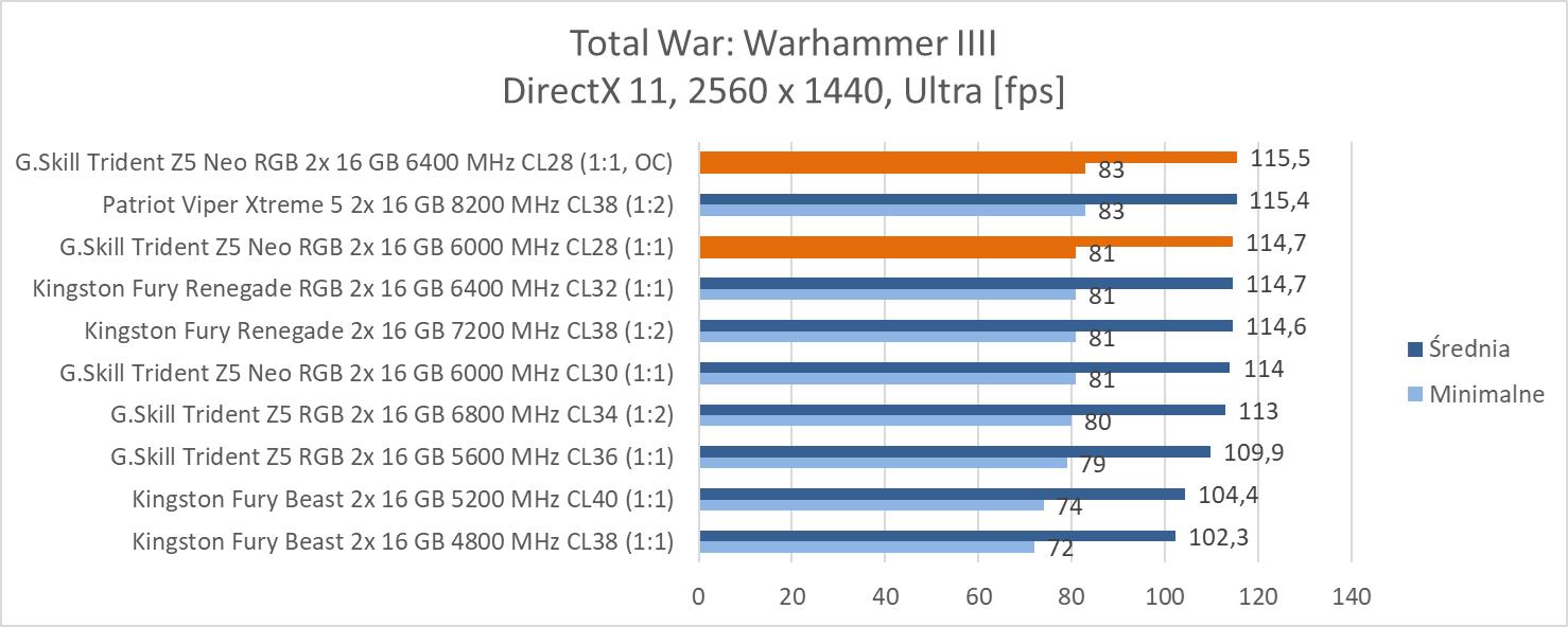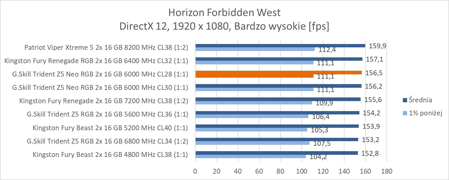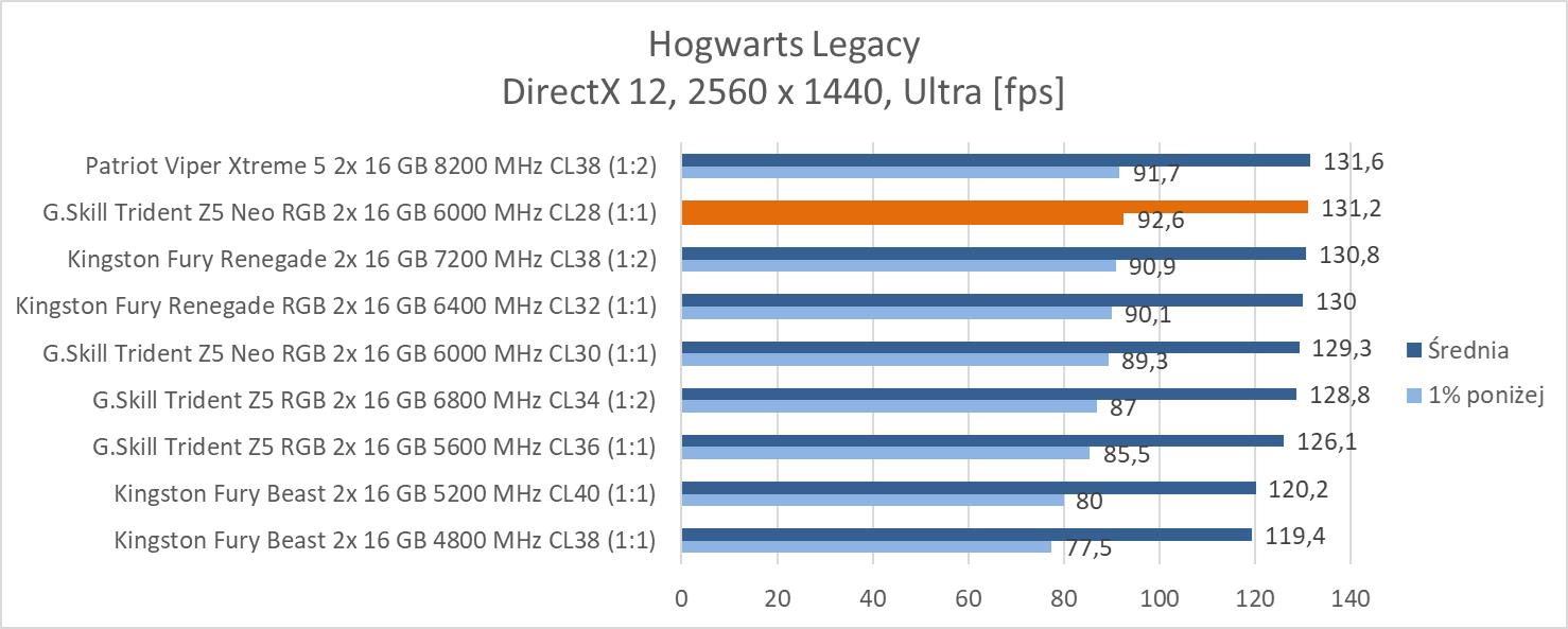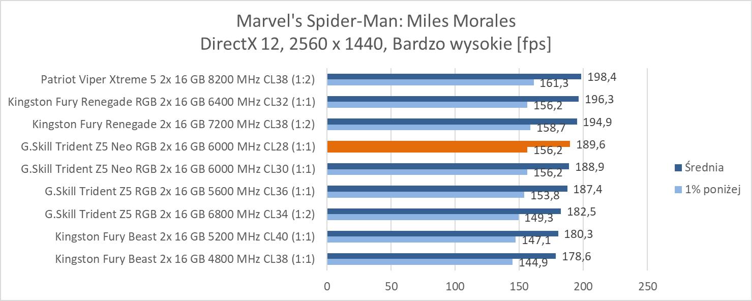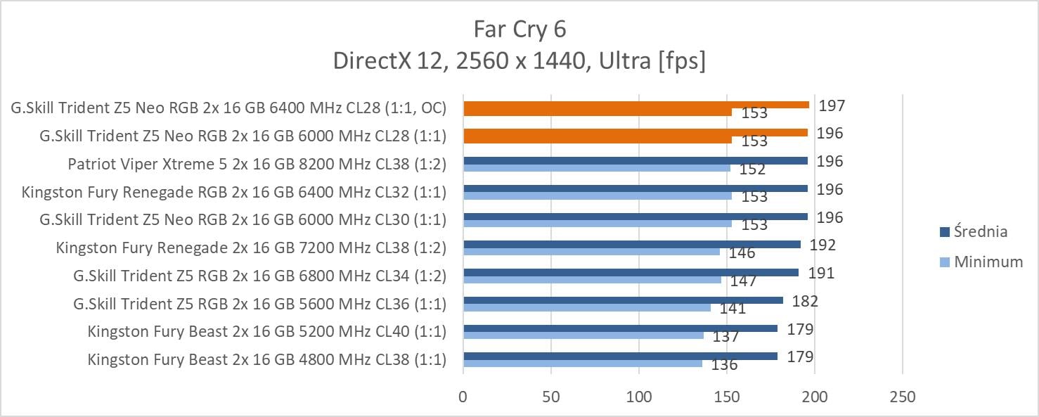 W grach kości wypadają lepiej niż wersja CL30. W Full HD różnica wynosi 0,7%, w 2560 x 1440 1,1%, ale w 3840 x 2160 tylko 0,2%. Widać więc, że różnice ponownie nie są bardzo duże, ale z pewnością występują. Z pewnością są one lepszym wyborem niż 7200 CL38, wyniki stawiają też pod wątpliwość sens zakupu 8000 CL38 – różnice naprawdę są bardzo niskie.