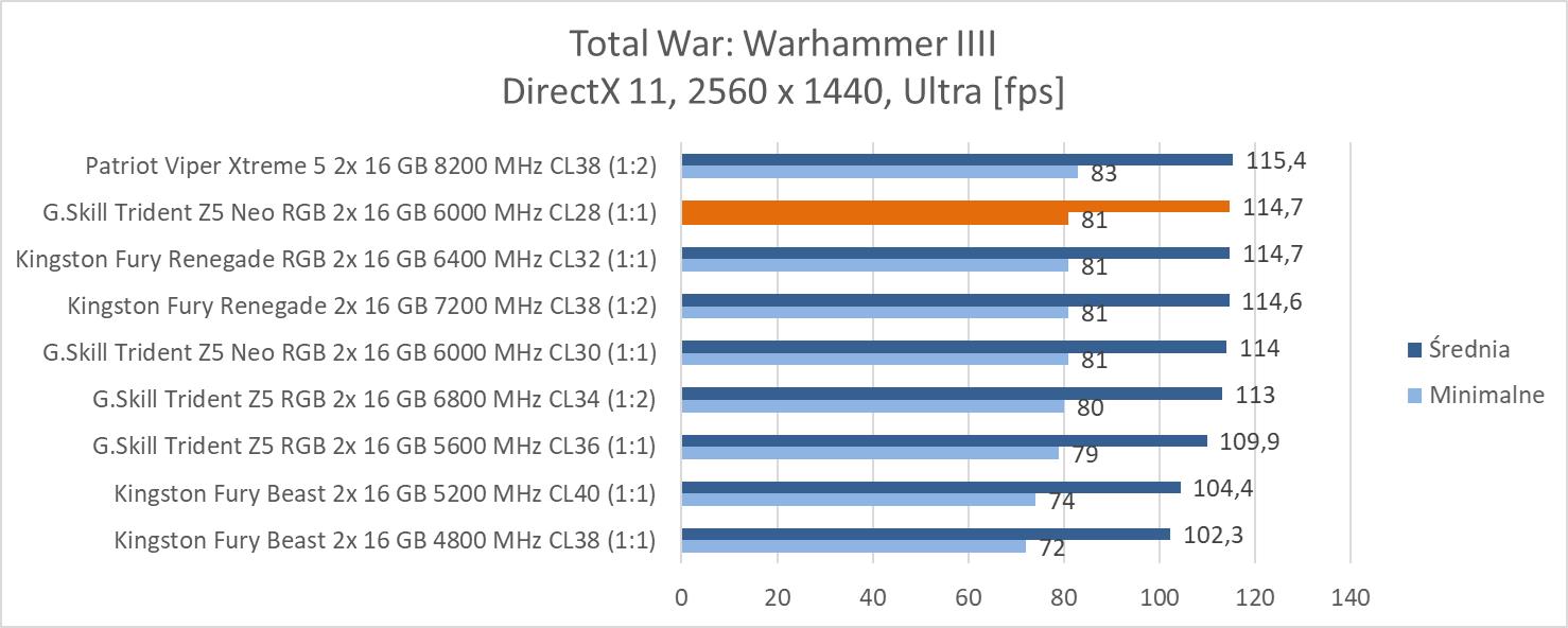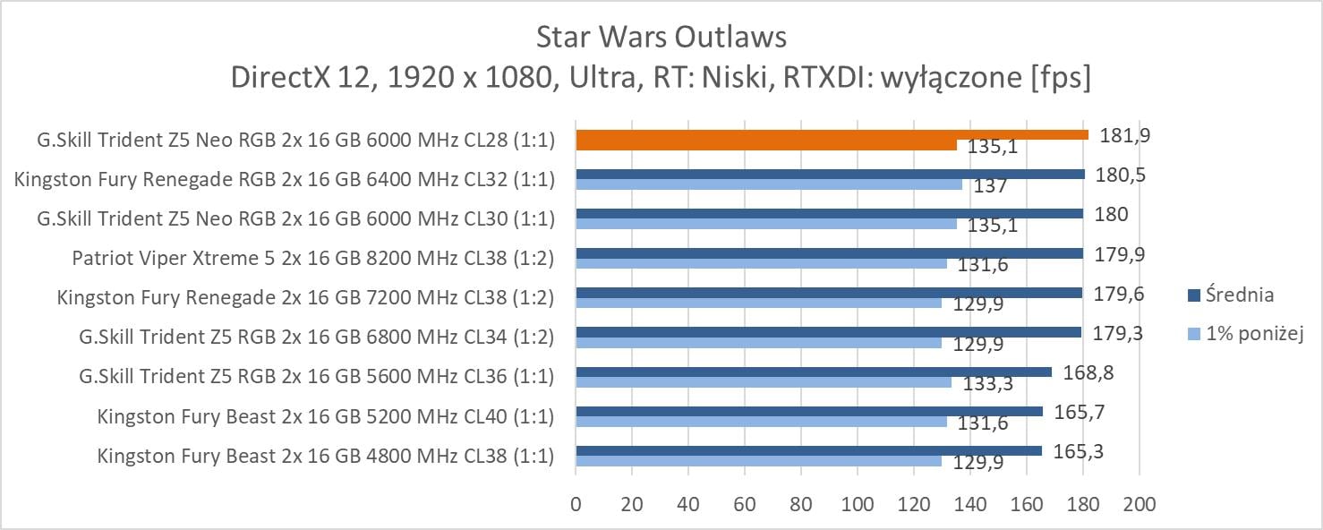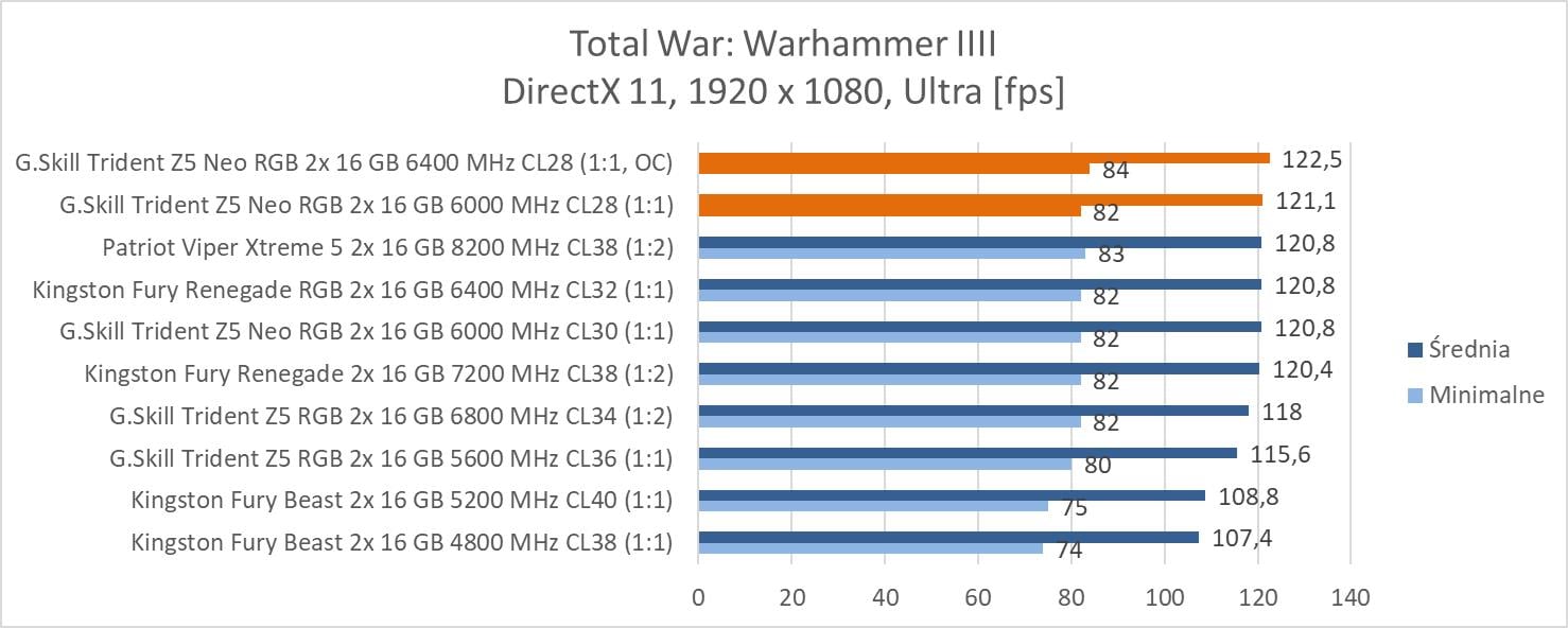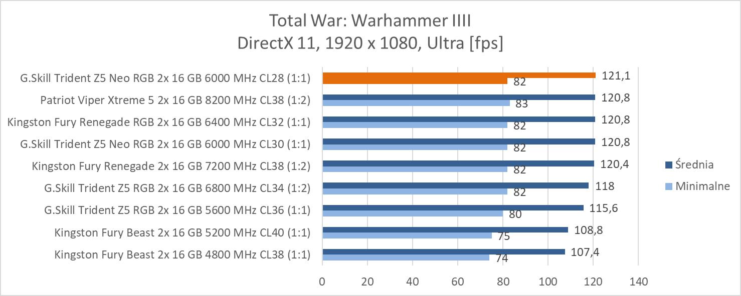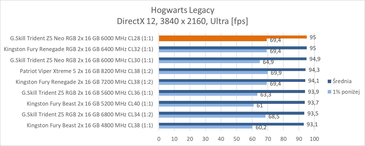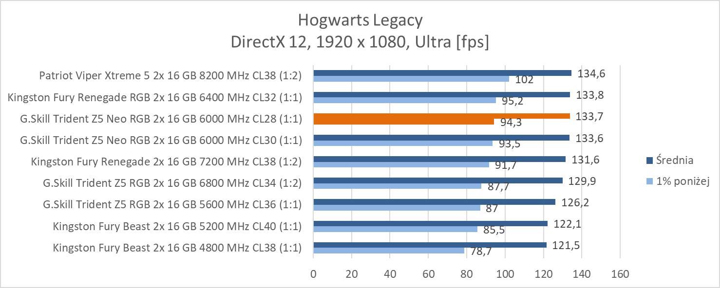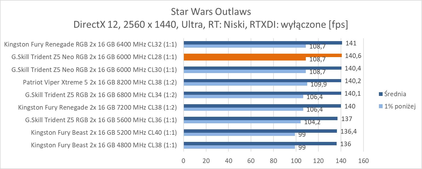 W grach kości wypadają lepiej niż wersja CL30. W Full HD różnica wynosi 0,7%, w 2560 x 1440 1,1%, ale w 3840 x 2160 tylko 0,2%. Widać więc, że różnice ponownie nie są bardzo duże, ale z pewnością występują. Z pewnością są one lepszym wyborem niż 7200 CL38, wyniki stawiają też pod wątpliwość sens zakupu 8000 CL38 – różnice naprawdę są bardzo niskie.