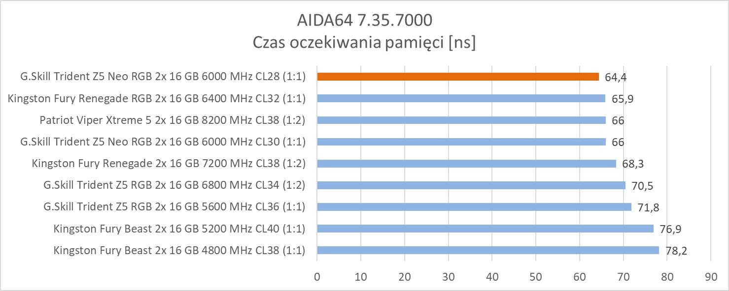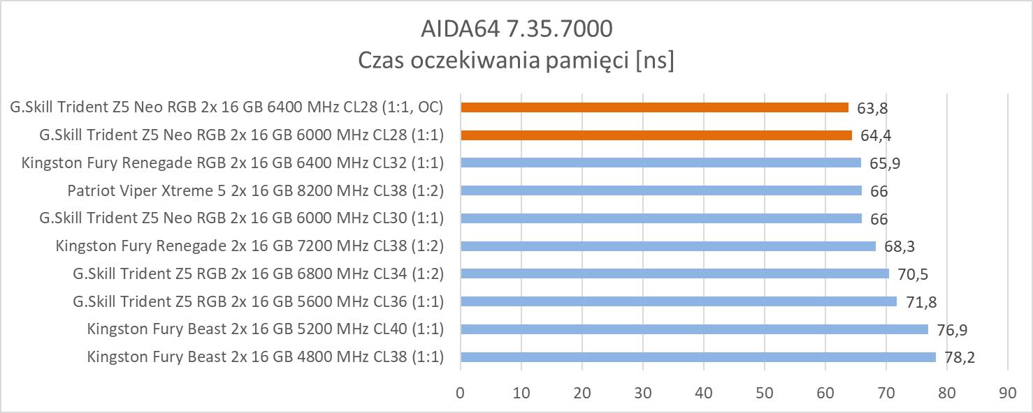 Udało nam się podkręcić pamięci do 6400 MHz przy zachowaniu fabrycznych opóźnień. Wymagało to jednak podniesienia napięcia do 1,5 V. Natomiast udało się to wykonać w trybie 1:1. Przykładowe wyniki tak ustawionych pamięci znajdziecie na wykresach poniżej.