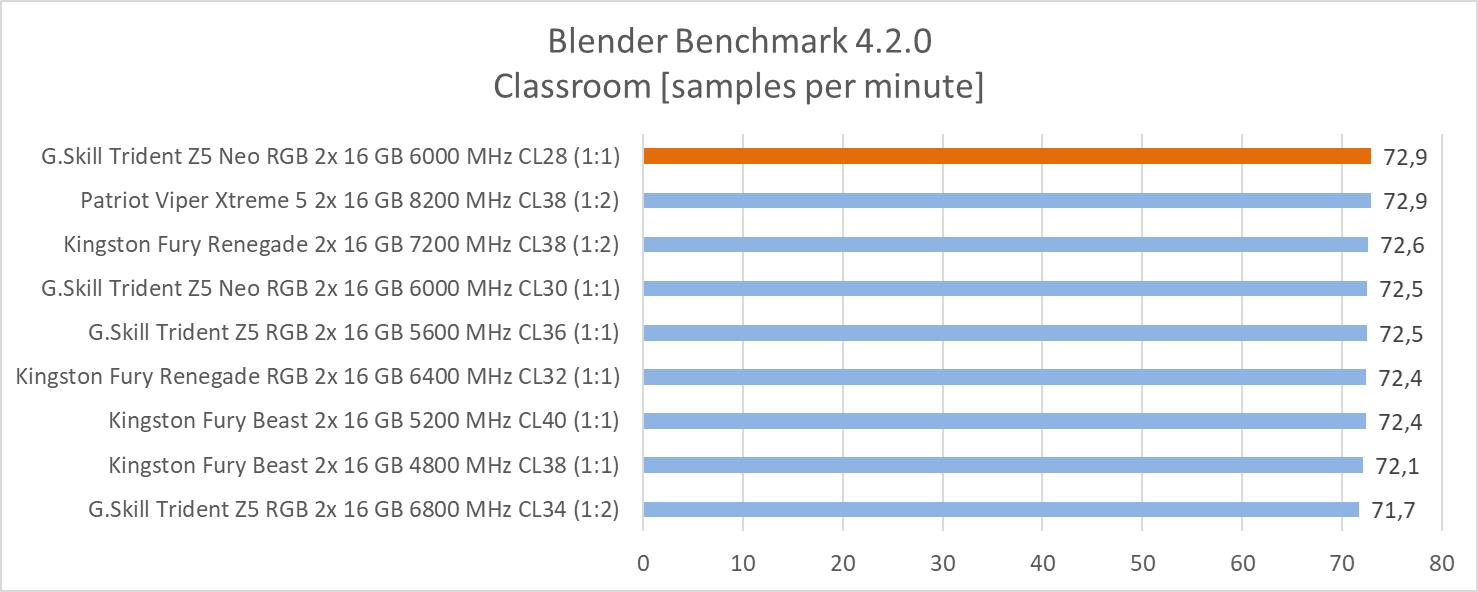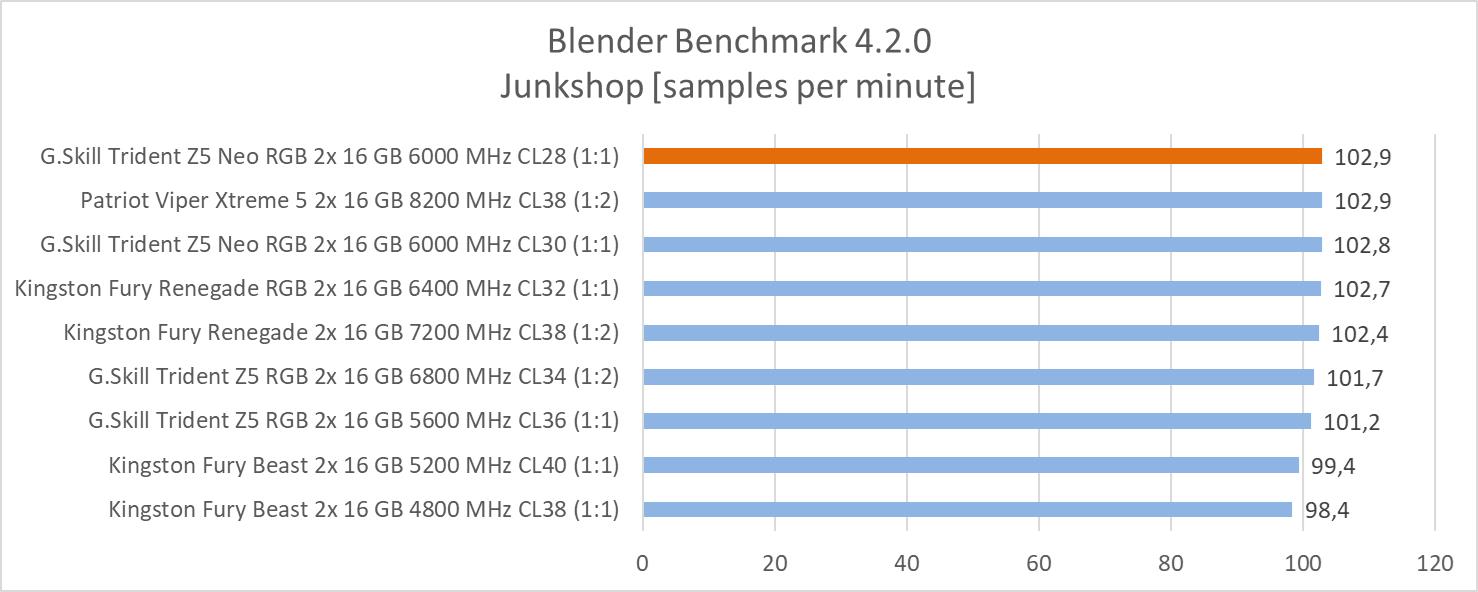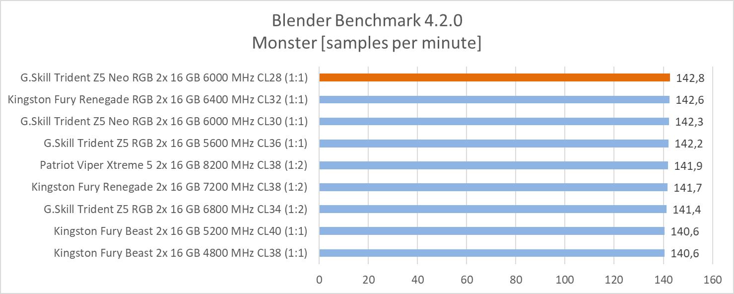 Średnia wydajność w programach stawia pamięci minimalnie nad tymi samymi ale CL30, i minimalnie pod 6400 MHz CL32 czy szybszymi. Widać więc, że różnice nie są duże przynajmniej patrząc na średnią. Natomiast pamięci wypadły najlepiej w te Blendera, Corony, DigiCortex czy AIDA64 przy czasie oczekiwania pamięci. W takich zastosowaniach zdecydowanie warto więc na nie postawić.
