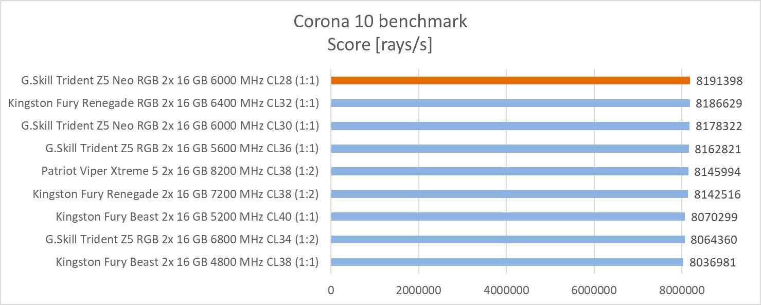 Silnik renderujący Corona dostępny jest Autodesk 3ds Max oraz Cinema 4D. Co ważne, nie wspiera on GPU, więc wydajność CPU jest tutaj kluczowa. W testach skorzystaliśmy z benchmarka przygotowanego przez twórców, który dobrze sprawdza się w praktyce.