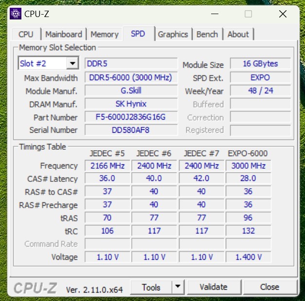 Pamięci działają z taktowaniem 6000 MHz, co jest optymalną wartością dla procesorów na AM5. Ich ogromną zaletą są opóźnienia wynoszące CL 28-36-36-96-132. W szczególności ten pierwszy jest trochę niższy od standardowych 30 oferowanych przez prawie wszystkie zestawy na rynku. Pojemność kości to 2x 16 GB. Na stronie firmy znajdziemy też zestawy 2x 32 GB, ale mają one taktowanie 5600 MHz i nie mają EXPO tylko XMP.