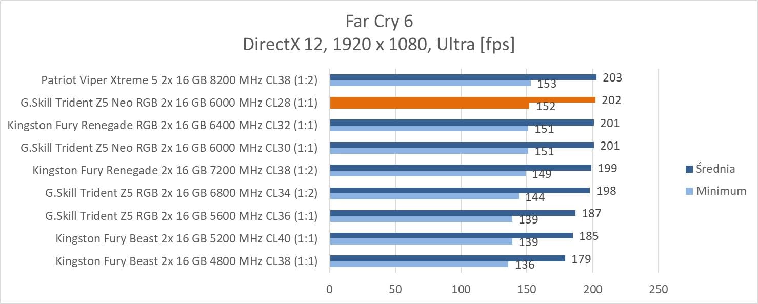 G.Skill Trident Z5 Neo RGB 2x 16 GB 6000 MHz CL28 ciężko dostać w polskich sklepach – bardziej dostępne są modele 5600 MHz CL28 oraz wersja Royal. Natomiast są to z pewnością kości warte polecenia. Oprócz naprawdę fajnej wydajności i bezproblemowego działania na platformie AM5 oferują one też dobre wykonane czy podświetlenie. Jeśli więc szukacie jednych z najlepszych kości pod procesory AMD to warto poszukać i zainwestować w testowane moduły.
