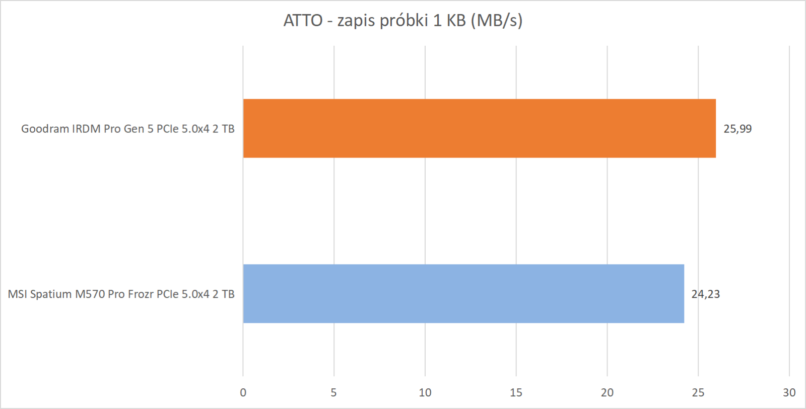 Syntetyczne testy pozwalają nam ocenić względnie możliwości danego dysku i według pomiarów wykonanych w Crystal Disk Mark 8 oraz ATTO Disc Benchmark, dysk IRDM Pro Gen 5 spisuje się fenomenalnie w odczycie, ale w zapisie losowych próbek już niespecjalnie.