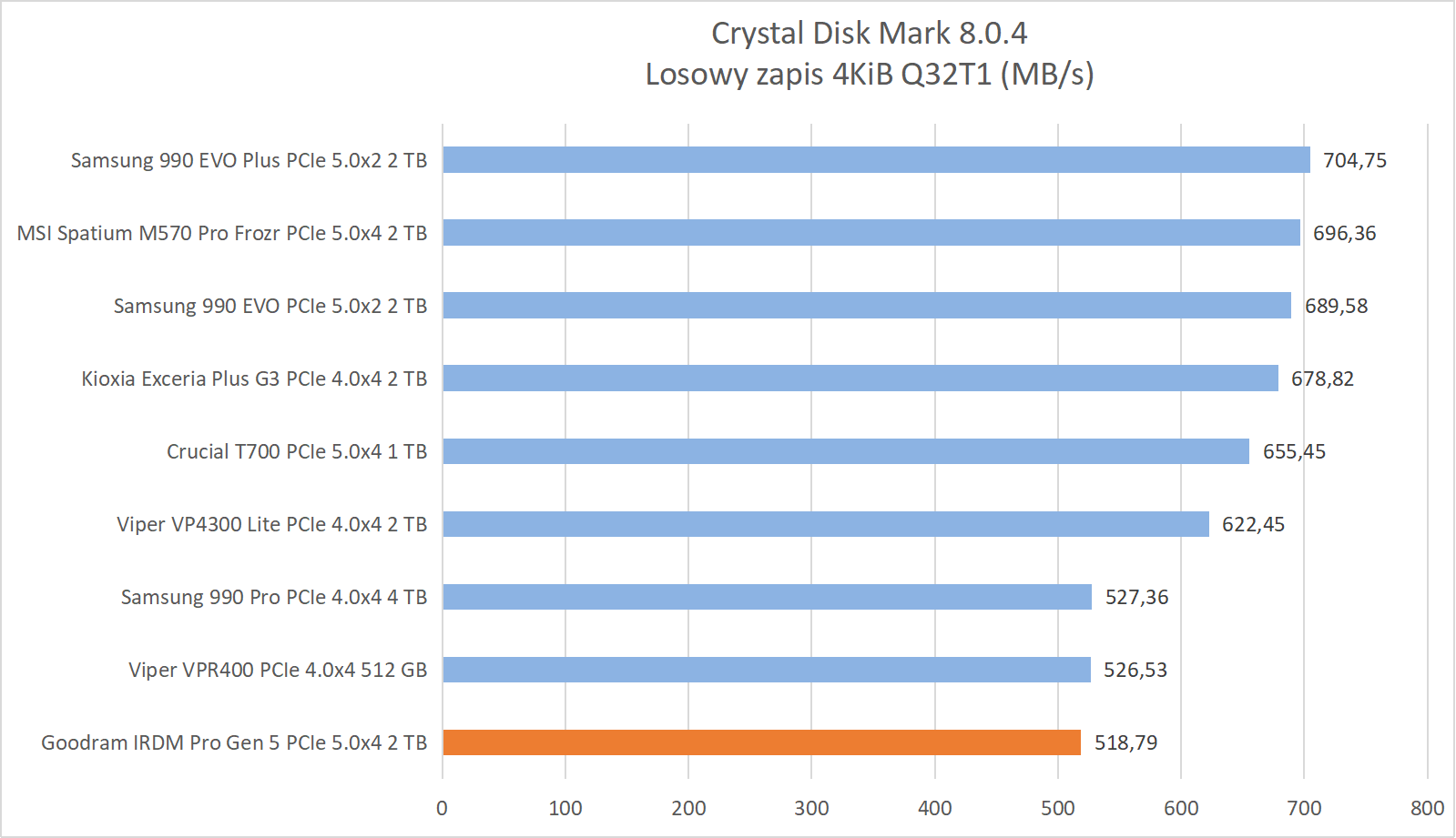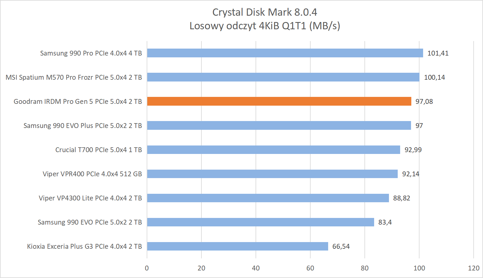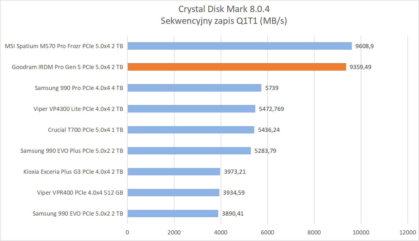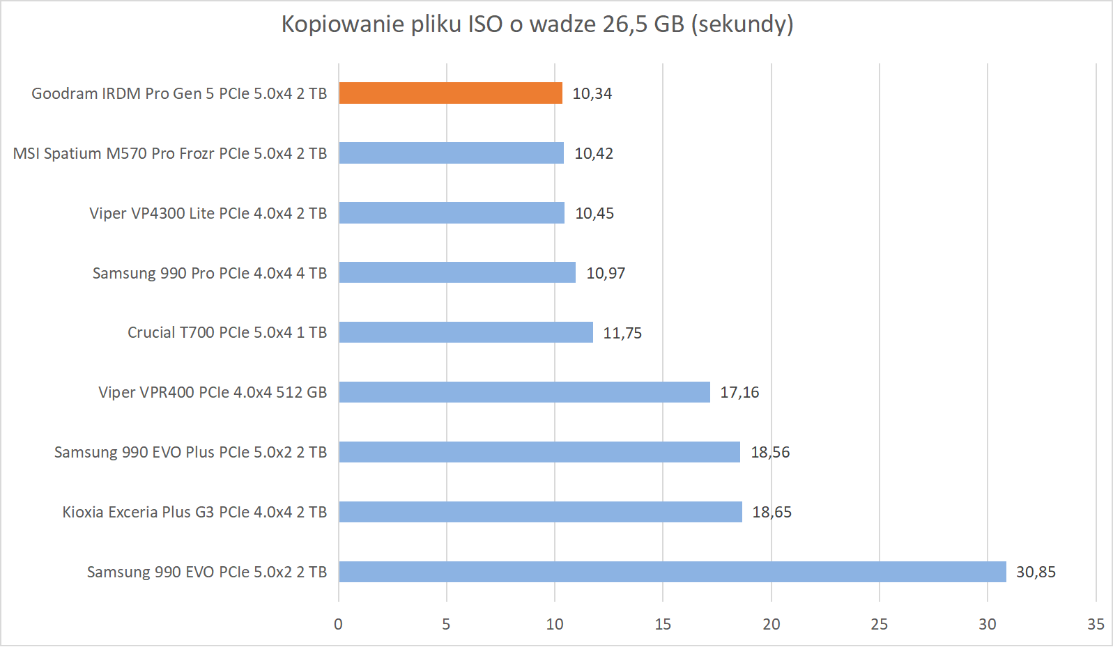 IRDM Pro Gen 5 radzi sobie nie tylko w benchmarkach, ale też praktycznych testach. Najwięcej mówi nam tutaj wydajność przy kopiowaniu ponad 100-GB paczki plików różnego rodzaju. W tym sprawdzianie tylko najbardziej zaawansowany dysk MSI wygrywa i to najpewniej przez znacznie lepsze chłodzenie fabryczne.