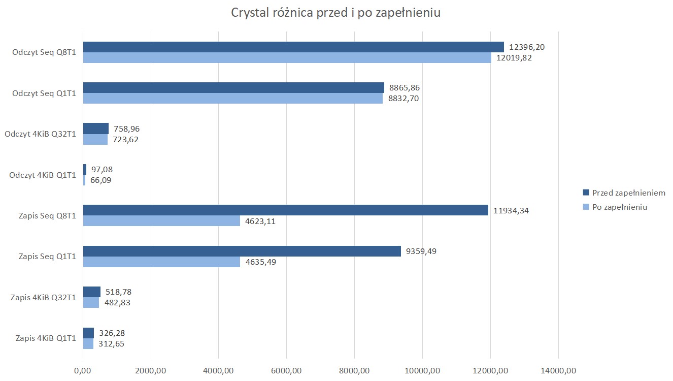 Zauważalny spadek wydajności odczytu i druzgocący spadek wydajności zapisu. IRDM Pro Gen 5 to jeden z tych dysków, którego nie chcecie zapełniać pod sam kurek, bo poniższa wydajność potwierdza, że okolice 95-procentowego zapełnienia nie są zbyt bezpieczne dla wydajności.
