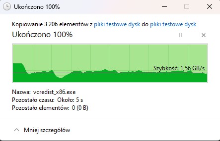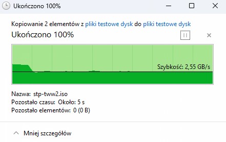Oczywiście temperatury stają się problemem tylko i wyłącznie pod znacznym obciążeniem, czyli np. podczas pracowania w przepastnych projektach, kopiowania ogromnej ilości plików, czy zrobienia z jednego dysku “nośnika do wszystkiego”, gdzie trzymamy system, aplikacje działające w tle oraz gry. W przypadku ot odpalenia gry na PlayStation 5 czy typowej biurowej pracy, nie musicie obawiać się zjawiska przegrzewania. Jeśli jednak macie zamiar wykorzystywać ten dysk w ponadprzeciętnym stopniu, to musicie przygotować się na inwestycję w dedykowane chłodzenie i to najlepiej aktywne, bo temperatura w połączeniu z przepełniającym się buforem znacznie ogranicza wydajność. Poniżej przykładowo ten duet wydłużył proces kopiowania plików Wiedźmina z 23 do 39 sekund.