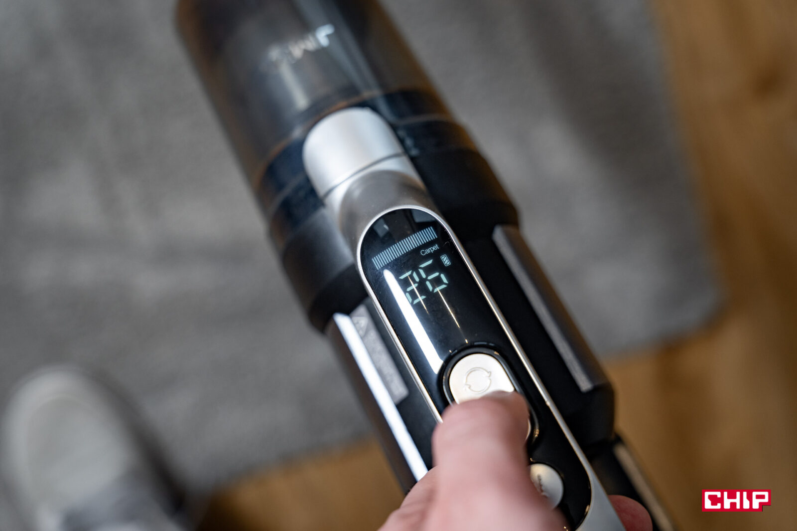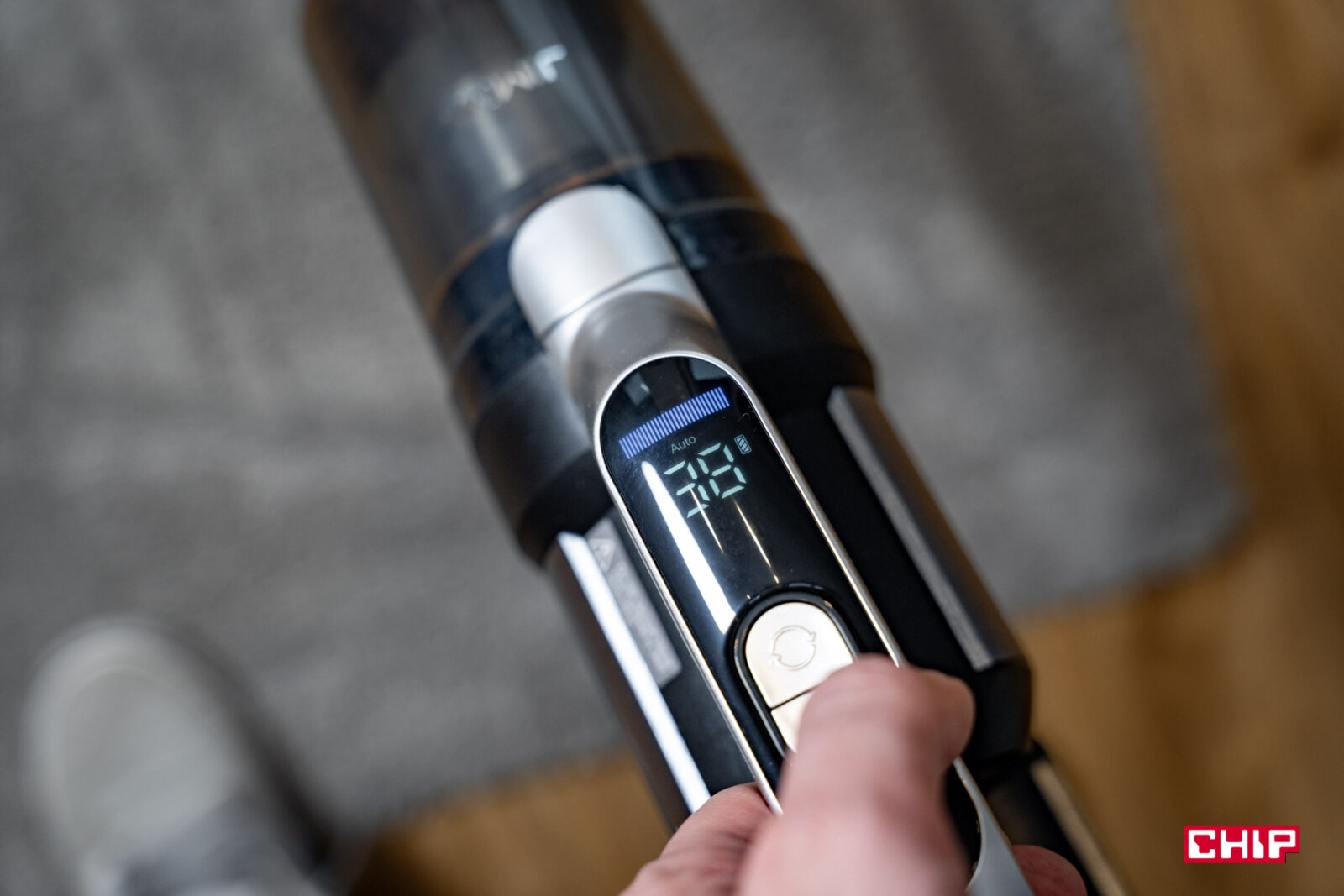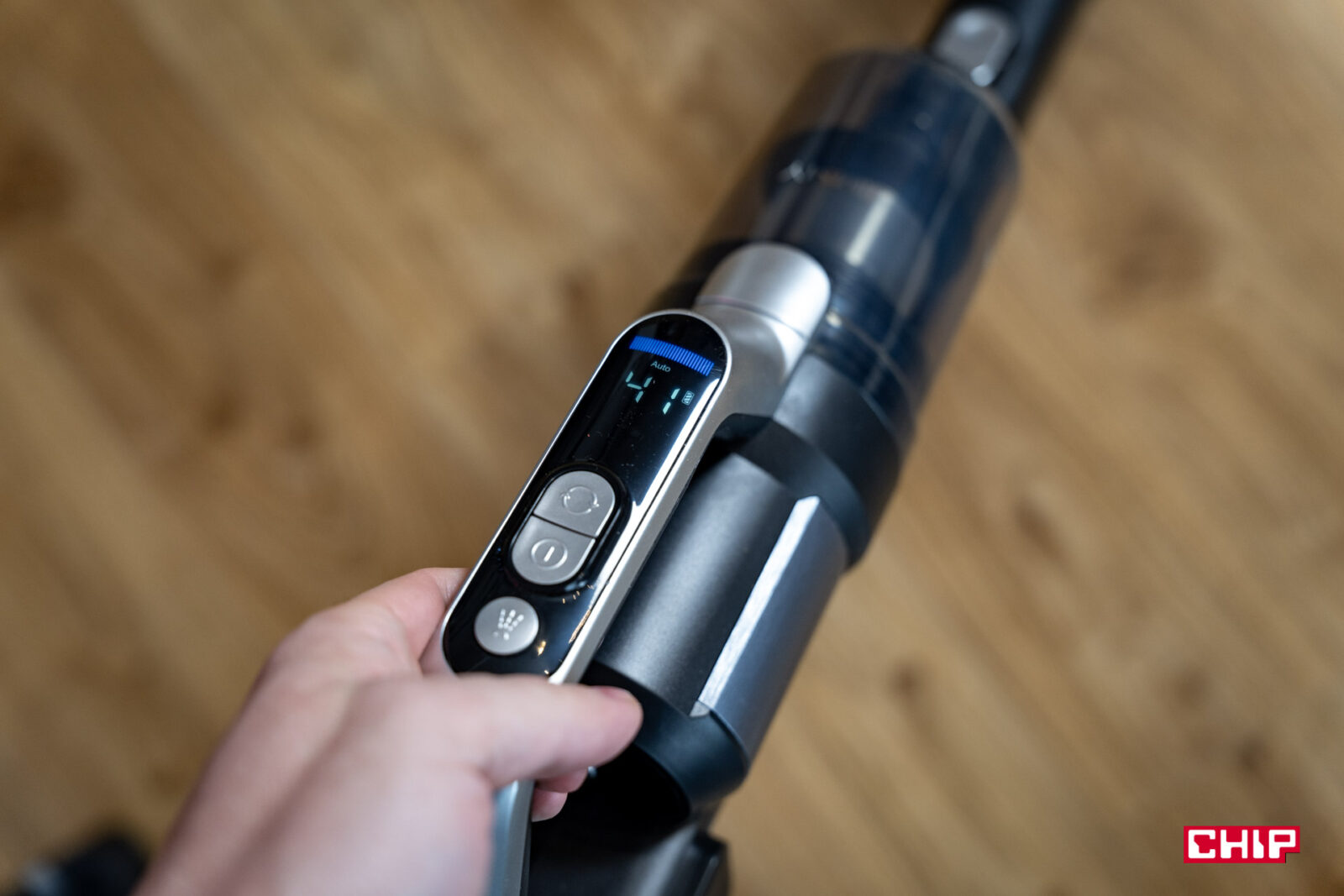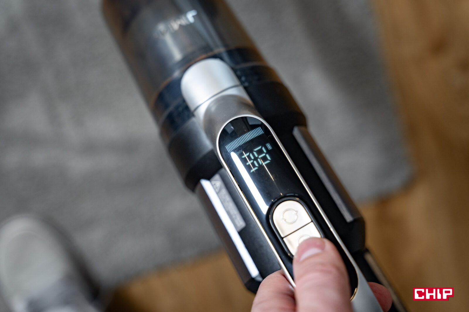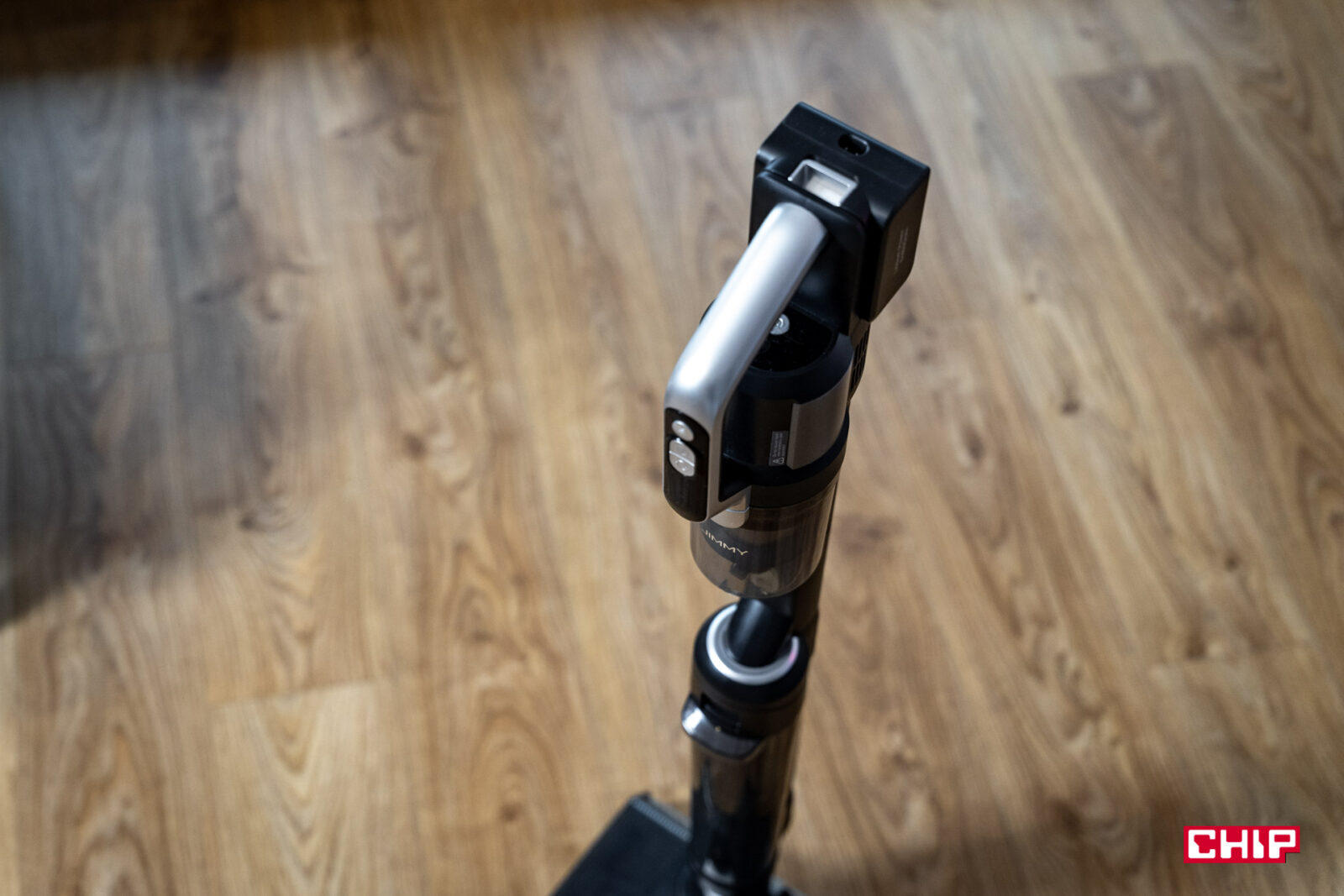 W górnej części znajdziemy pojemnik na zabrudzenia, wyjmowany akumulator i przyciski sterujące wraz z prostym, ale sporym i bardzo czytelnym wyświetlaczem, na którym widzimy stan pracy i naładowania akumulatora. Całość możemy w prosty sposób rozłożyć i umyć, bo wszystko tu, łącznie z silnikiem, jest wodoodporne. W przypadku silnika mówimy o zgodności z normą IPX8.