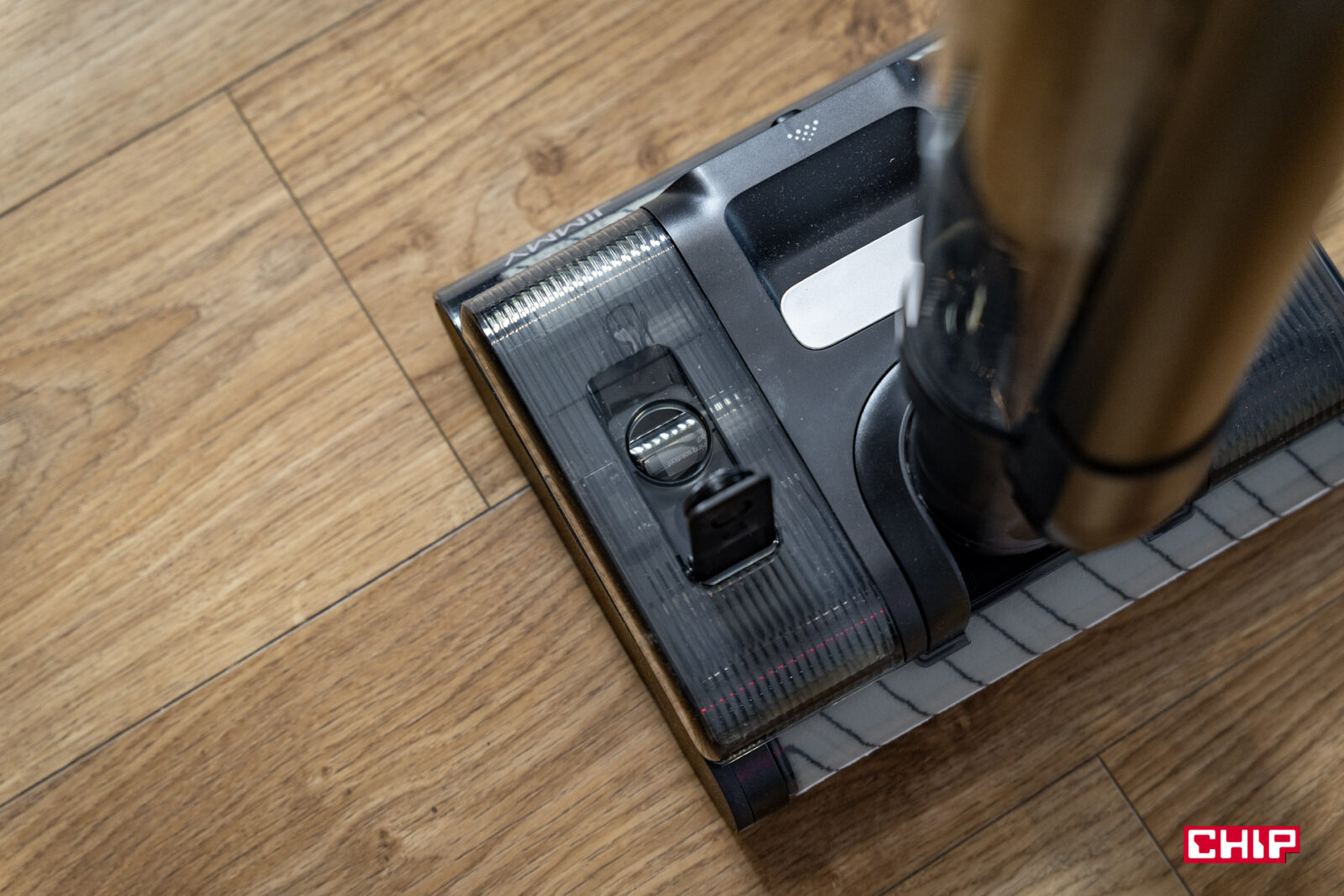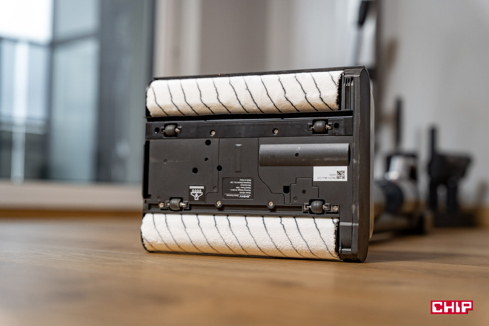Końcówka mopująca w Jimmy PW11 Pro Max wygląda poważnie i jest równie poważnym zawodnikiem. Składa się z dwóch miękkich rolek, nad którymi znajduje się zbiornik na czystą wodę. Tutaj też możemy dolać znajdujący się w zestawie detergent. Nieco wyżej, przyczepiony do rury, jest pojemnik, w którym zbierana jest woda brudna.