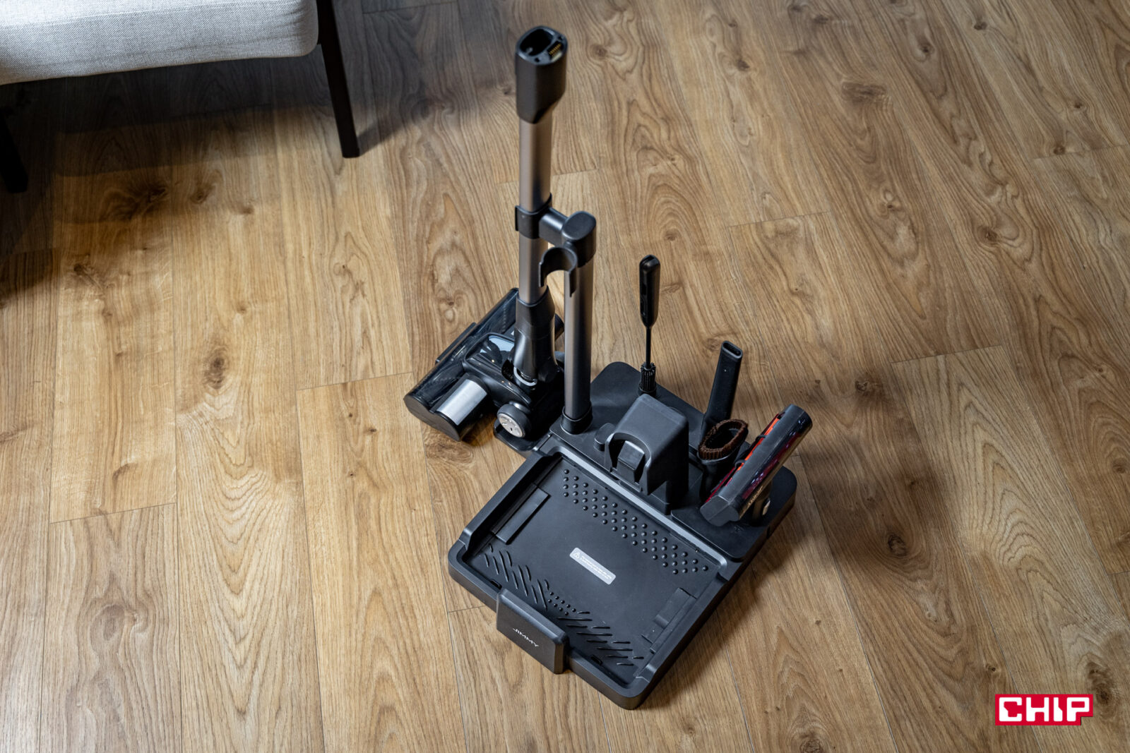 Możliwość złożenia wszystkich akcesoriów razem i umieszczenia ich na stojaku to duże udogodnienie, ale niekoniecznie może to wyglądać estetycznie i raczej nie każdy chciałby mieć taki widok np. w salonie. Więc pierwszy plus za to, że akcesoria możemy łatwo trzymać razem, a drugi, że nie musimy tego robić i nadal mieć praktyczną stojak z funkcją ładowania i czyszczenia mopa. Bo to właśnie z jego użyciem najłatwiej jest ładować akumulator oraz czyścić końcówkę.