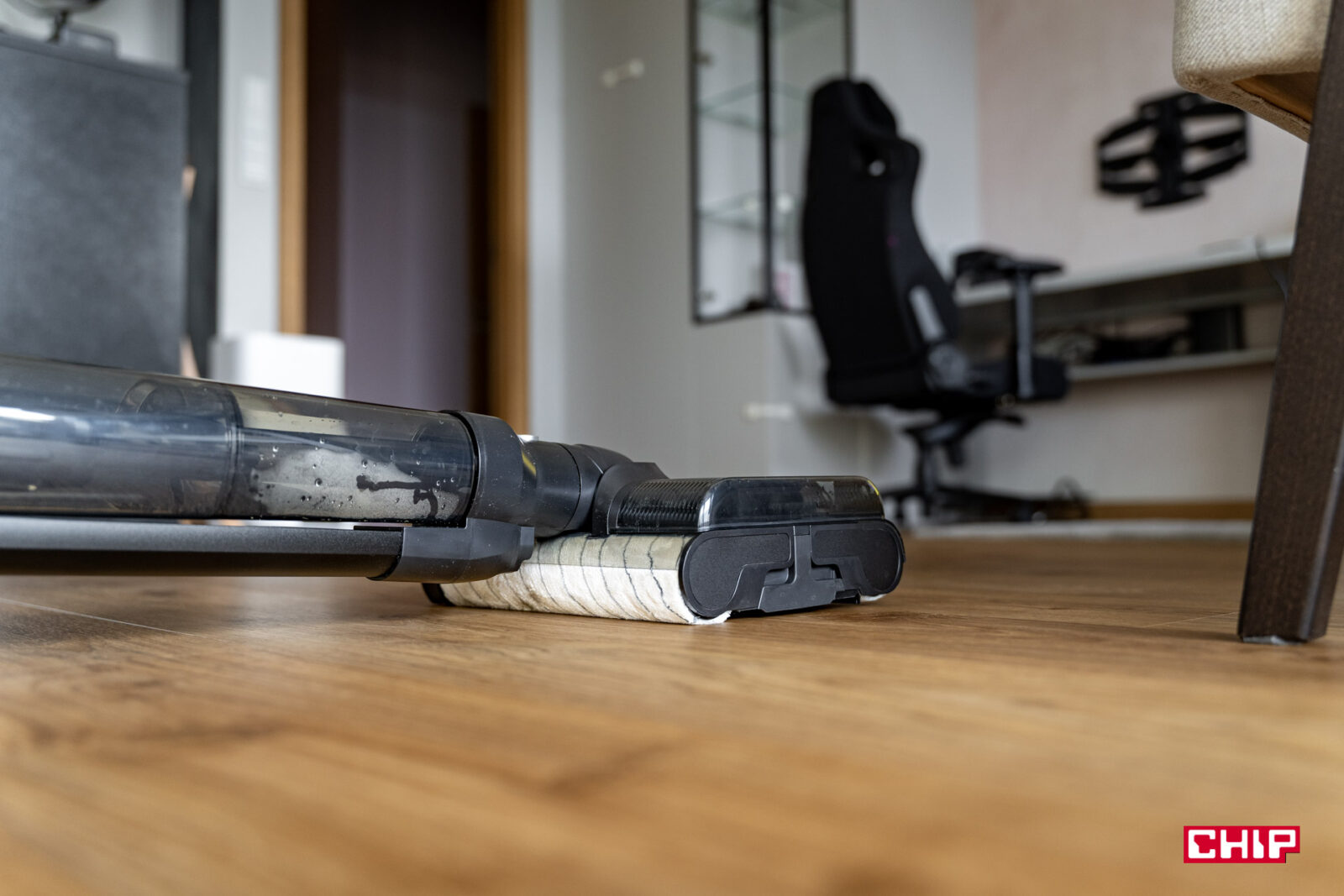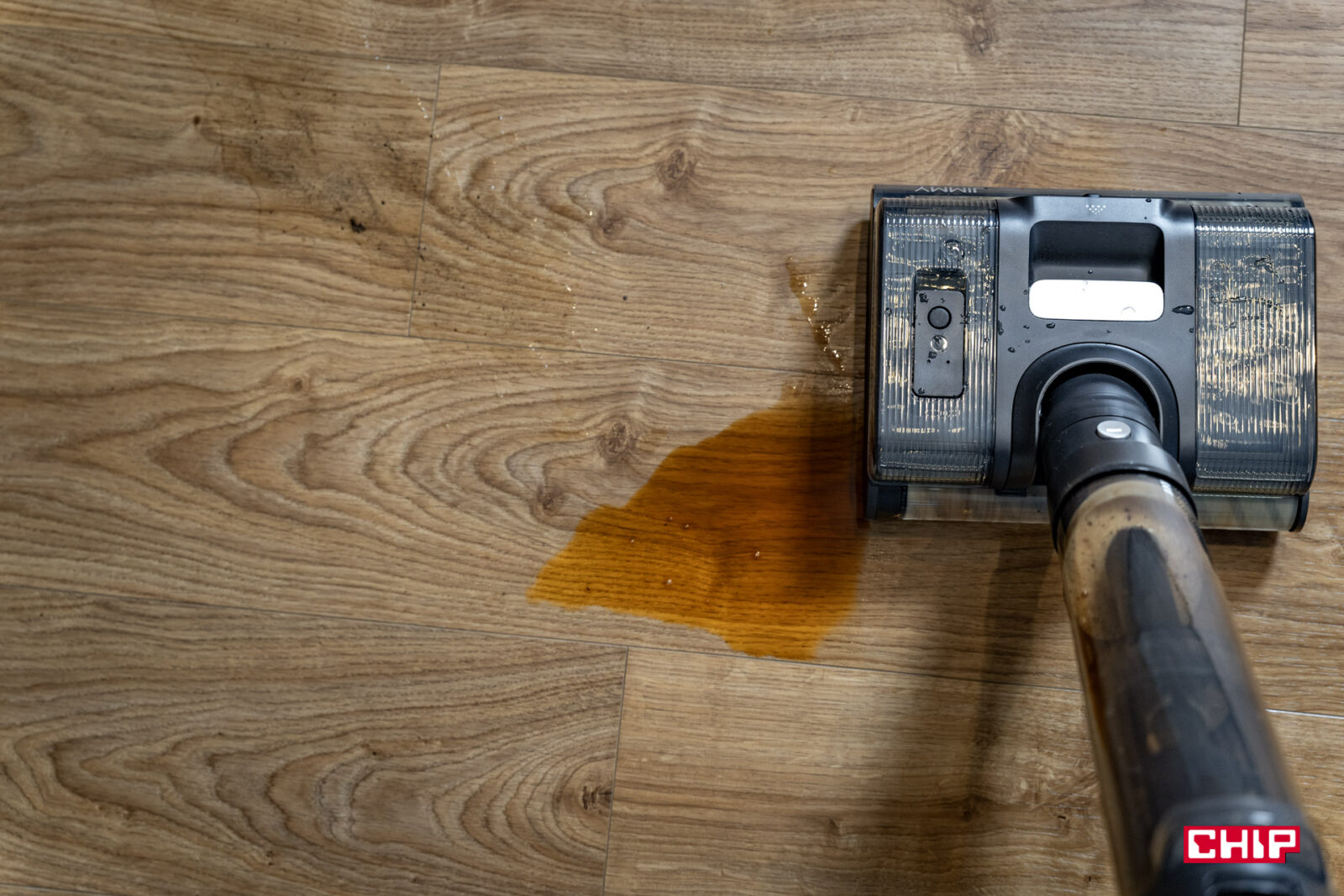 Również zupełnym przypadkiem i tego kompletnie nie planowałem, na podłogę wylałem dosyć sporo wody. Jimmy PW11 Pro Max pozwolił mi się jej pozbyć. Częściowo wykorzystał ją do wyczyszczenia podłogi, a nadmiar zassał do pojemnika na brudną wodę. Świetna sprawa!