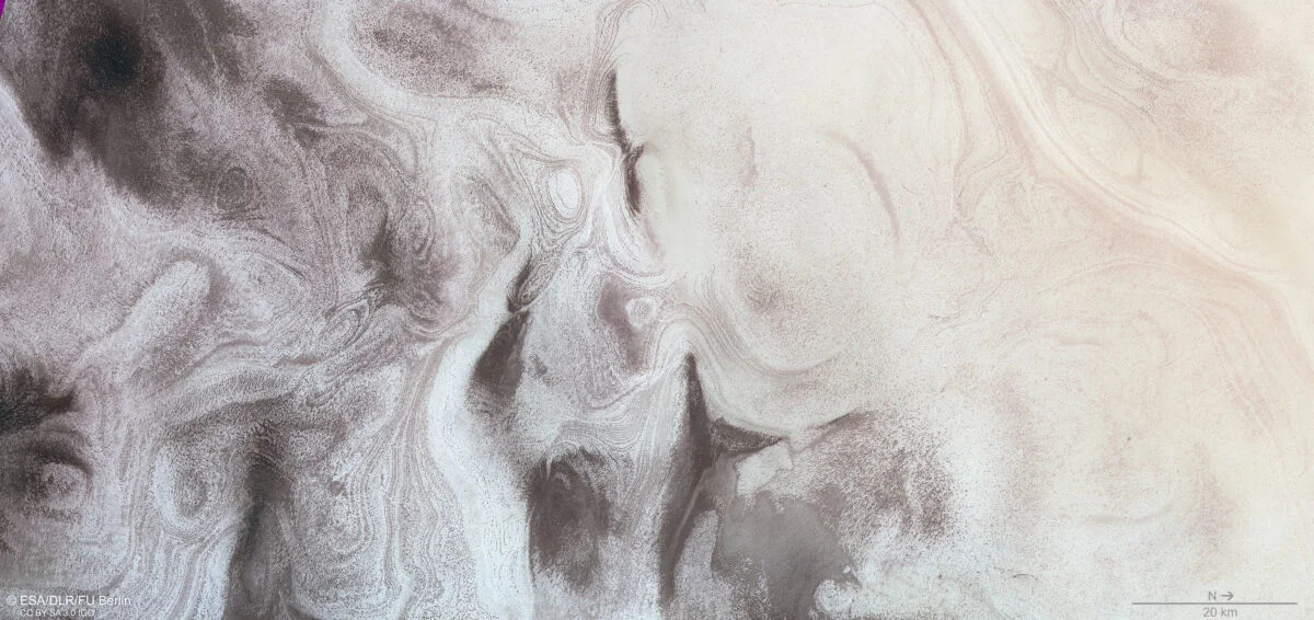 Zanim kluczowe odpowiedzi się pojawią, pozostaje nam podziwianie zdjęć takich jak zamieszczone tutaj. Obraz ukazuje marsjański region Australe Scopuli, który został uwieczniony za pośrednictwem instrumentu HRSC. Zdjęcie zostało zrobione w czerwcu 2022 roku i pokazuje przejście od zimy do lata. Oczywiście pory roku na Czerwonej Planecie są nieco inne od nam znanych. Wystarczy wspomnieć, iż panujące tam temperatury (w momencie robienia zdjęcia) wynosiły około -125 stopni Celsjusza. Ale kiedy temperatury rosną, lód zaczyna sublimować, bezpośrednio przechodząc do formy gazu.